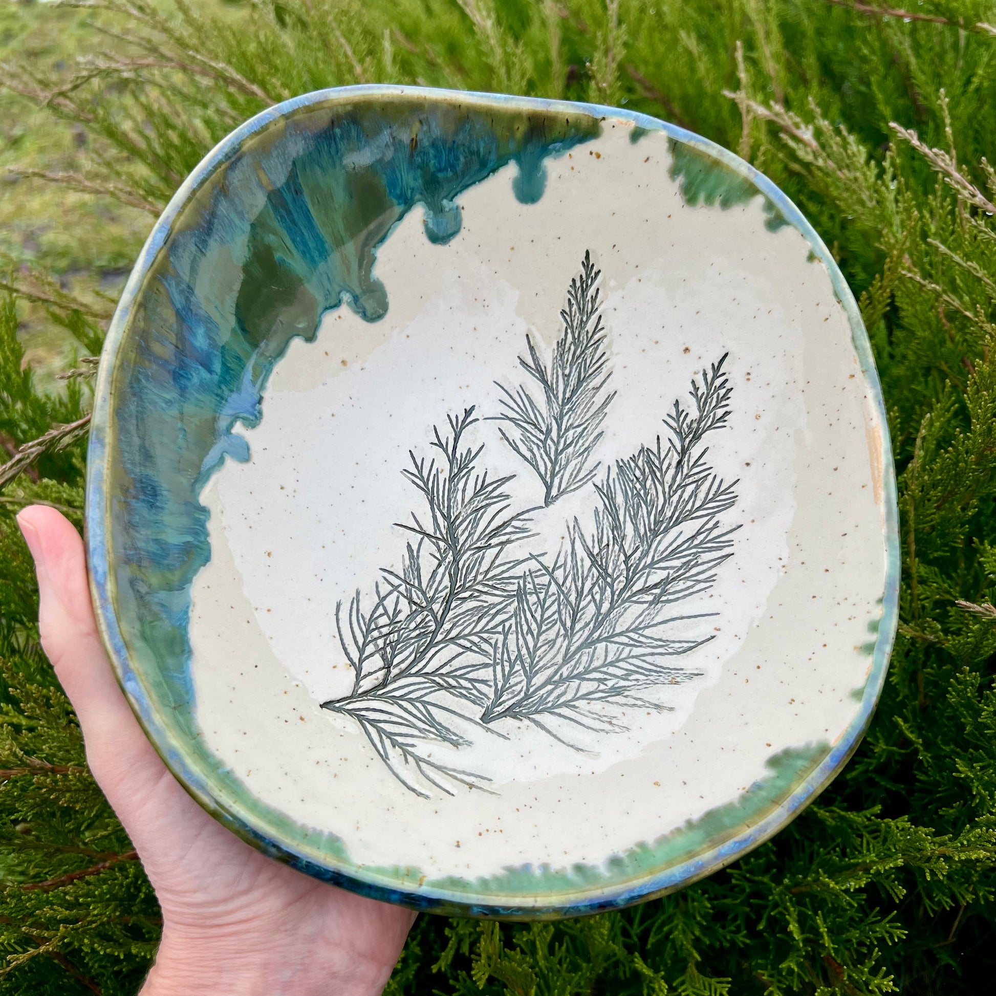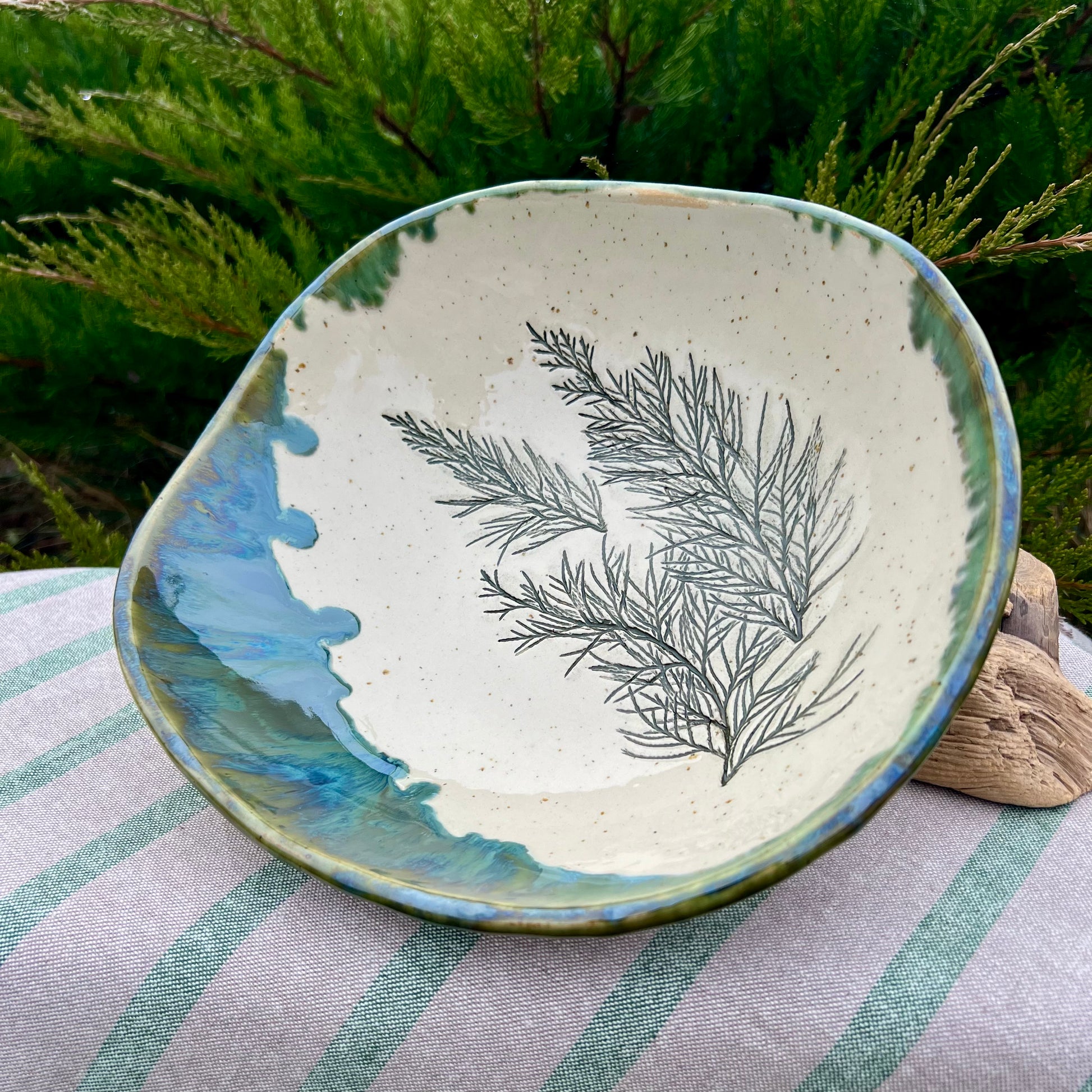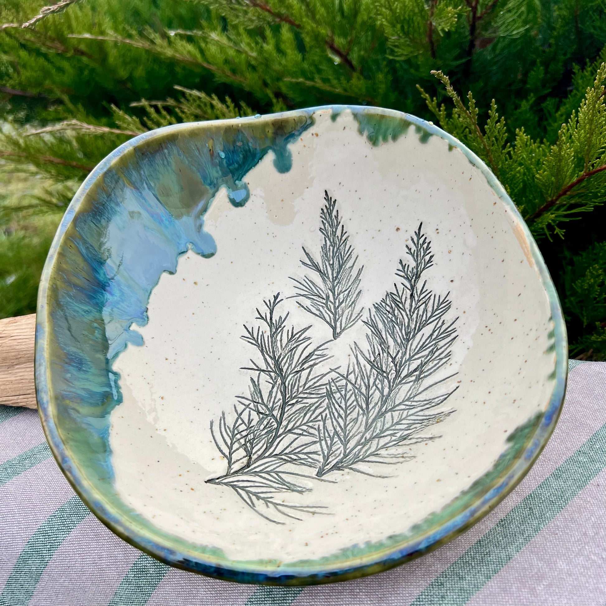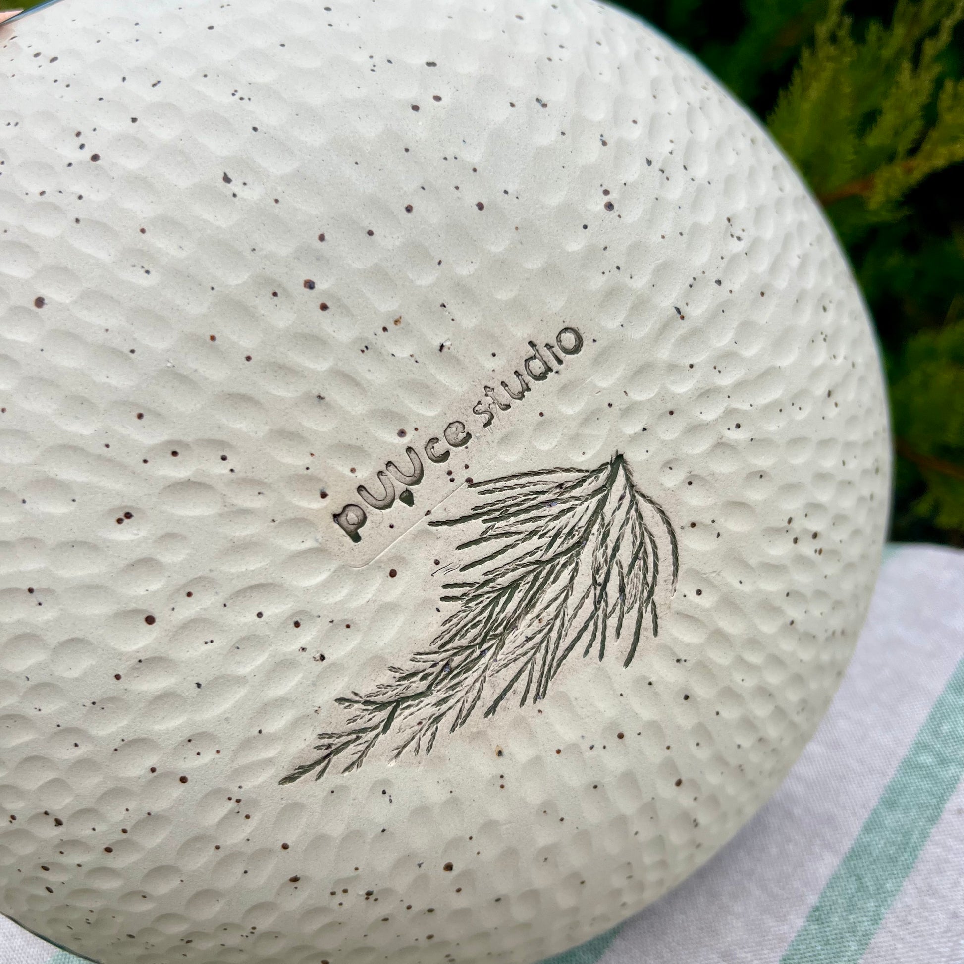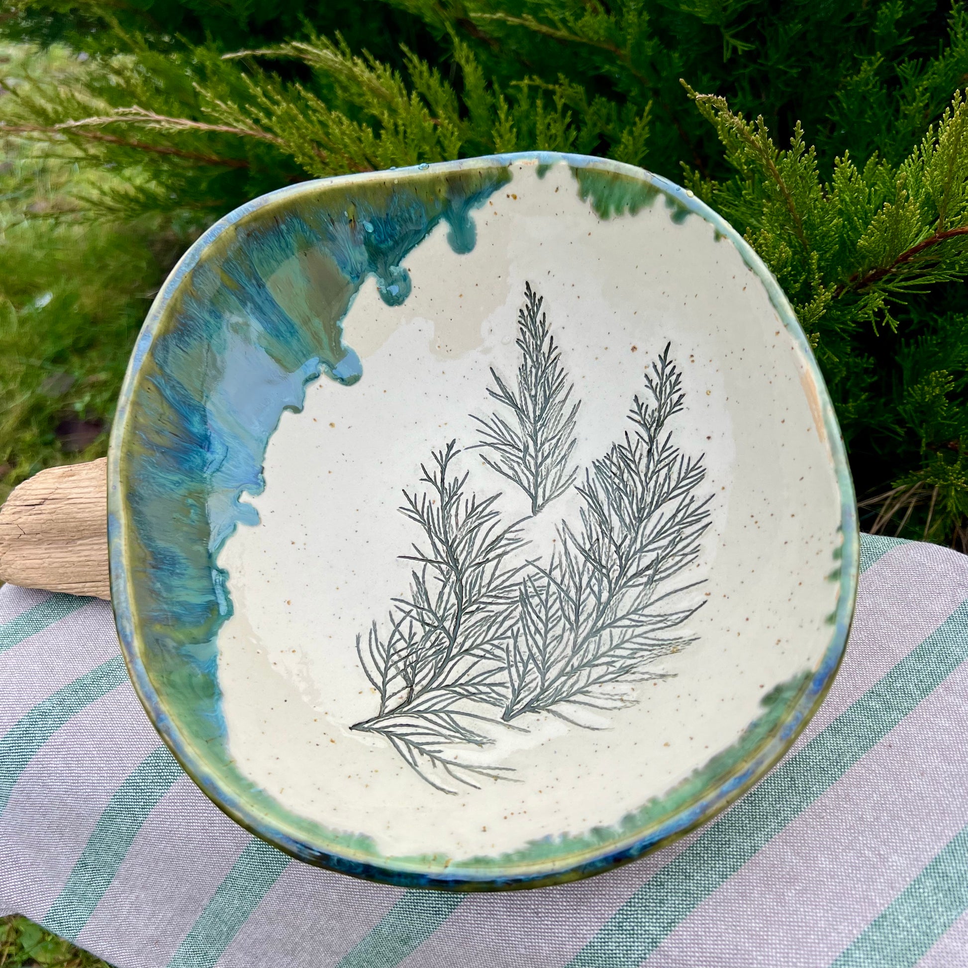 Šīs bļodas unikālais elements ir kadiķa iespiestais motīvs, kas iemūžināts mālā. Šis dabiskais zīmējums piešķir traukam izteiktu lauku šarmu un padara bļodu par unikālu rokdarbu ar dabas faktūru.