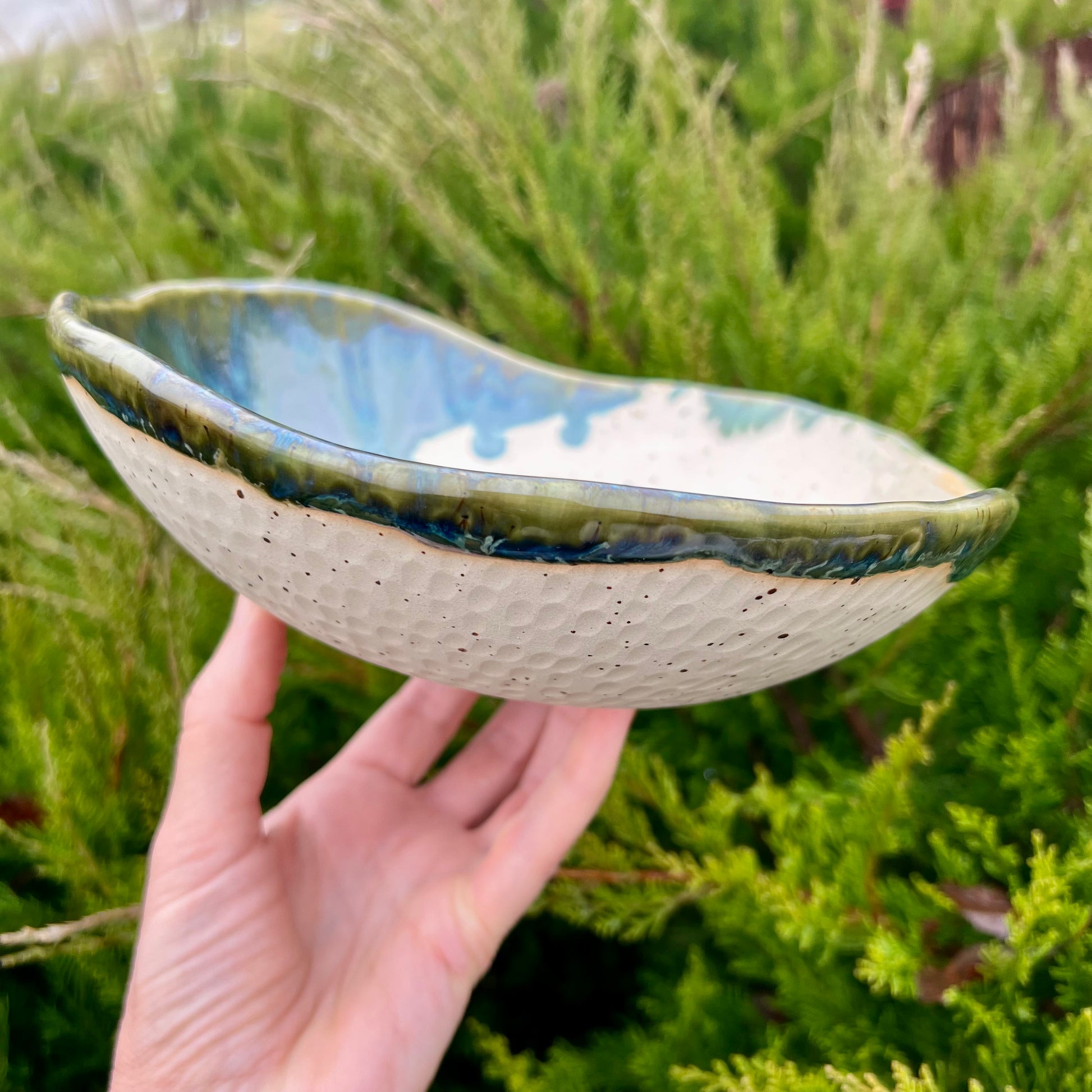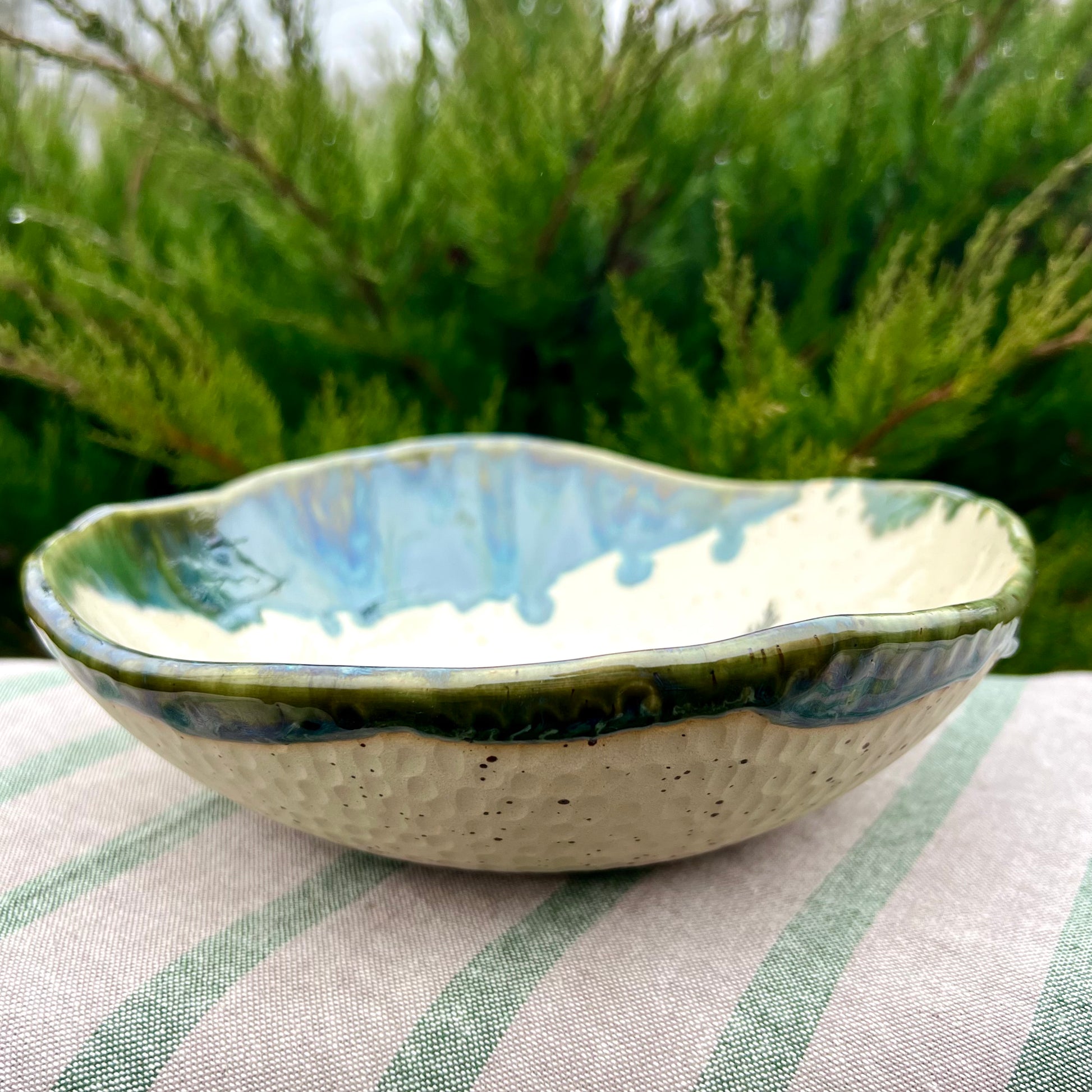 Daudzpusīga, ar rokām darināta bļoda, kas kalpos kā dekoratīvs un funkcionāls servēšanas trauks. Bļoda ir izgatavota no kvalitatīvas raibas akmens masas un pārklāta ar caurspīdīgu un zaļo nokrāsu glazūrām. Droša pārtikai.