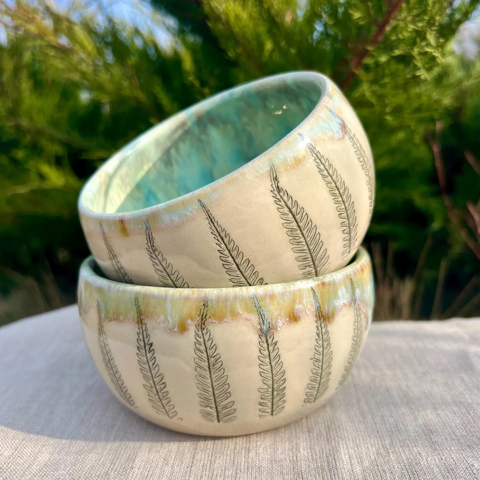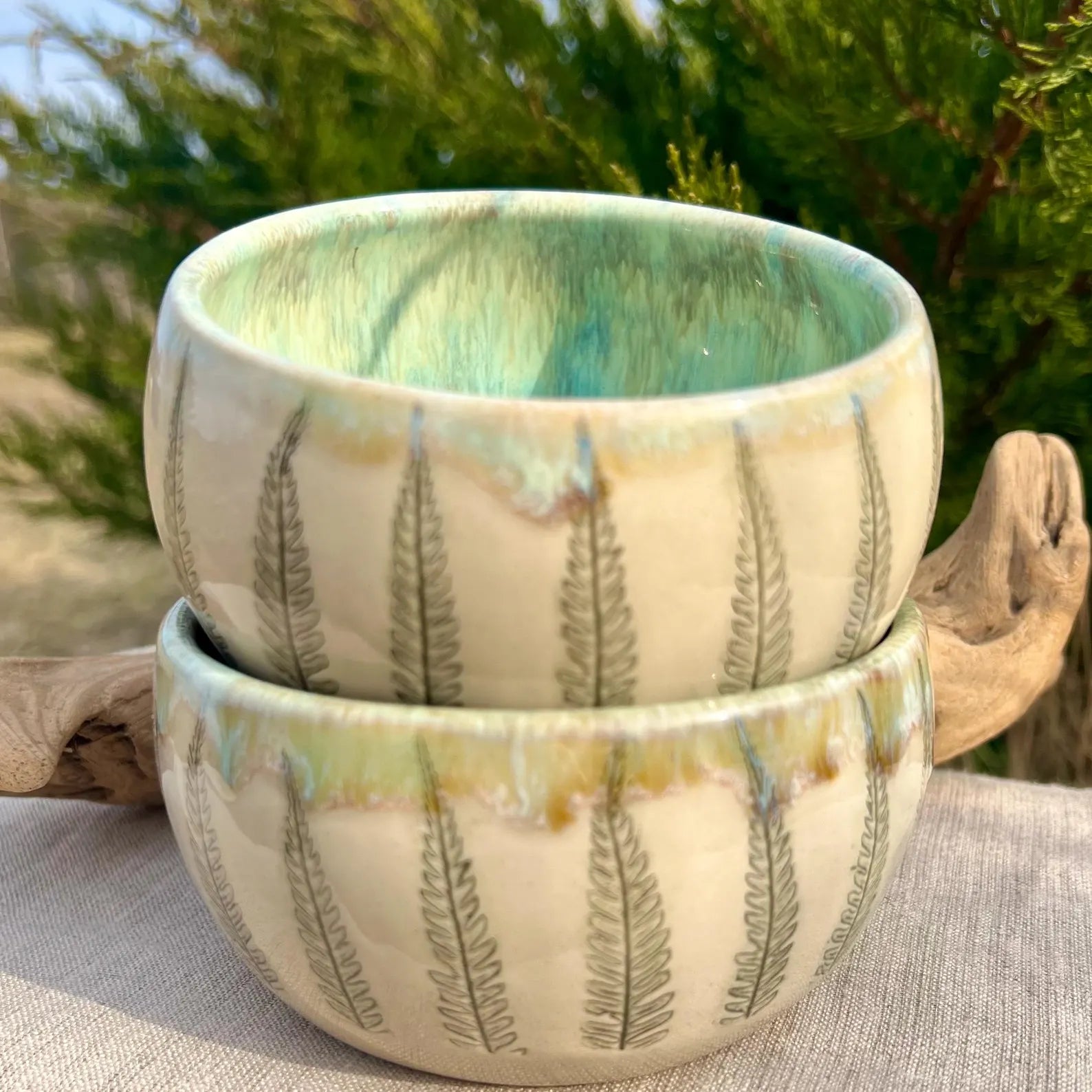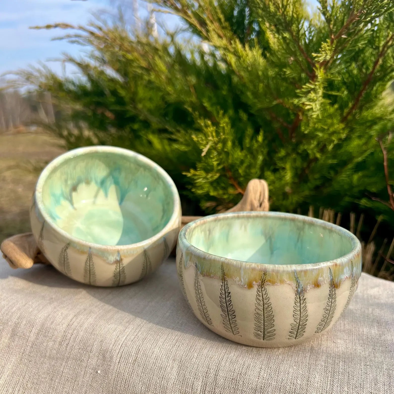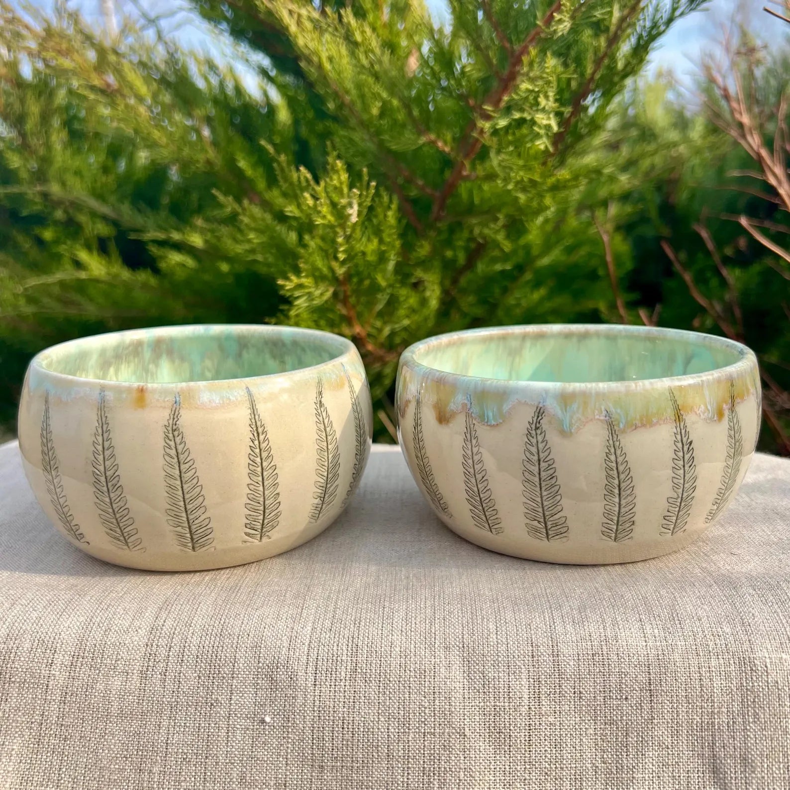 Keramikas brokastu bļodiņas ar papardīšu lapiņām un gaiši zaļu glazējumu.