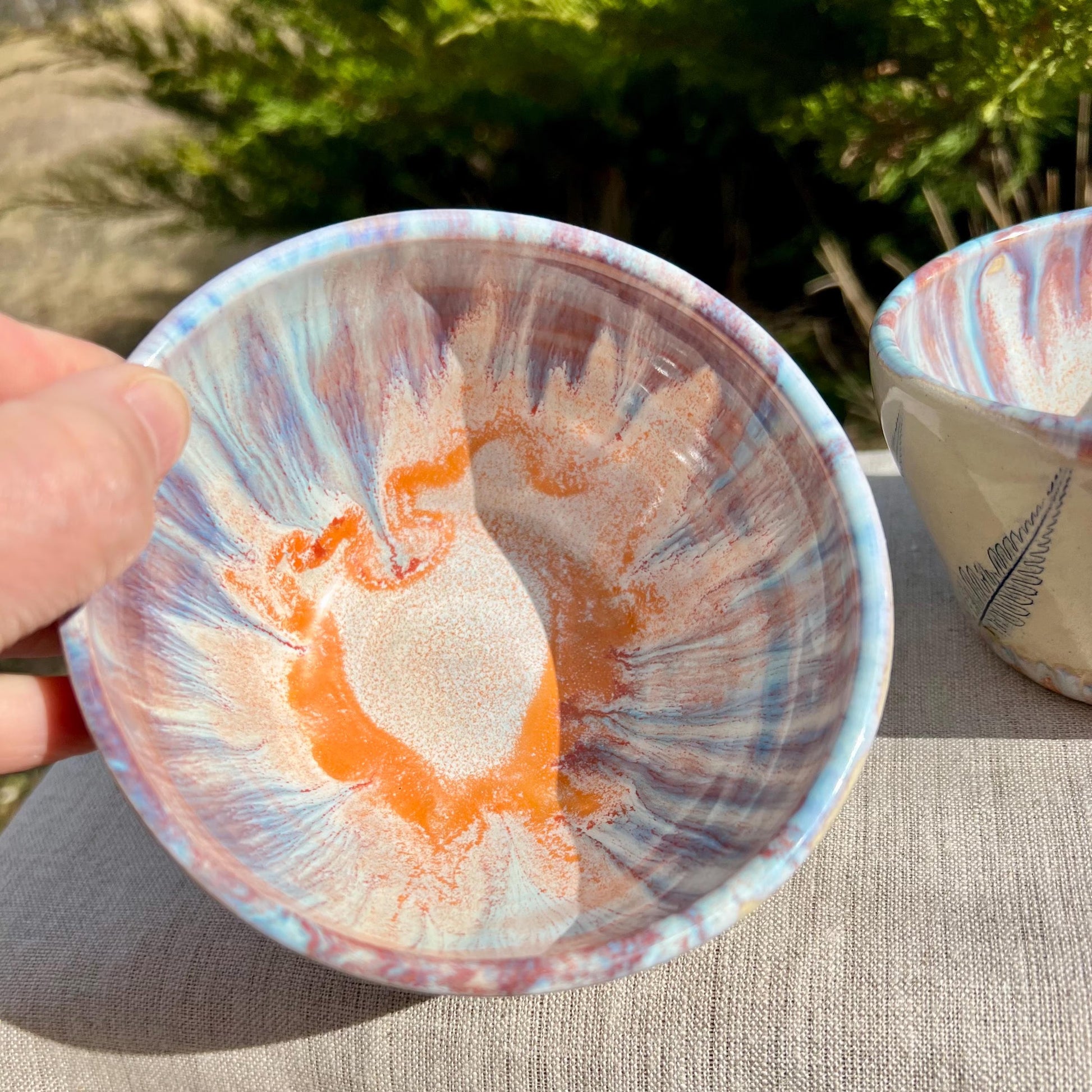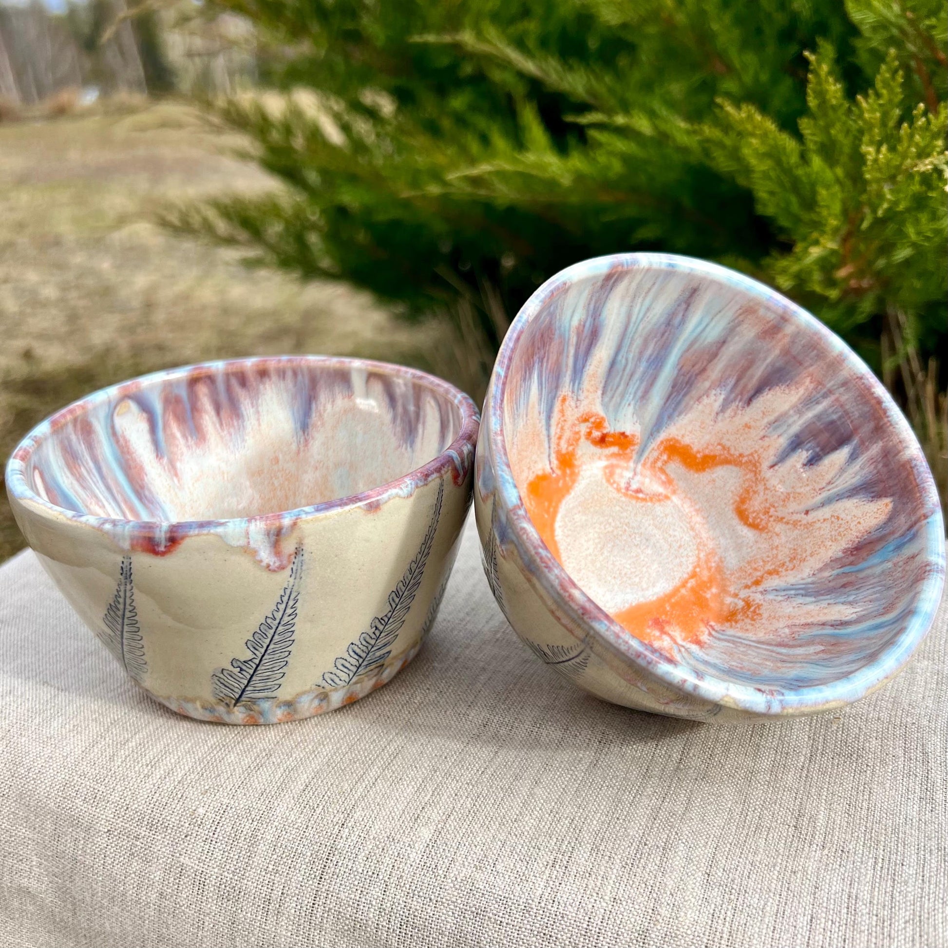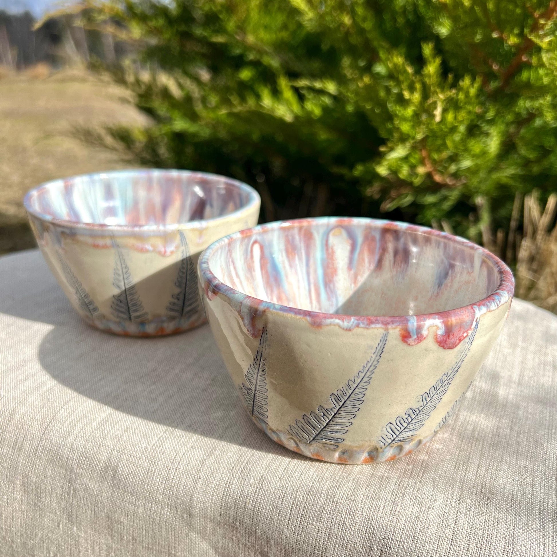 Keramikas uzkodu bļodiņas ar zilām papardes lapiņām un raibu glazējumu.