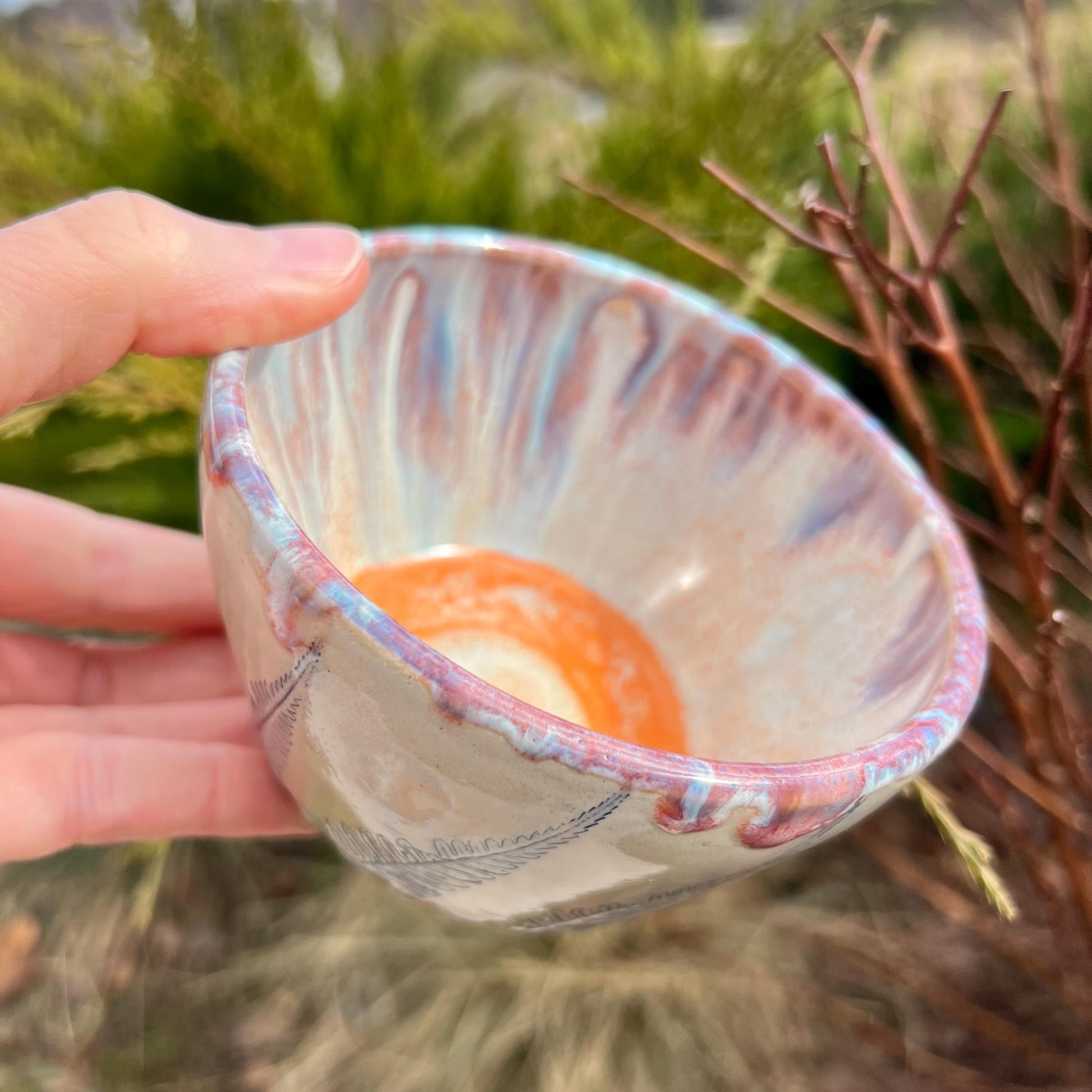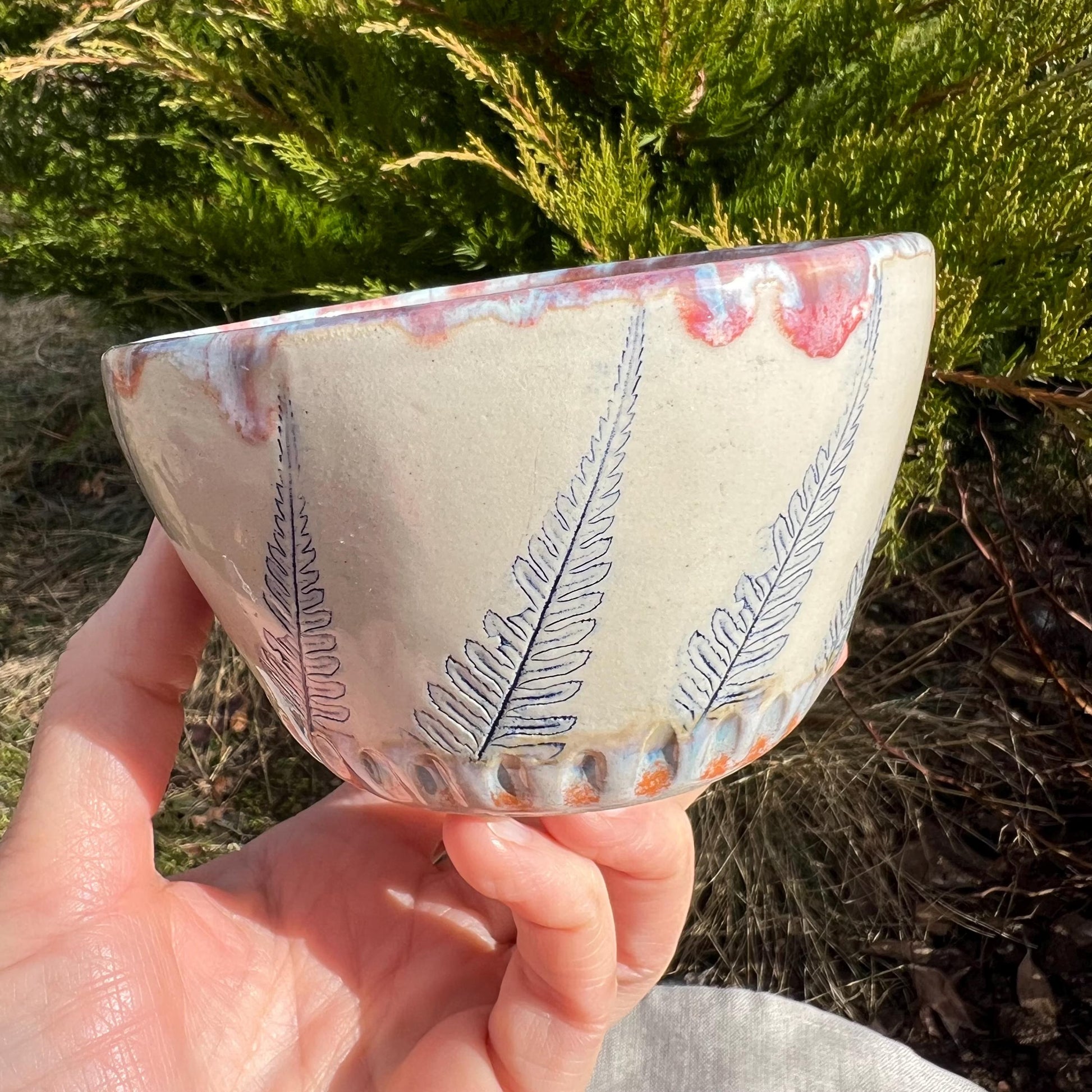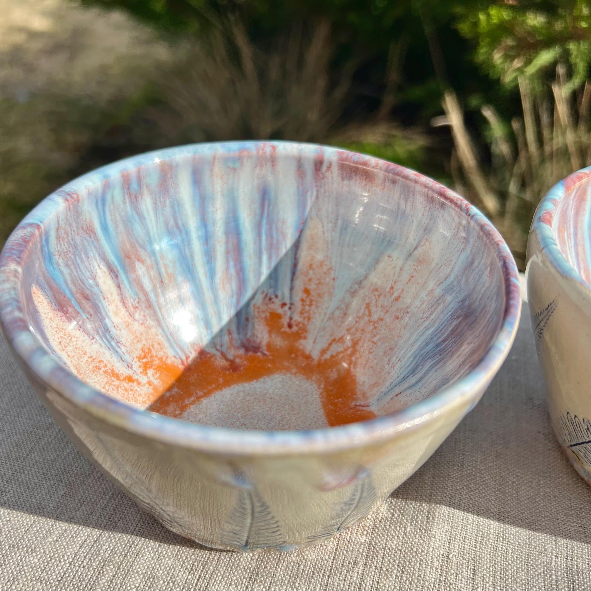 Keramikas uzkodu bļodiņas ar zilām papardes lapiņām un raibu glazējumu.