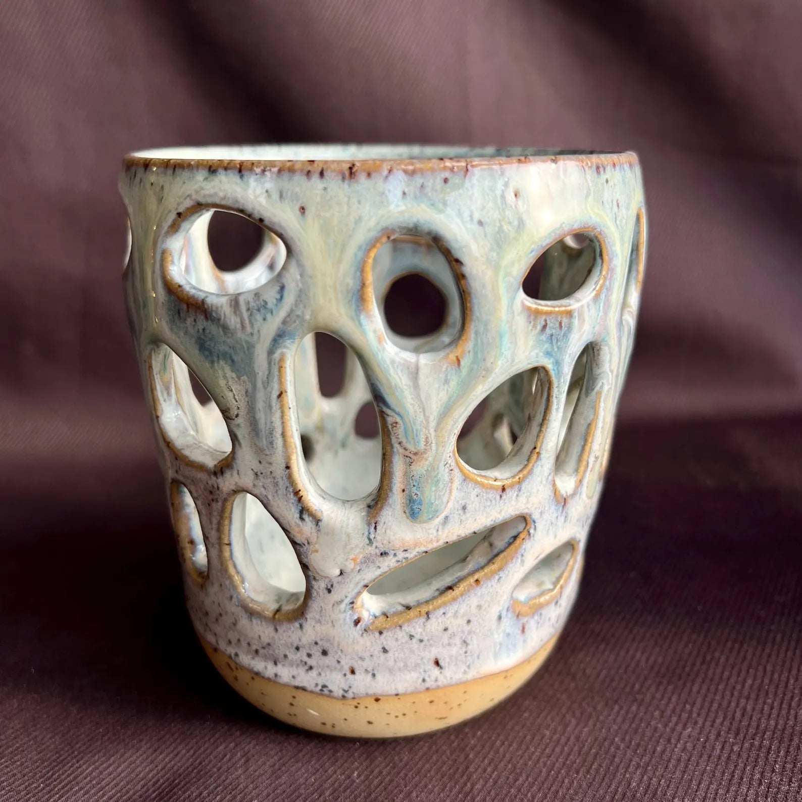 Šis trauks ir izgatavots no akmens masas, izgrebts un pārklāts ar gaišām, plūstošām glazūrām.
