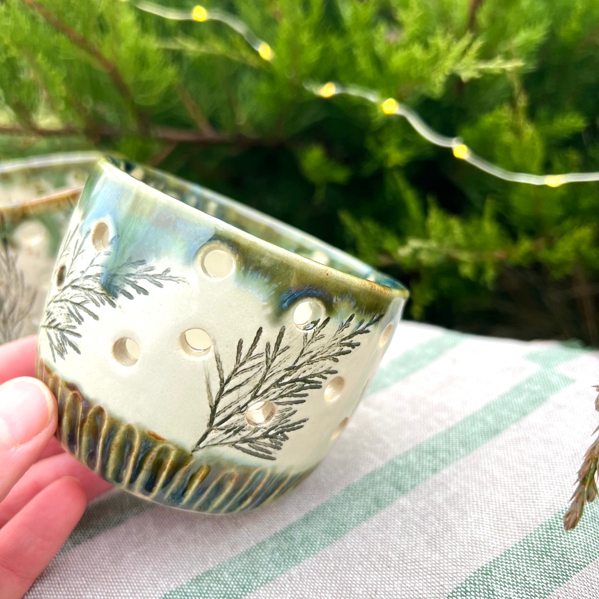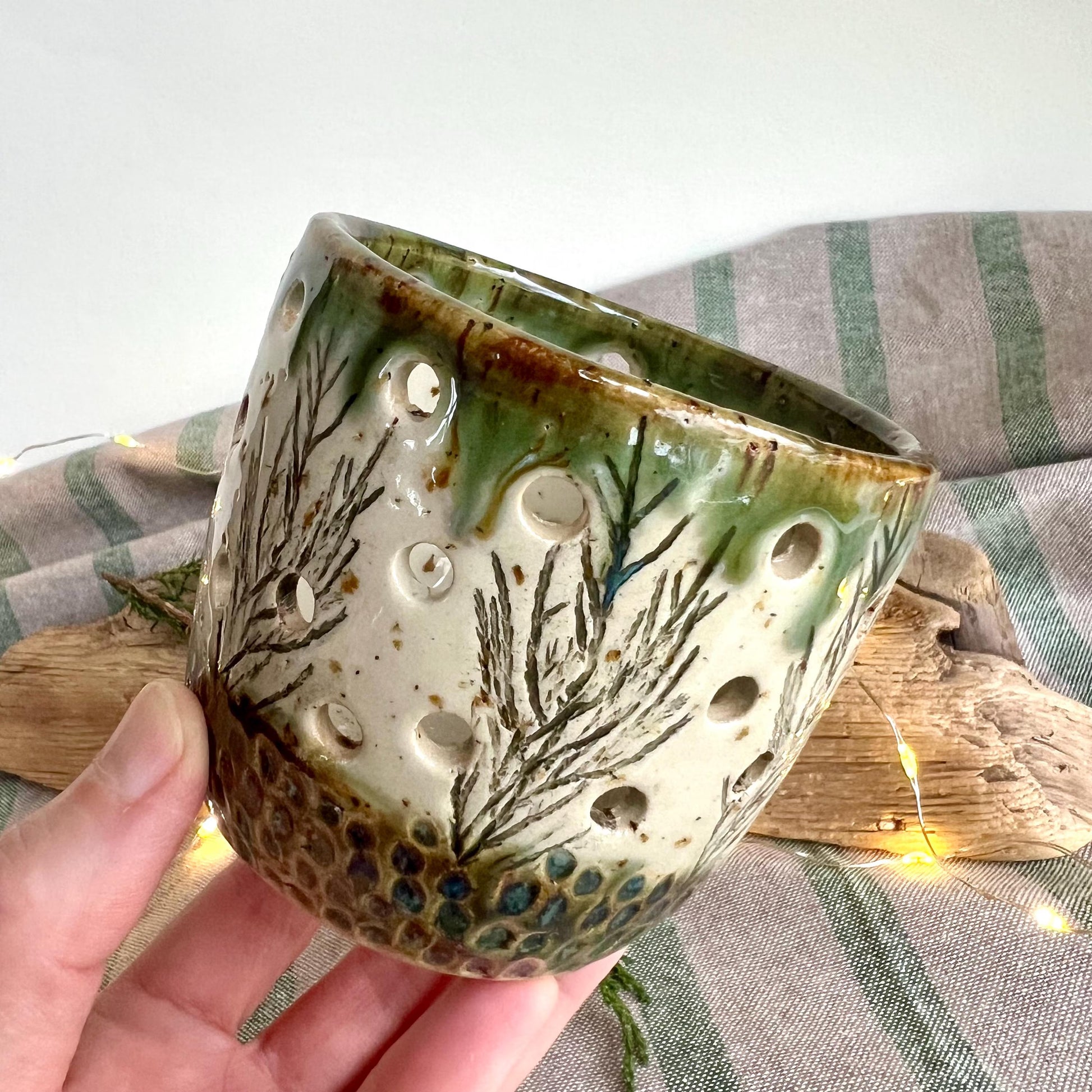 Šis trauks ir izgatavots no akmens masas, izgrebts un atspiesti kadiķa zariņi.