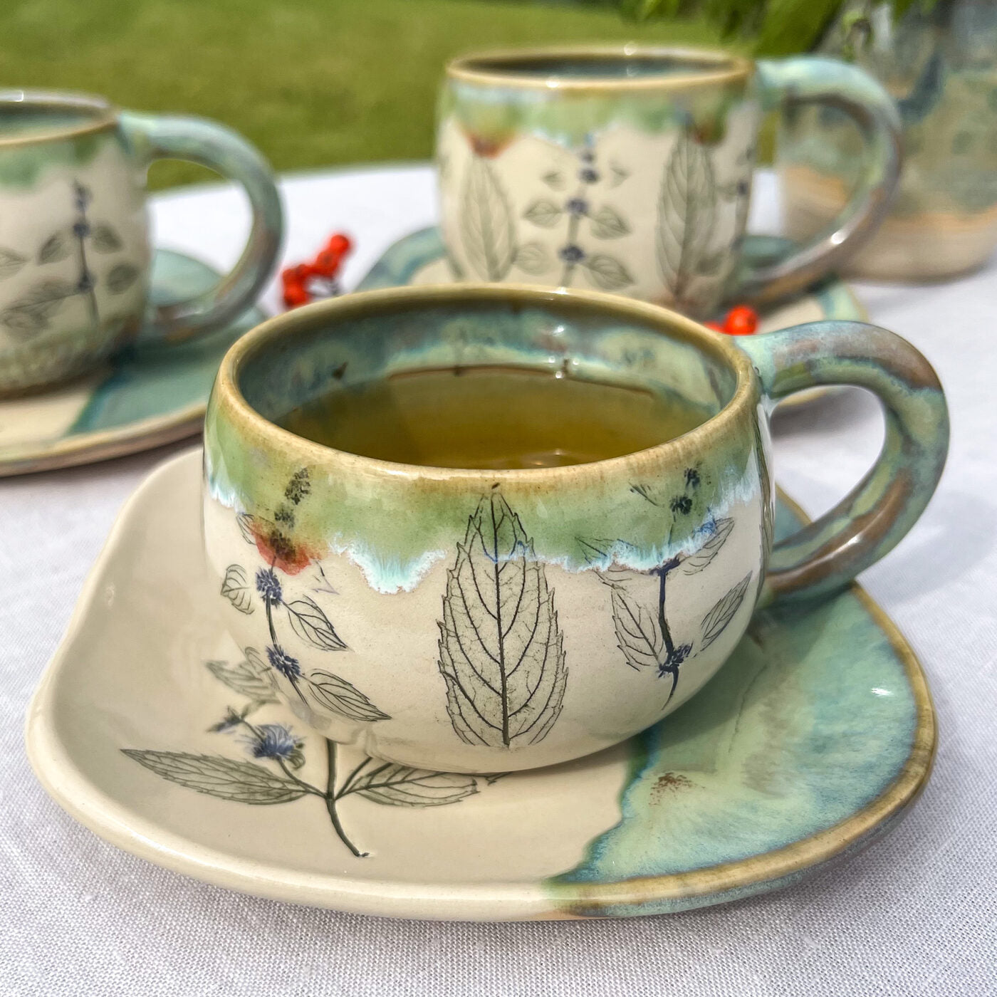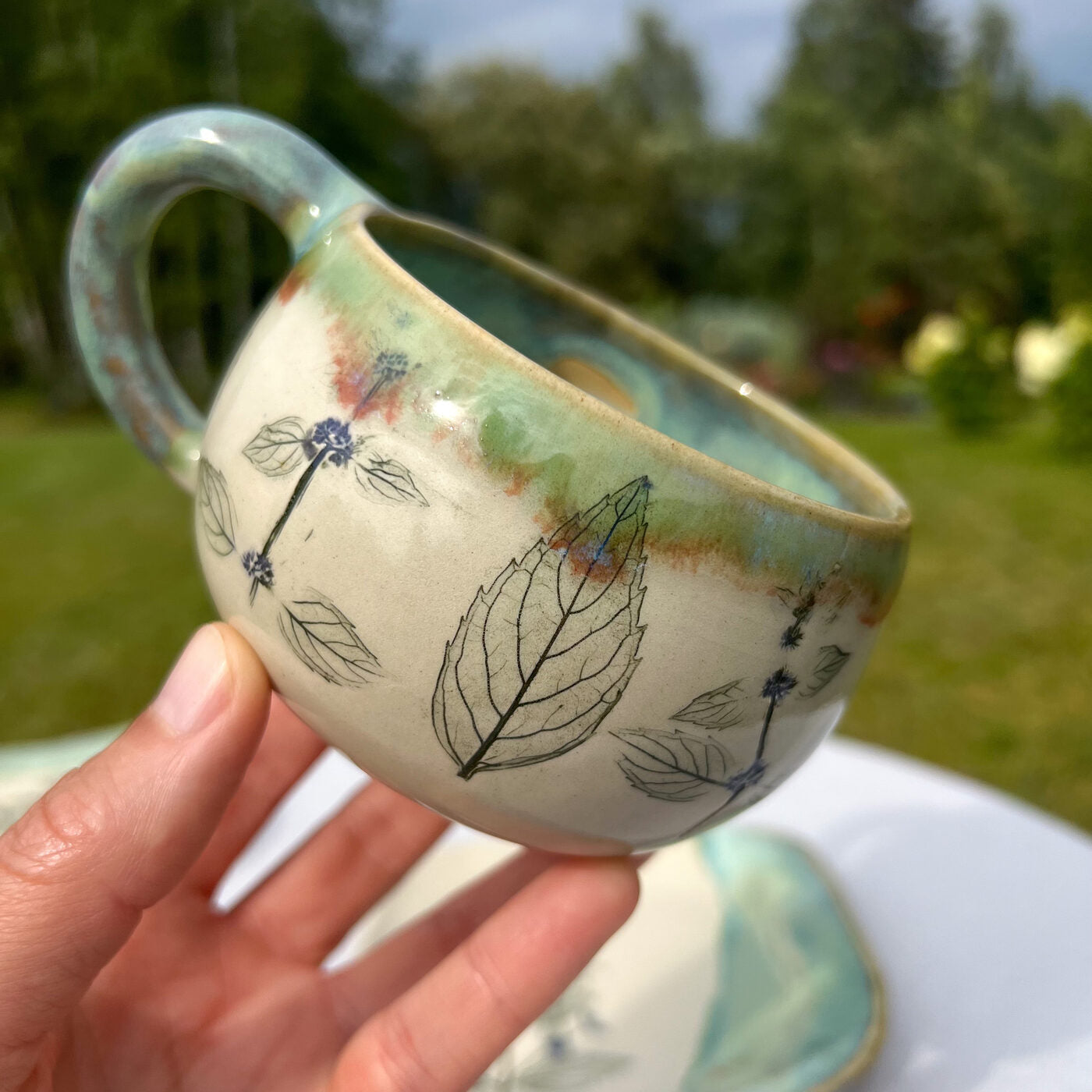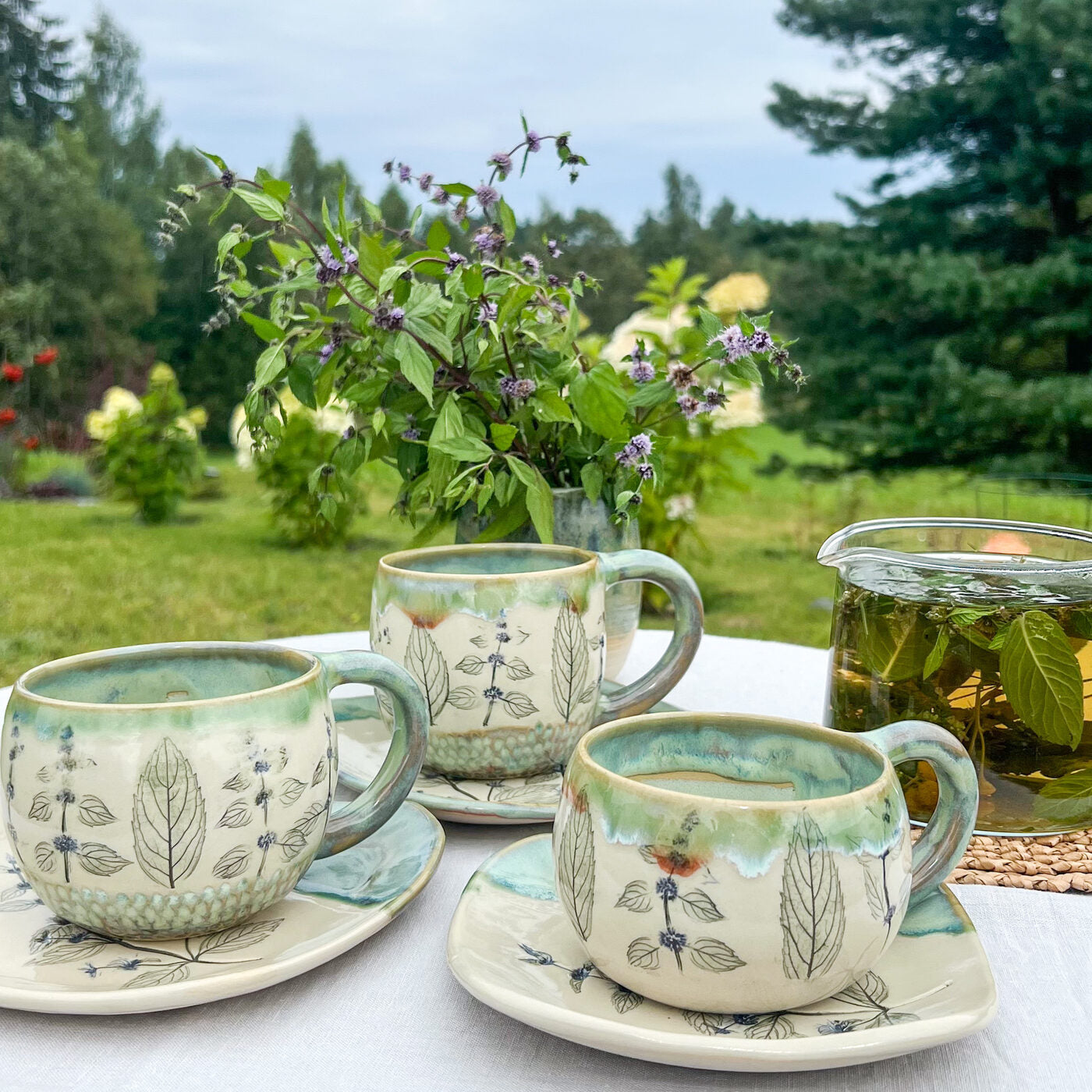 Šī komplekta dizainu caurvij piparmētru lapiņu atspiedumi mālā. Šis smalkais dabas motīvs piešķir komplektam atsvaidzinošu, lauku estētiku. Apakštasīte pasargā virsmas un lieliski kalpo kā neliels trauks saldumiem vai cepumiem.