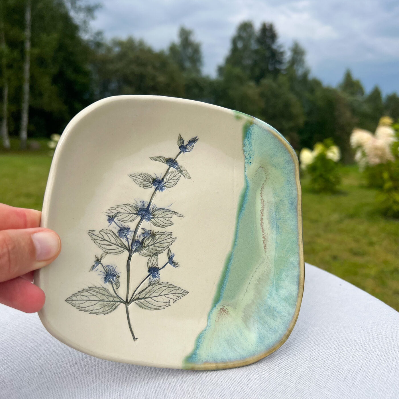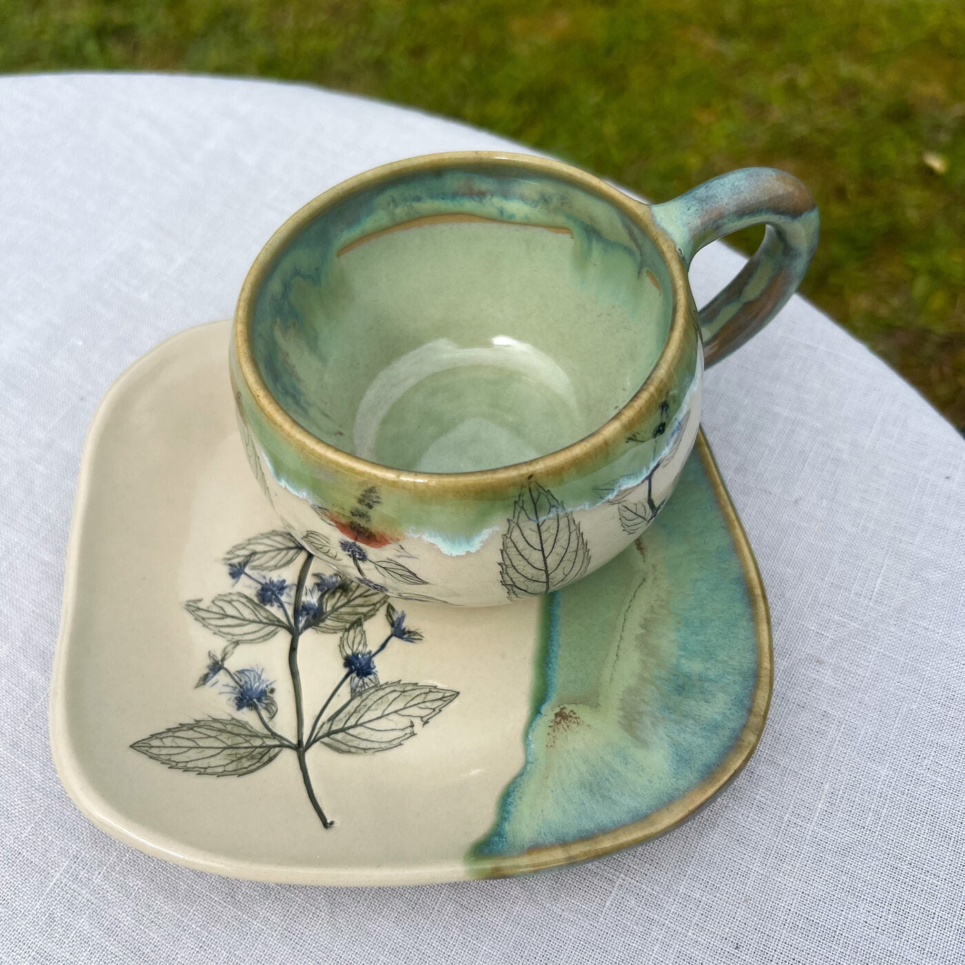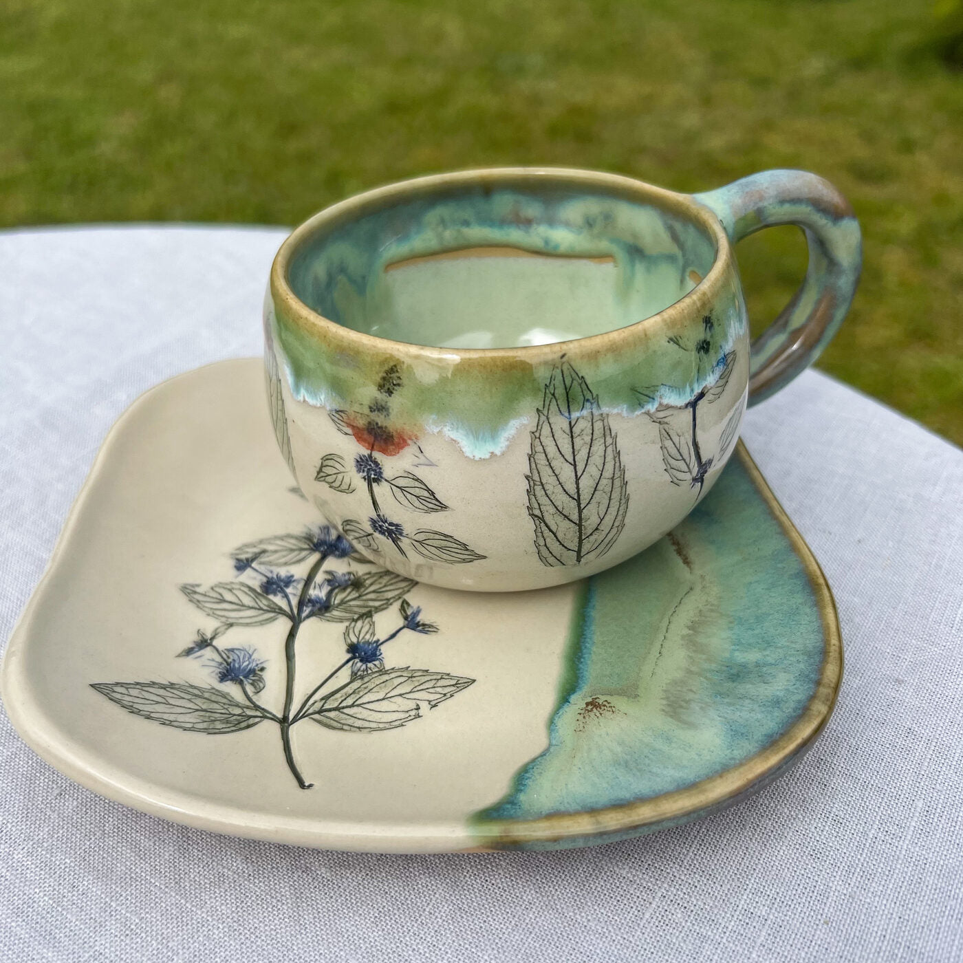 Šī komplekta dizainu caurvij piparmētru lapiņu atspiedumi mālā. Šis smalkais dabas motīvs piešķir komplektam atsvaidzinošu, lauku estētiku. Apakštasīte pasargā virsmas un lieliski kalpo kā neliels trauks saldumiem vai cepumiem.