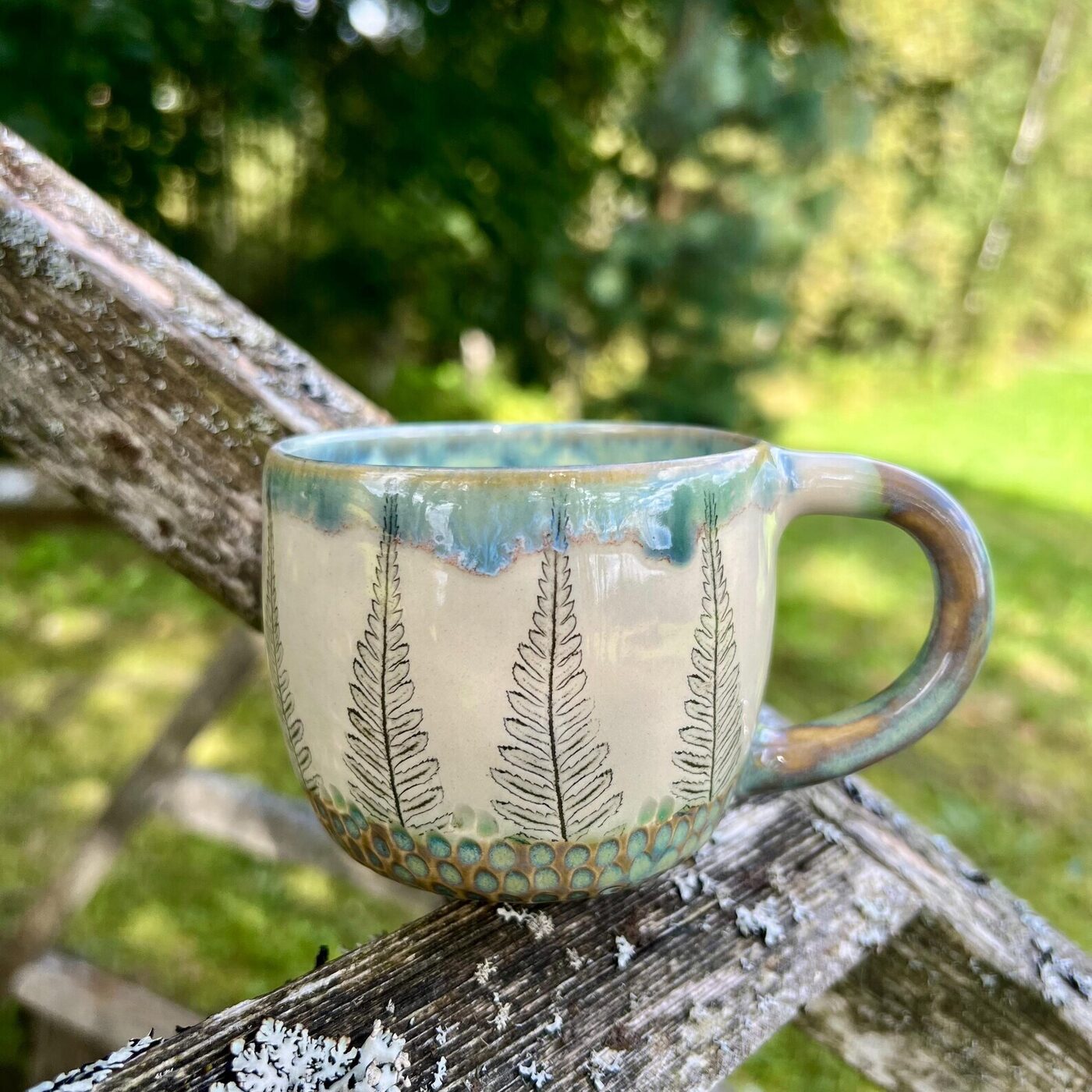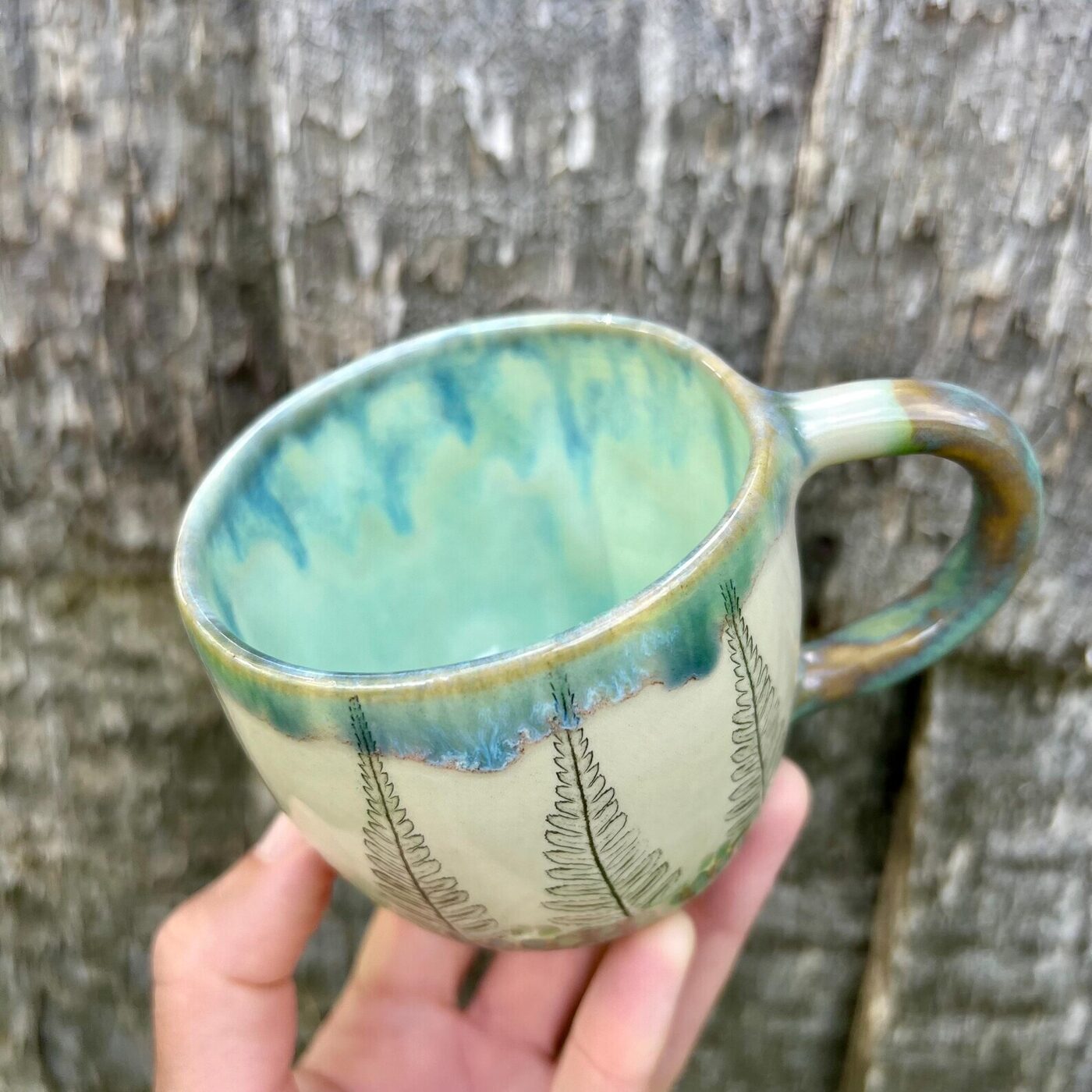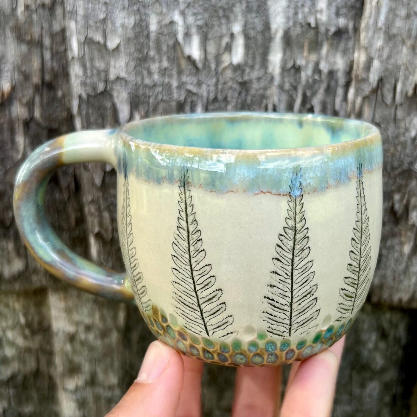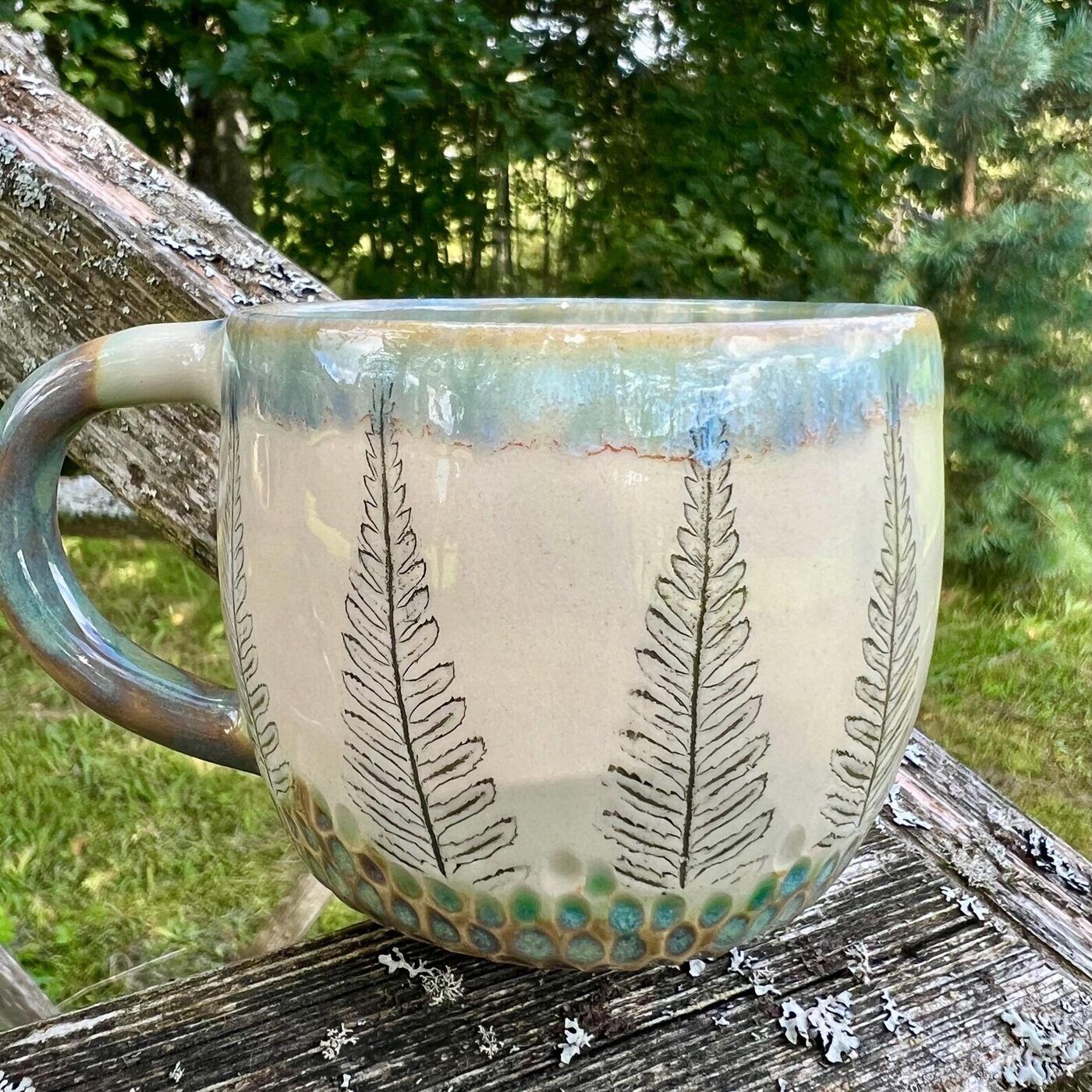 Krūzes virsma ir dekorēta ar papardīšu iespiedumiem, padarot katru krūzi par unikālu, teksturētu rokdarbu. Šis dabiskais akcents piešķir eleganci jūsu ikdienas galdam.