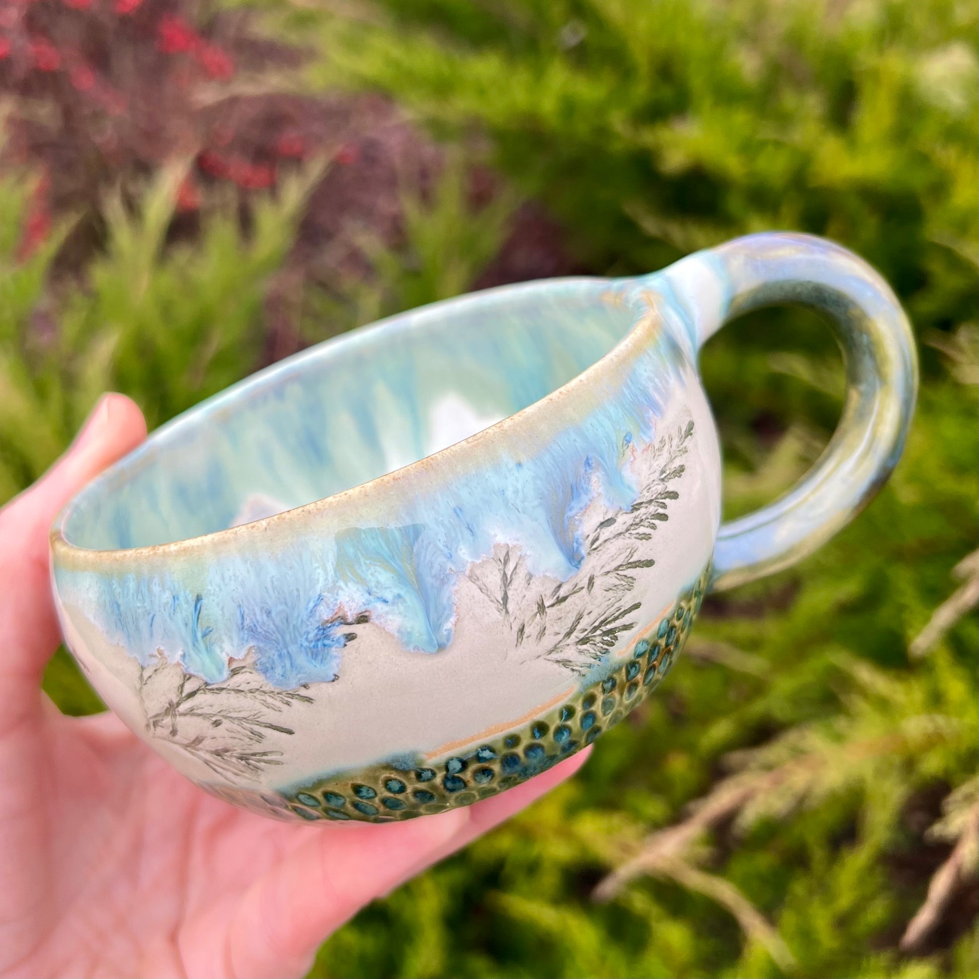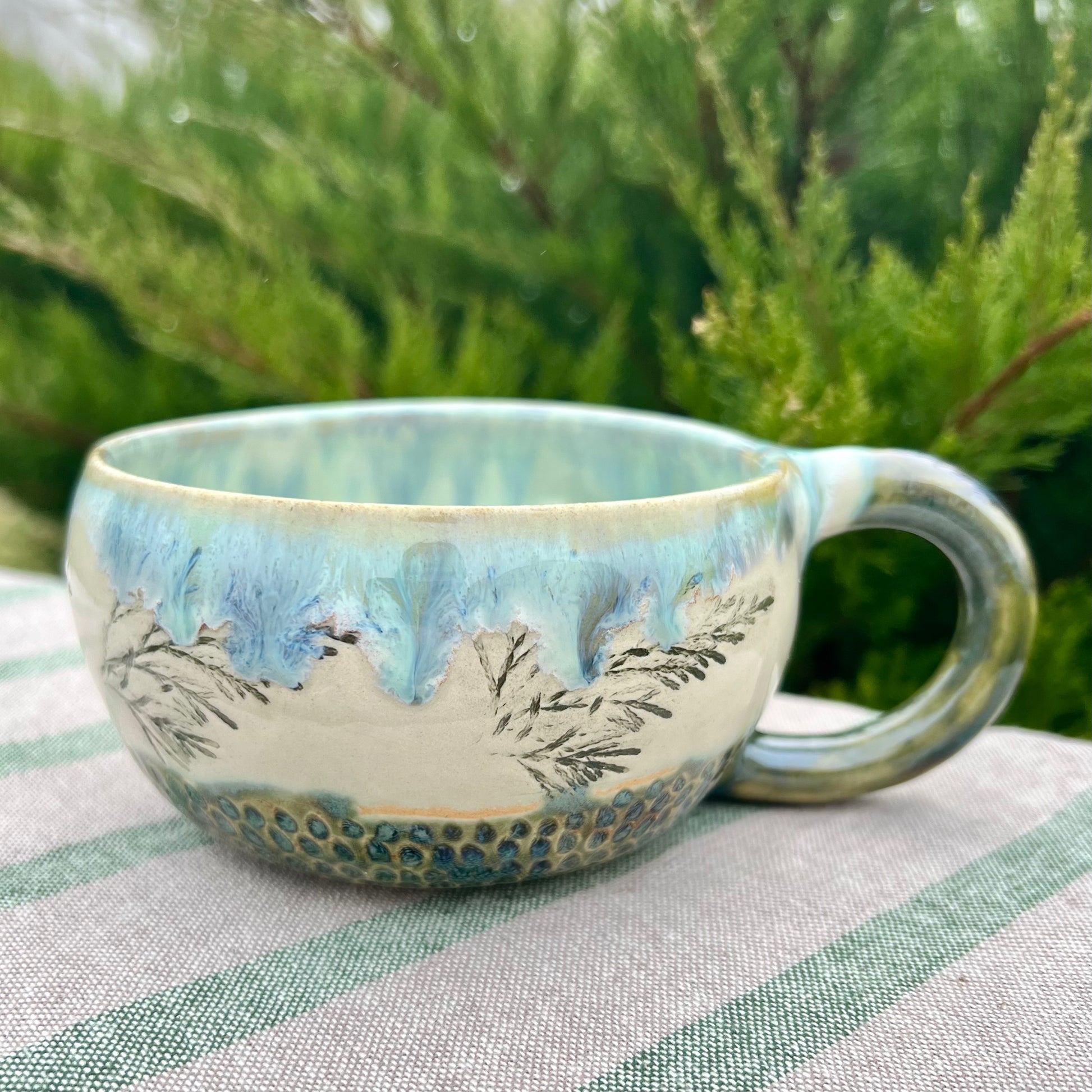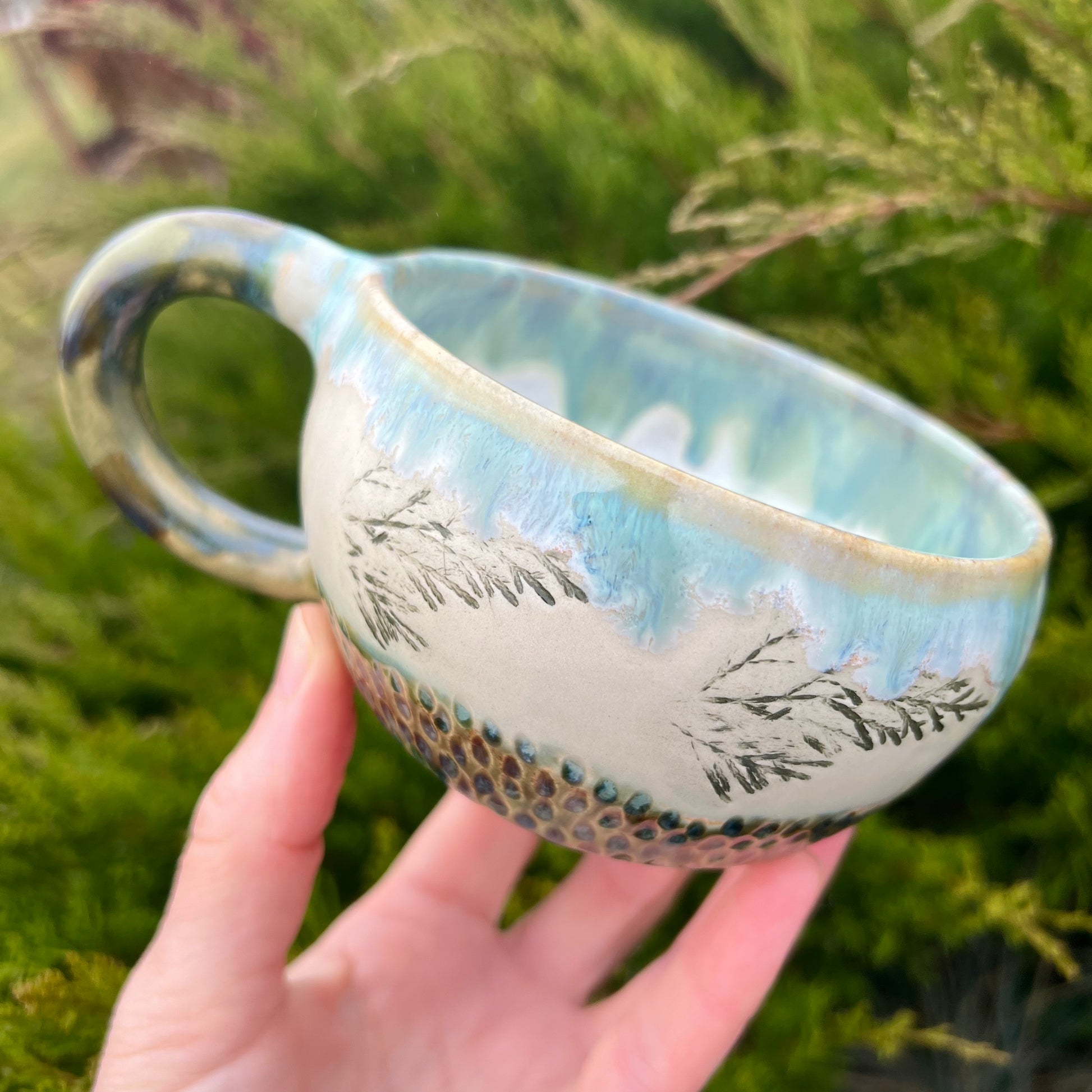 Krūzes virsma ir dekorēta ar kadiķa zariņu iespiedumiem, padarot katru krūzi par unikālu, teksturētu rokdarbu. Šis dabiskais akcents piešķir eleganci jūsu ikdienas galdam.
