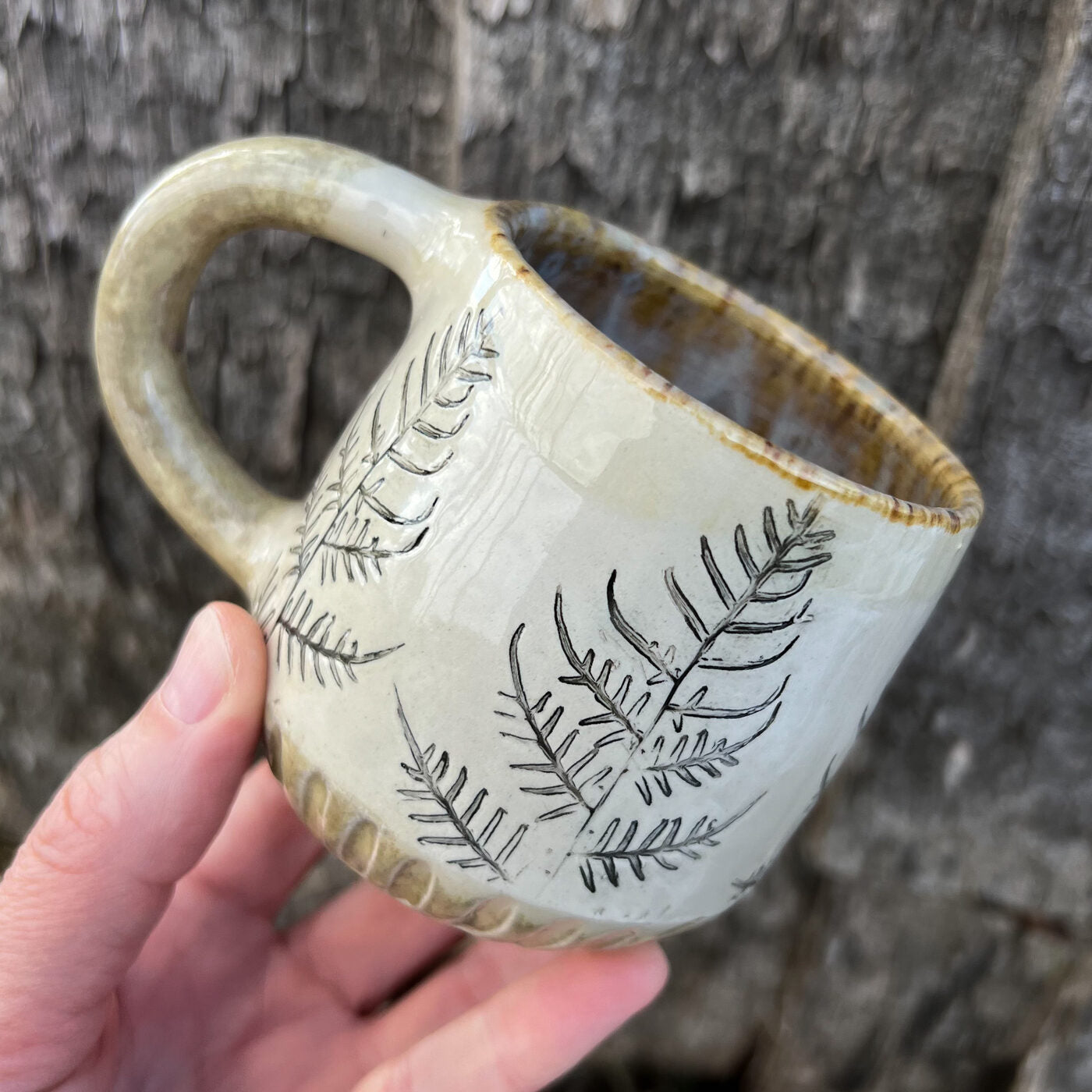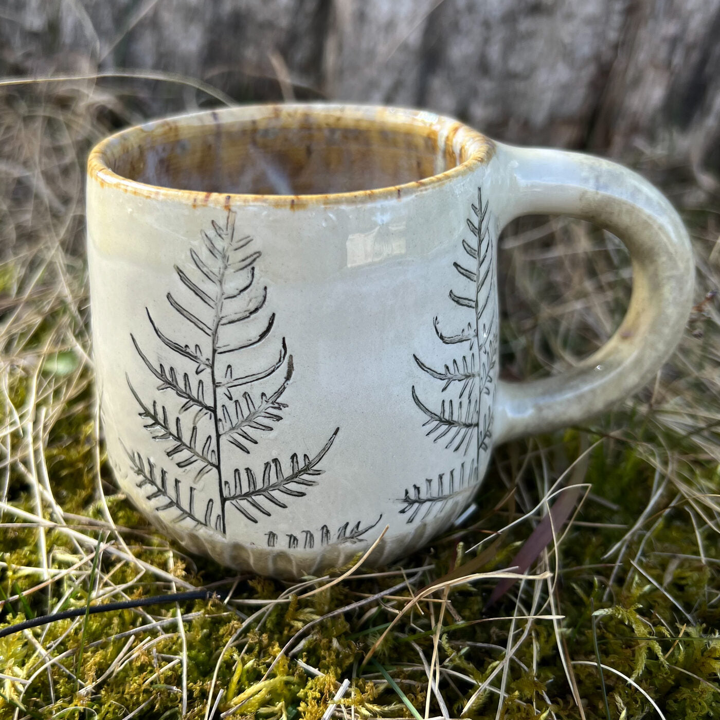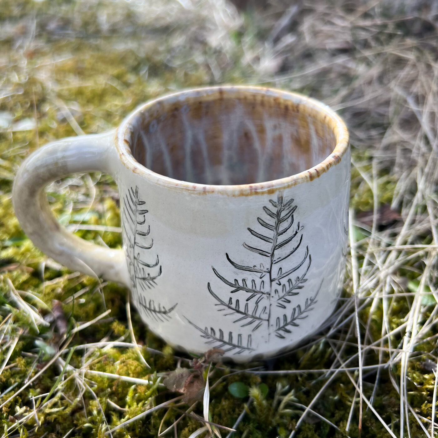 Krūzes virsma ir dekorēta ar papardes iespiedumiem, padarot katru krūzi par unikālu, teksturētu rokdarbu. Šis dabiskais akcents piešķir eleganci jūsu ikdienas galdam.
