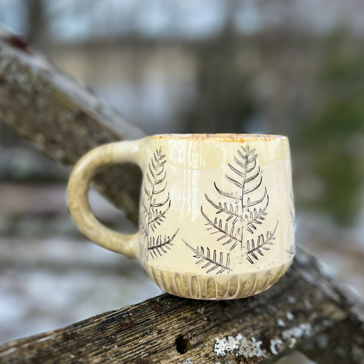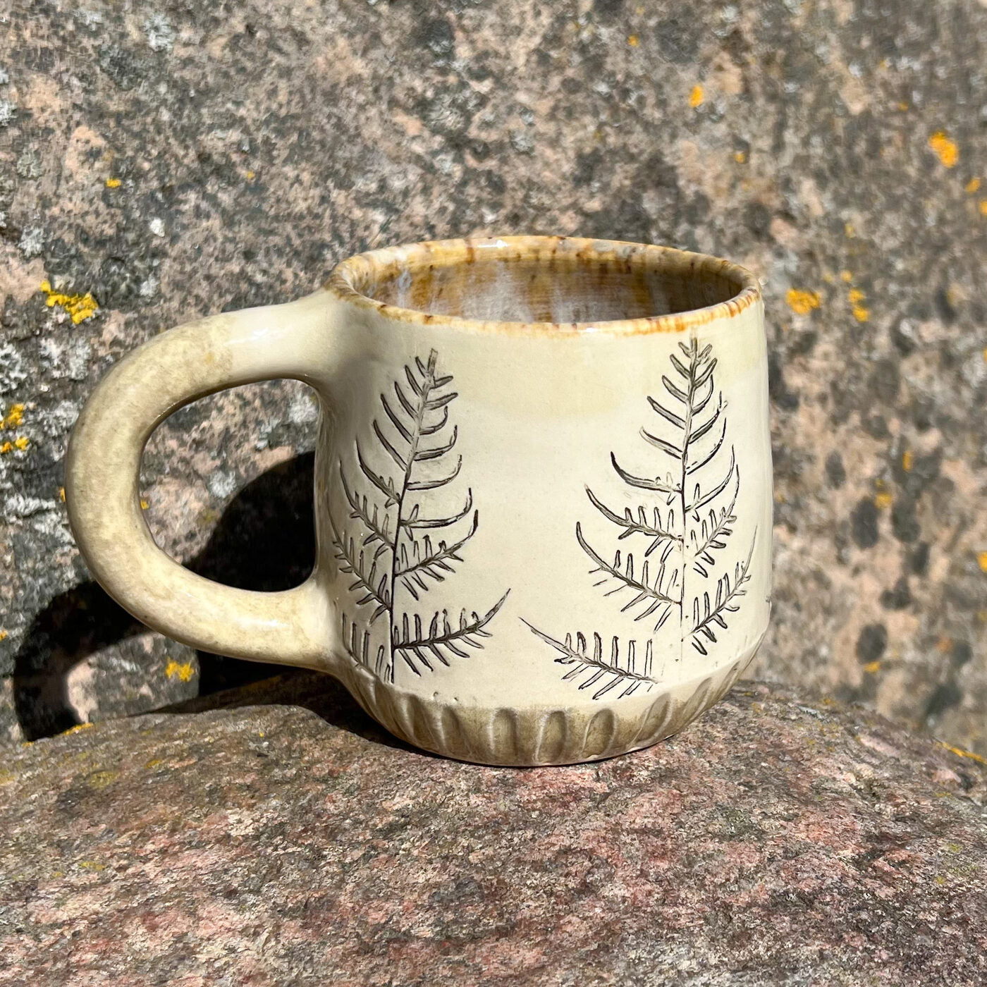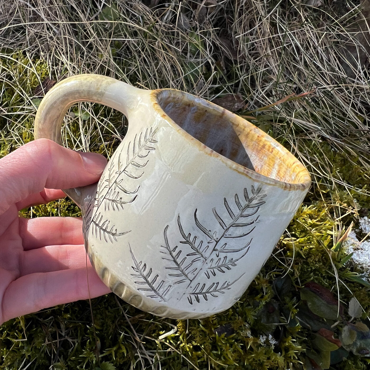 Krūzes virsma ir dekorēta ar papardes iespiedumiem, padarot katru krūzi par unikālu, teksturētu rokdarbu. Šis dabiskais akcents piešķir eleganci jūsu ikdienas galdam.