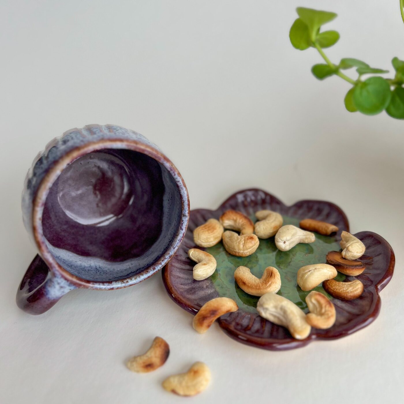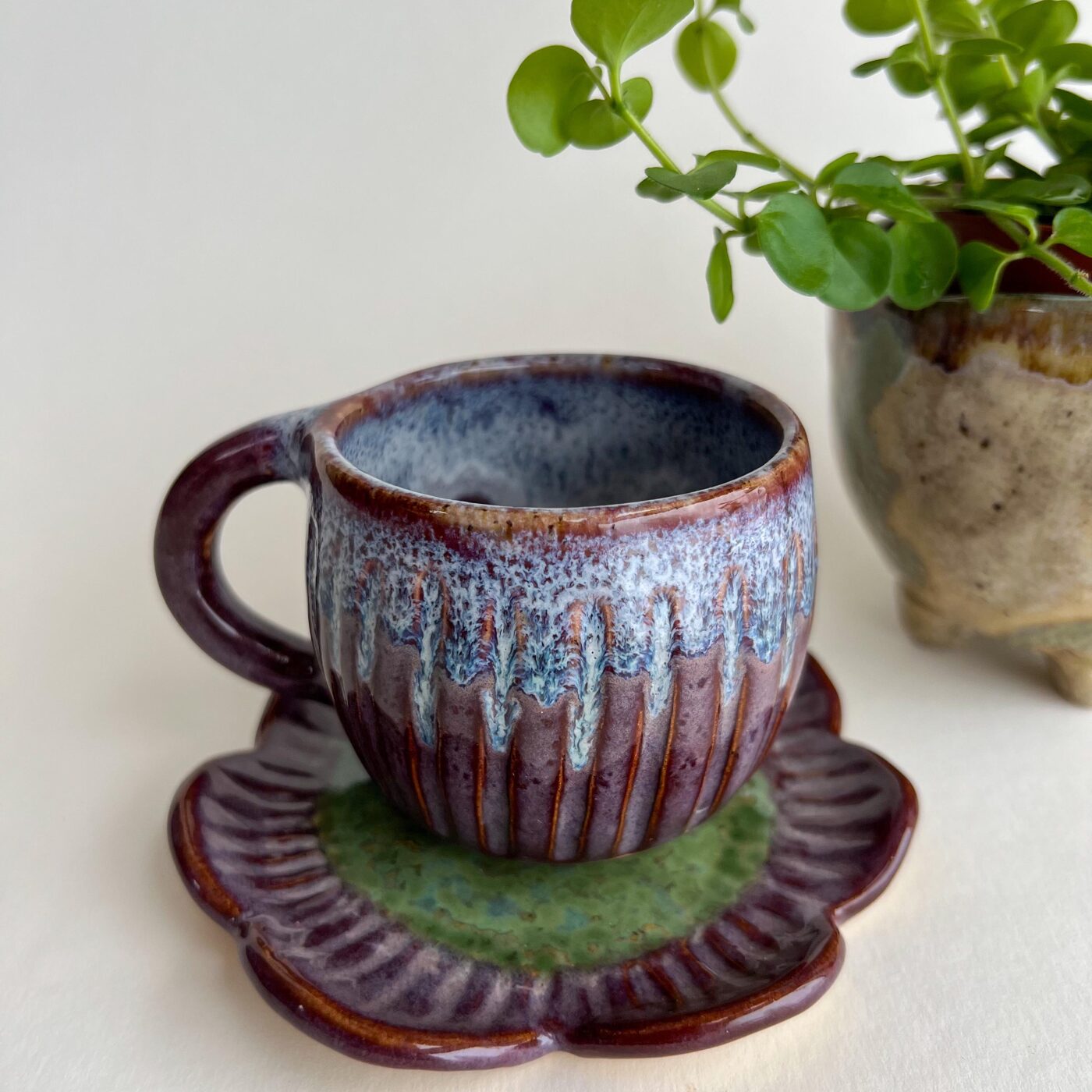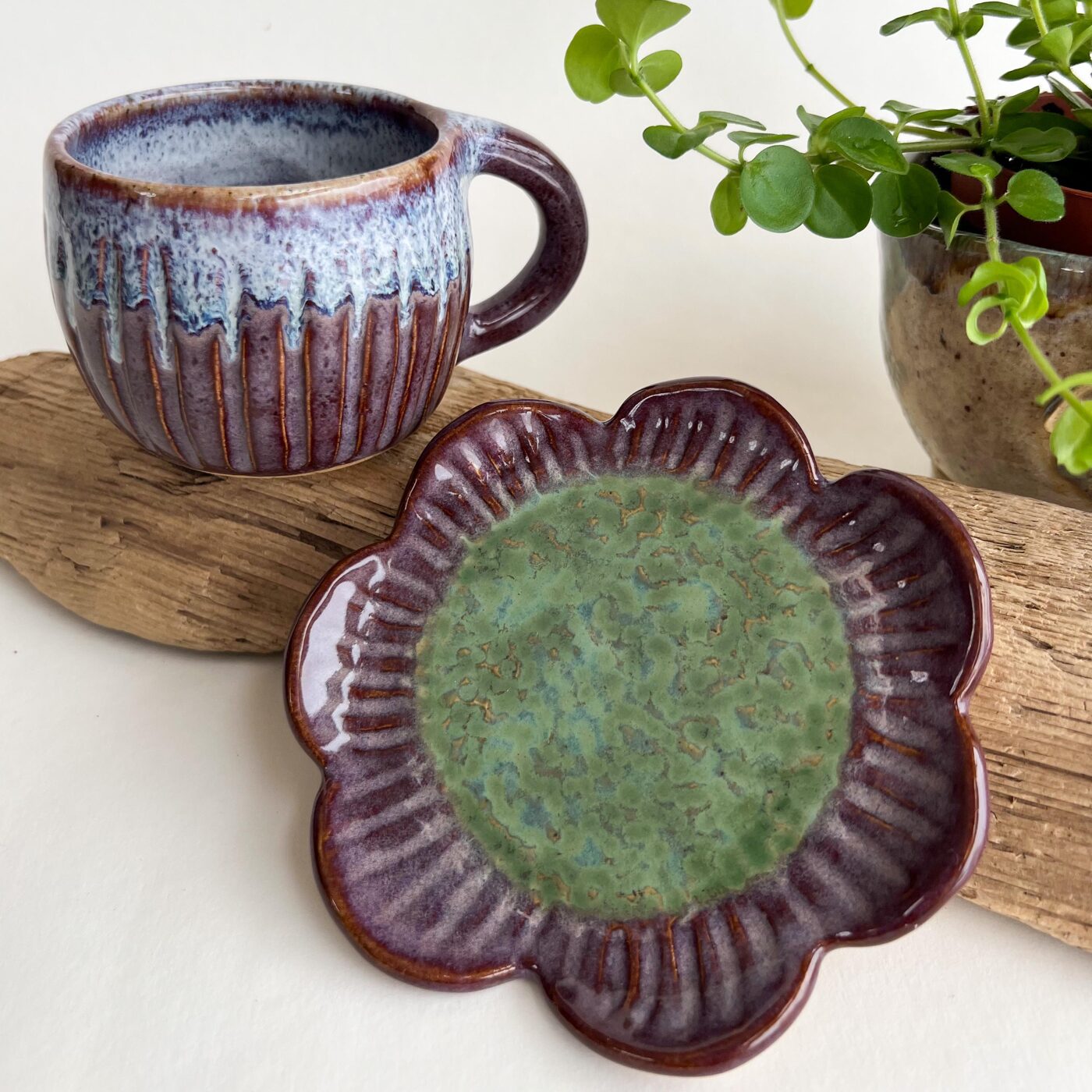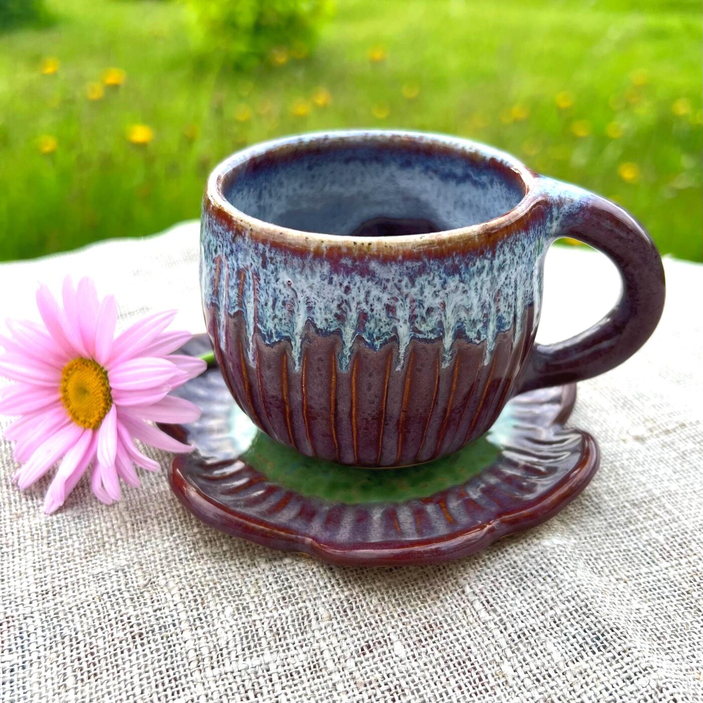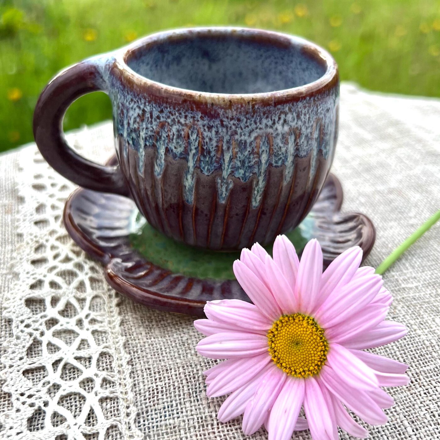 Skaista keramikas kafijas krūzīte ar apakštasīti - maza, eleganta tasīte ar zieda formas apakštasīti. Izgatavots no akmens masas un piemērots gan ikdienas lietošanai, gan svētku galdam. Drošs pārtikai.