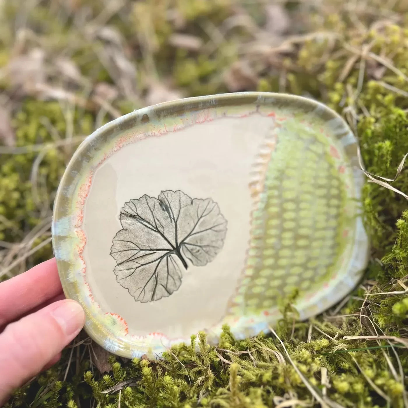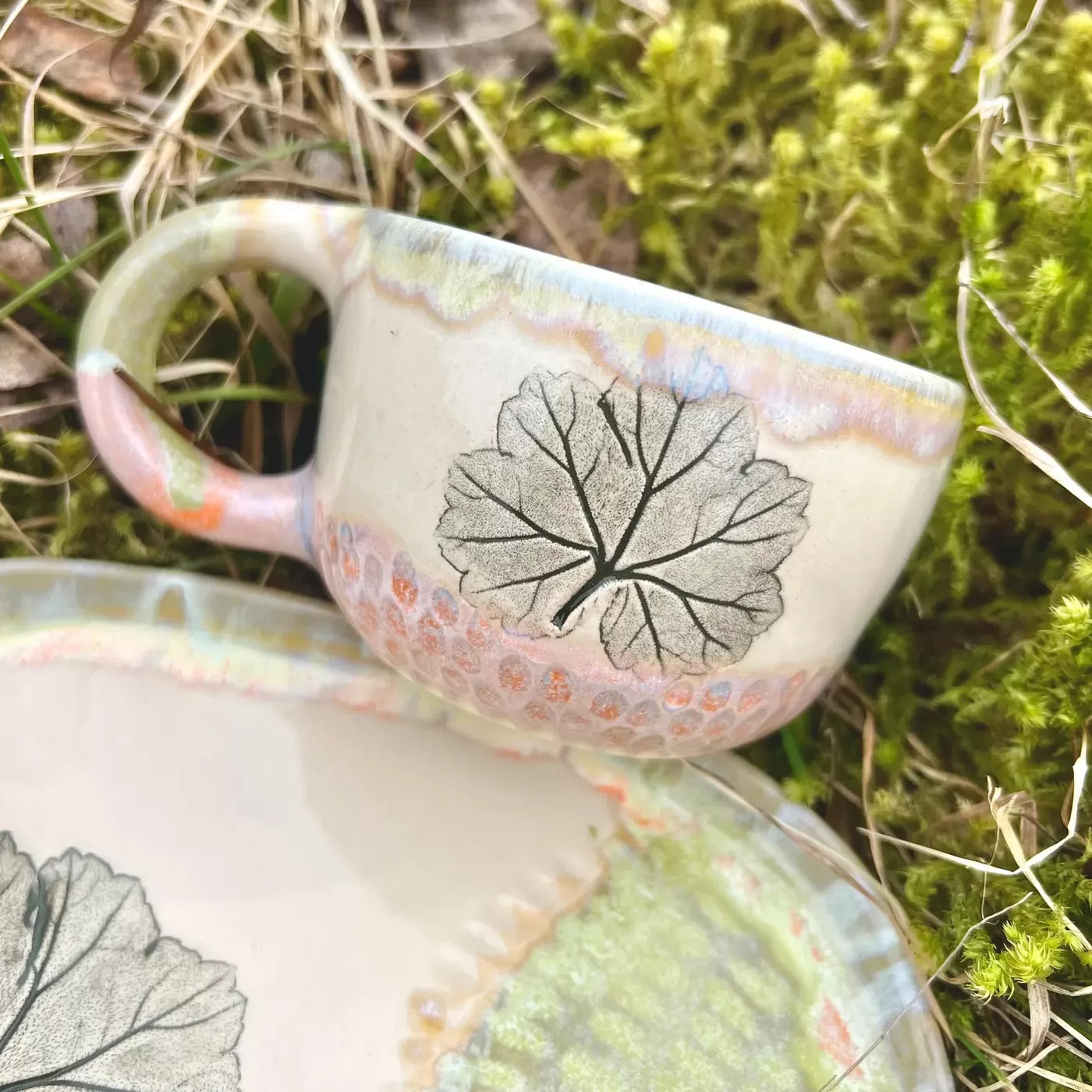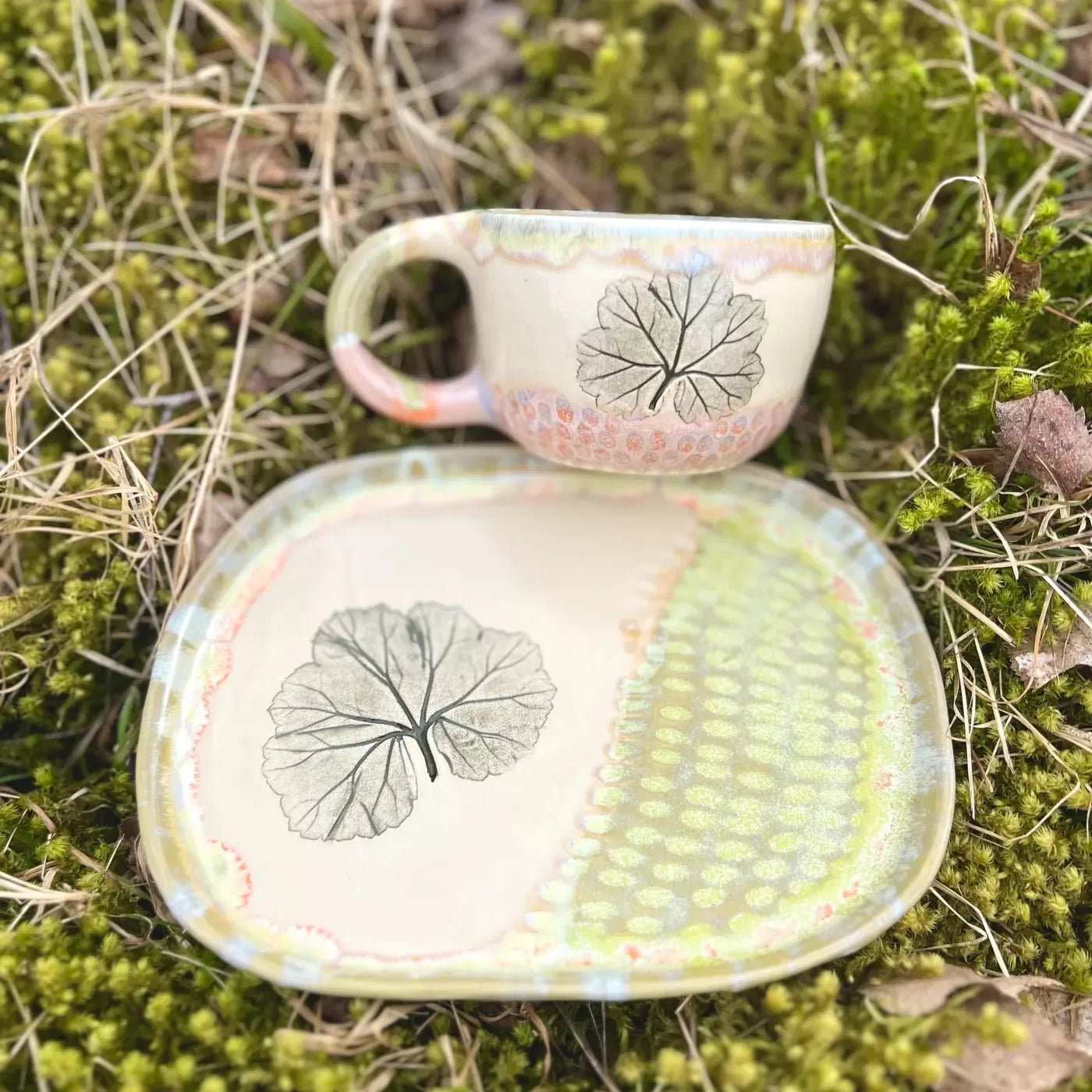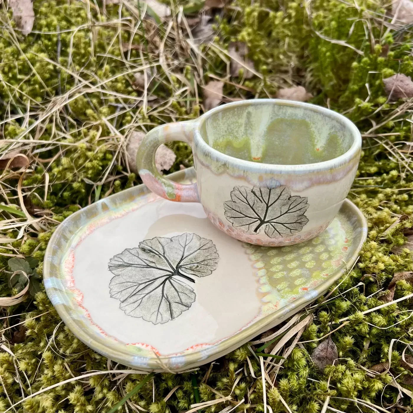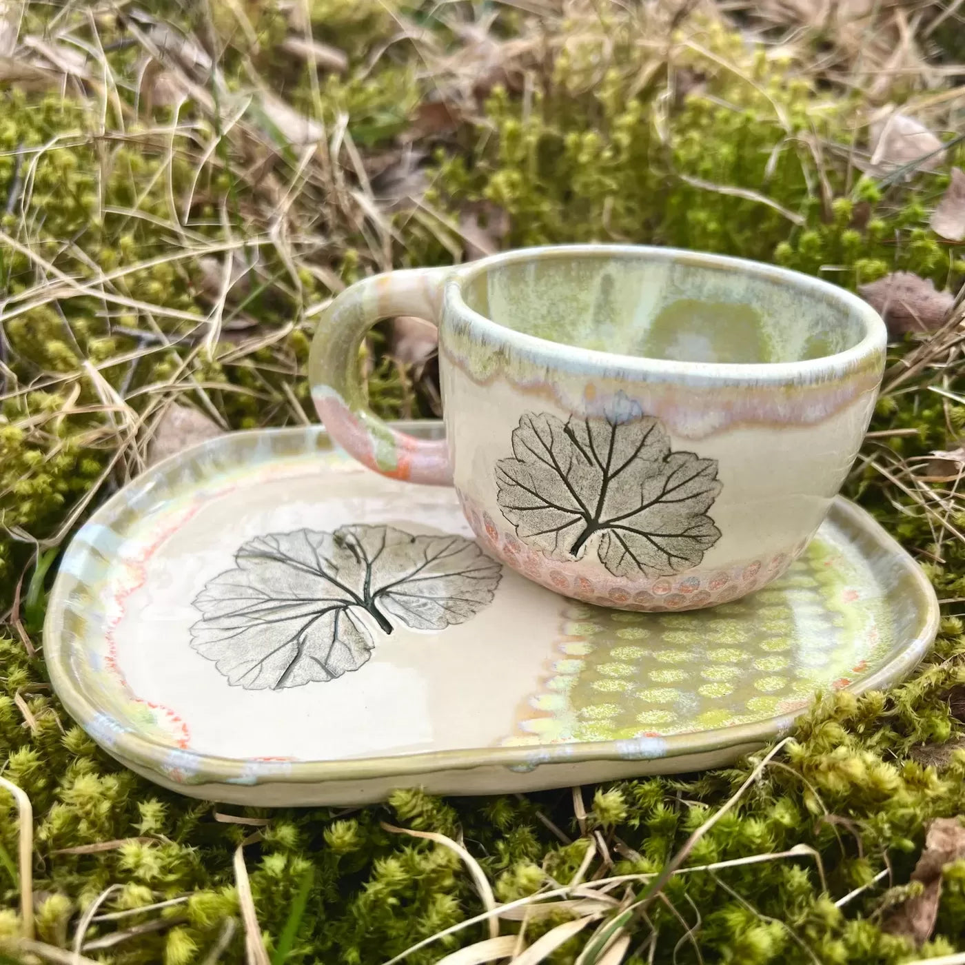 Šī komplekta dizainu caurvij pelargoniju lapiņu atspiedumi mālā. Šis smalkais dabas motīvs piešķir komplektam atsvaidzinošu, lauku estētiku. Apakštasīte pasargā virsmas un lieliski kalpo kā neliels trauks saldumiem vai cepumiem.