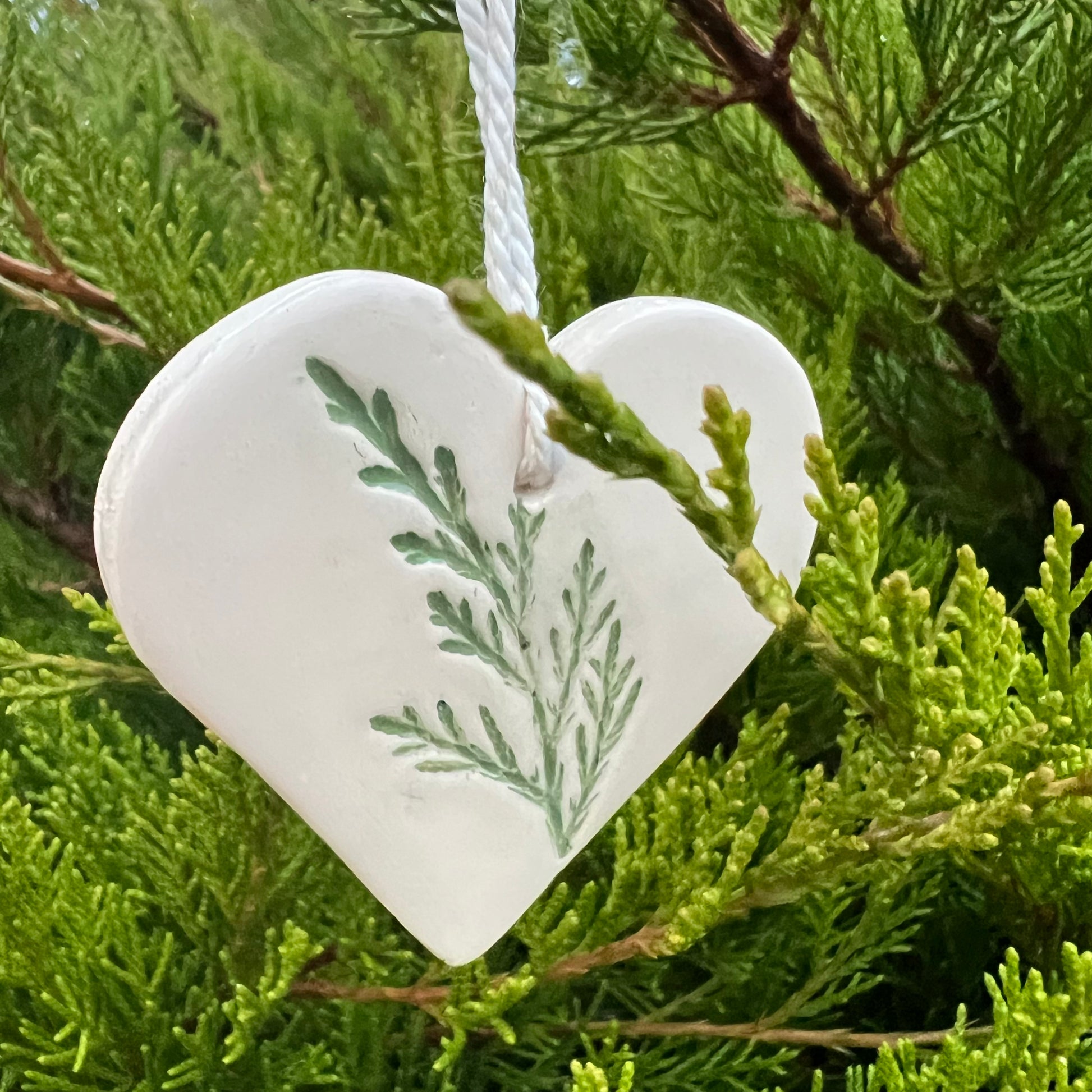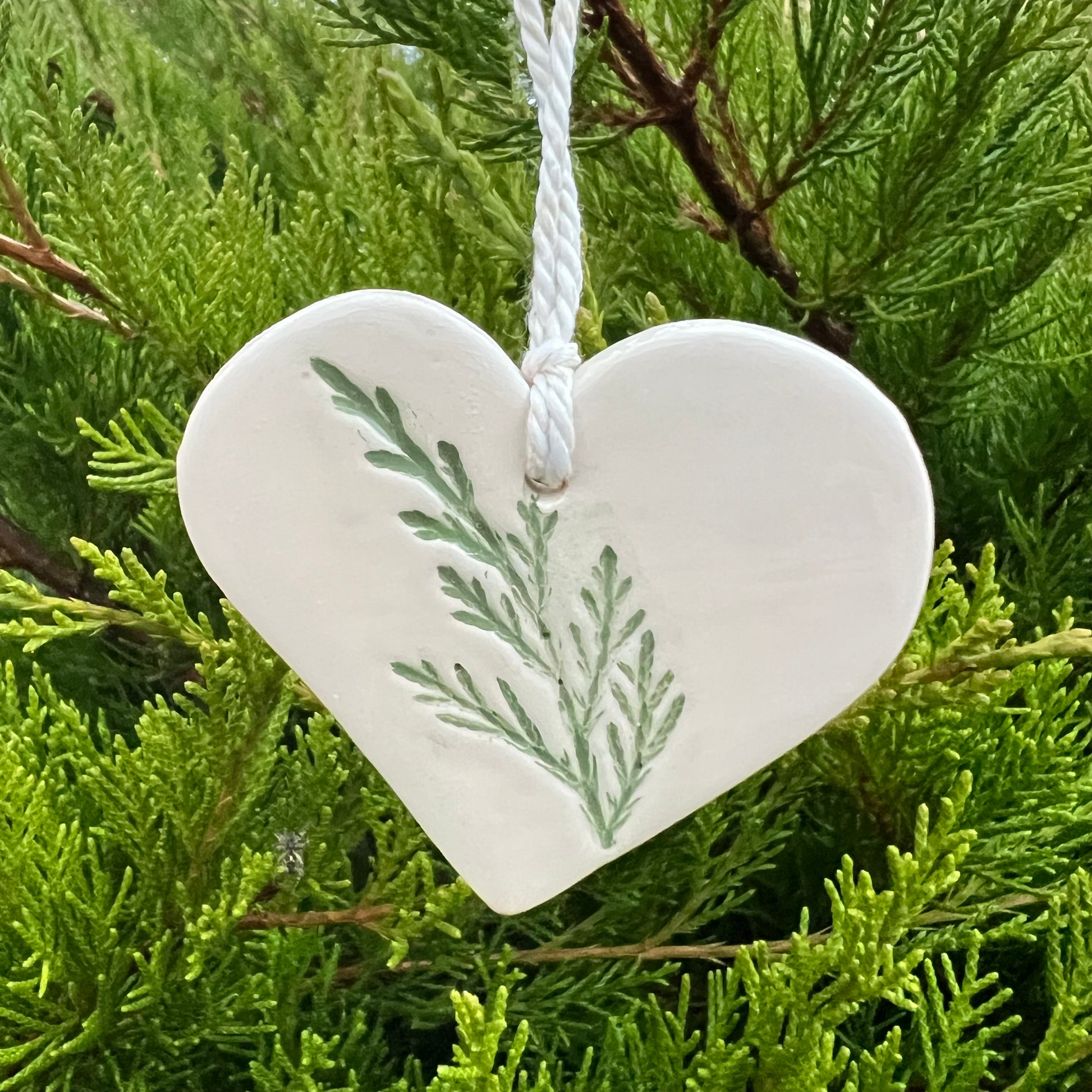 Nelieli, ar rokām darināti māla rotājumi sirsniņas formā ar kadiķa zariņu atspiedumiem.