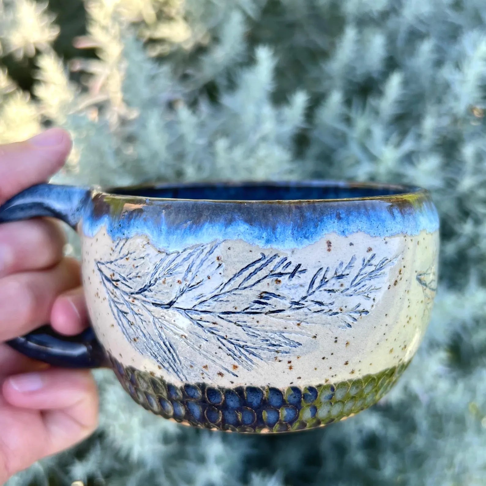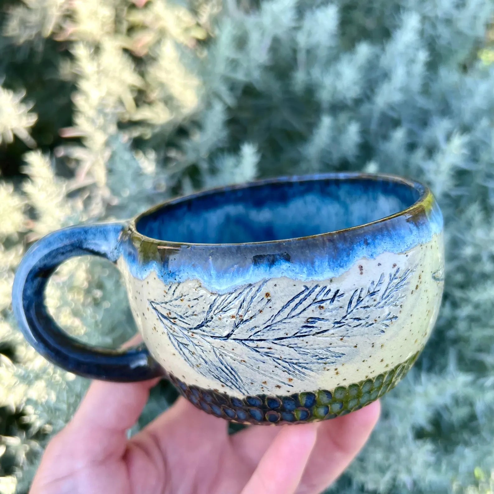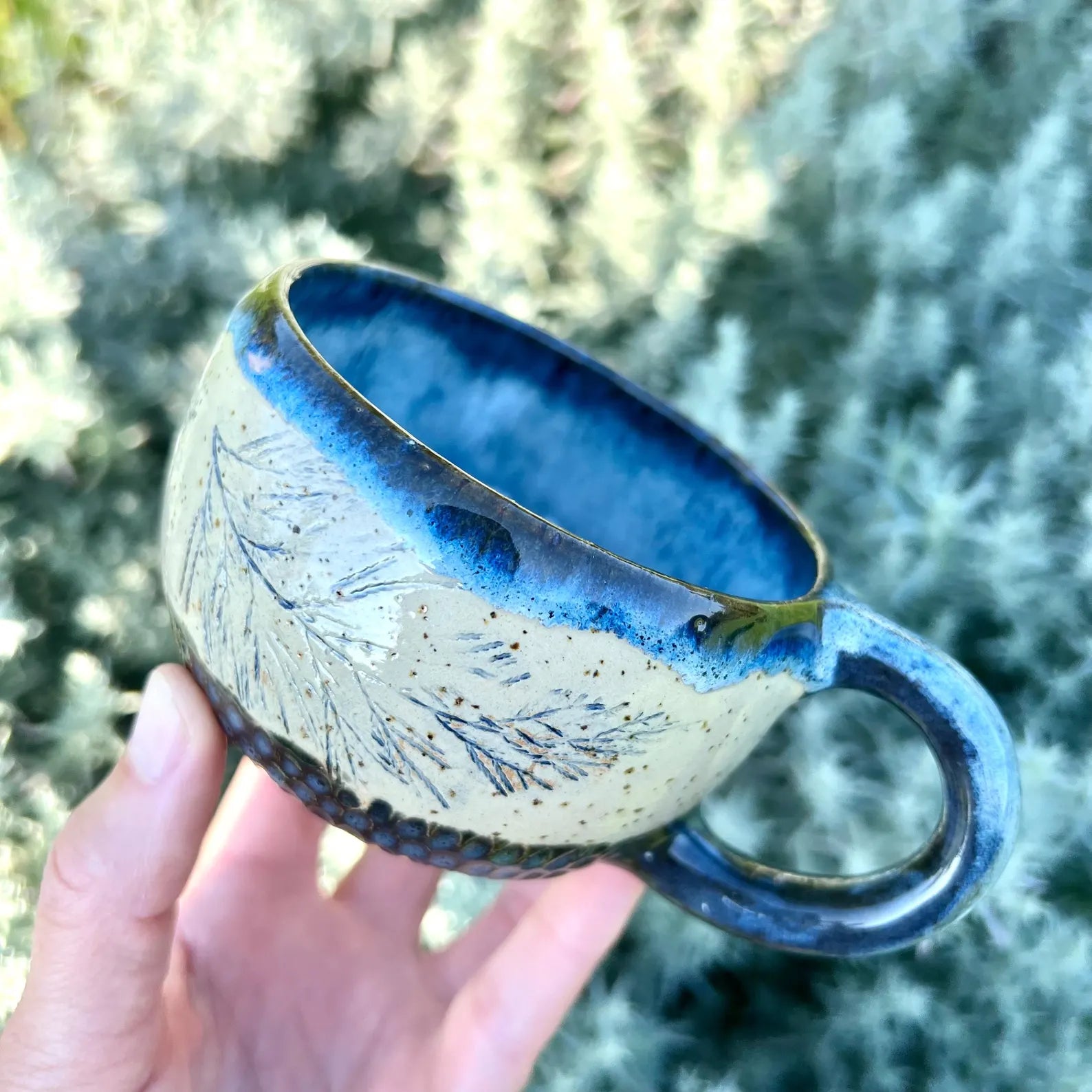 Krūzes virsma ir dekorēta ar cipreses iespiedumiem, padarot katru krūzi par unikālu, teksturētu rokdarbu. Šis dabiskais akcents piešķir eleganci jūsu ikdienas galdam.