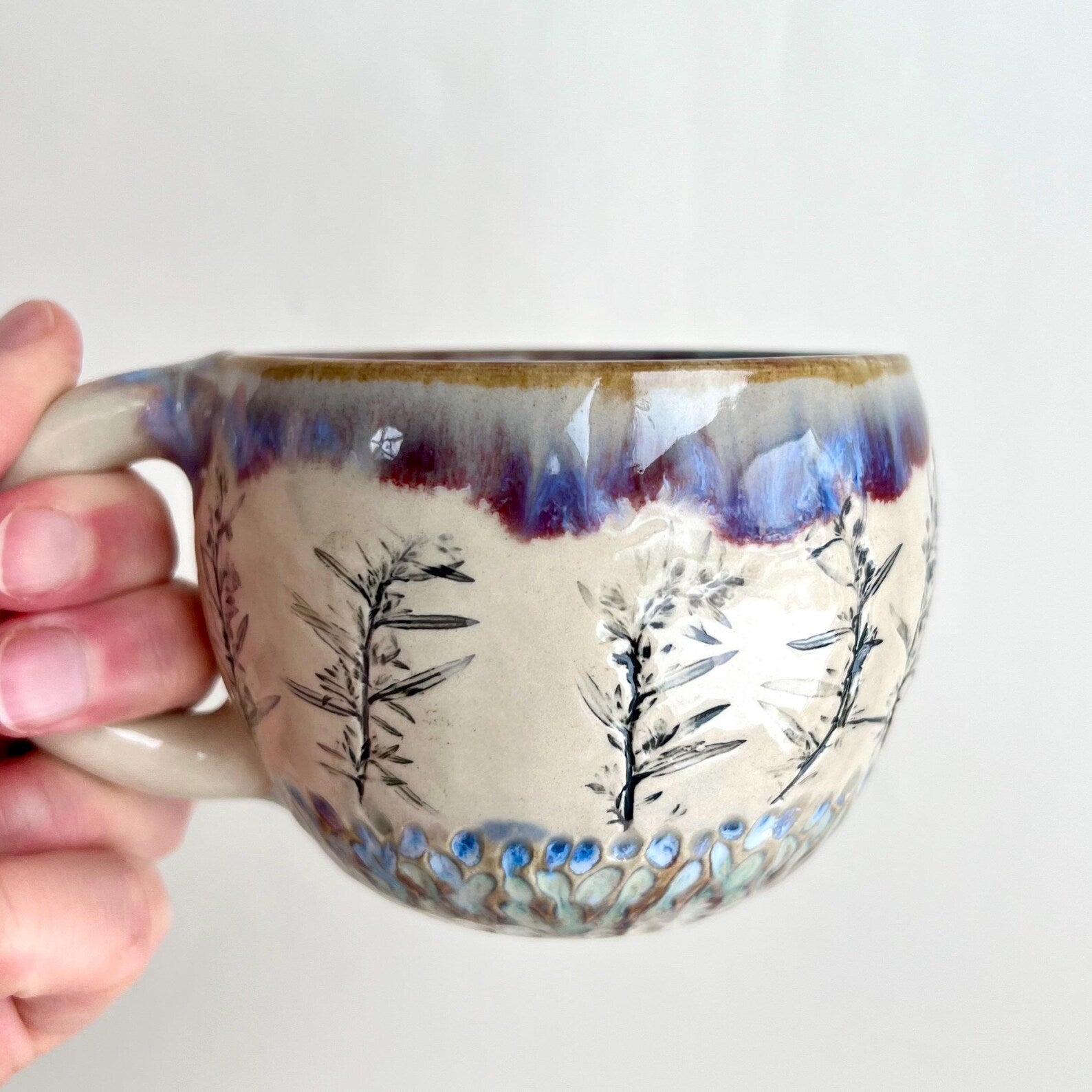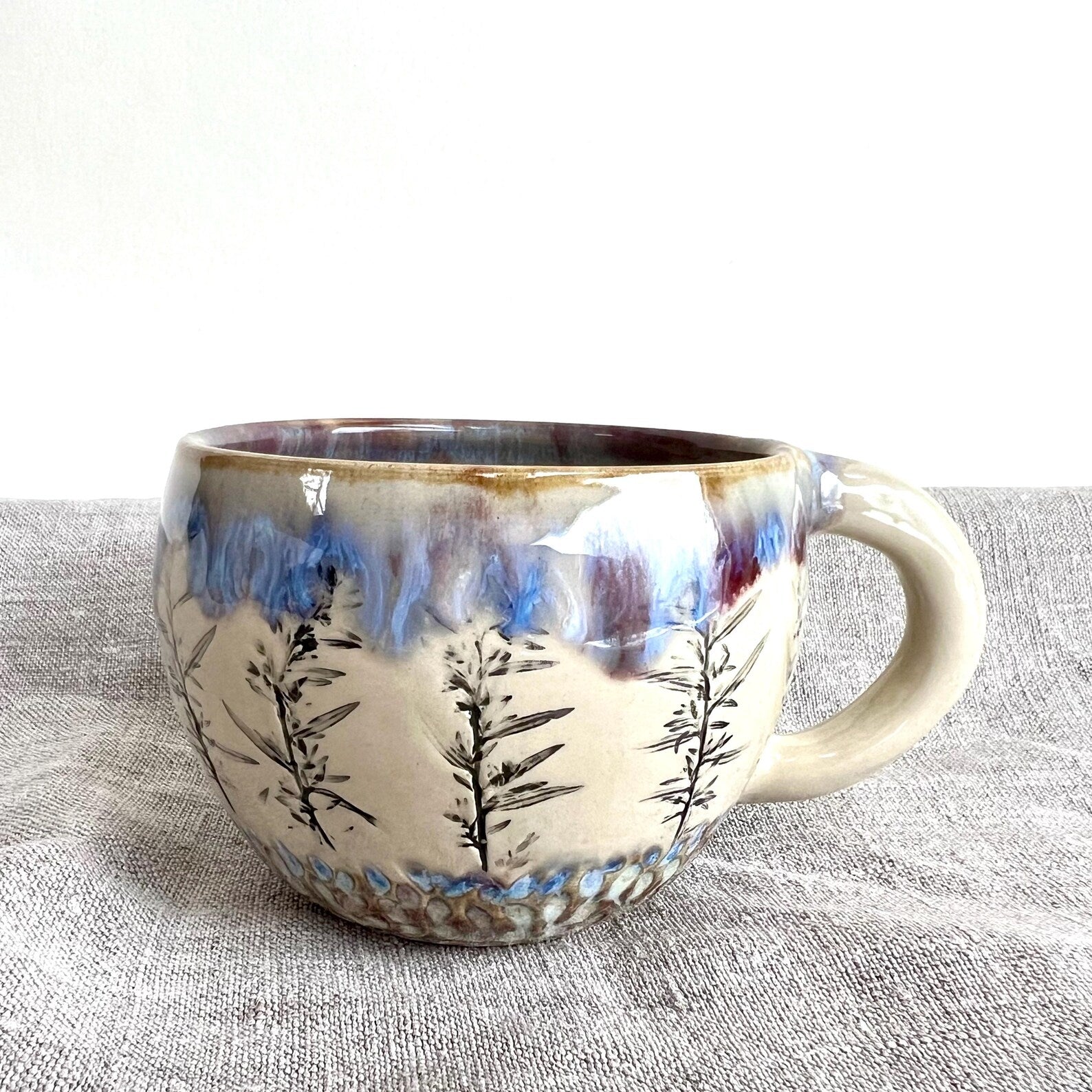 Krūzes virsma ir dekorēta ar vērmeles iespiedumiem, padarot katru krūzi par unikālu, teksturētu rokdarbu. Šis dabiskais akcents piešķir eleganci jūsu ikdienas galdam.