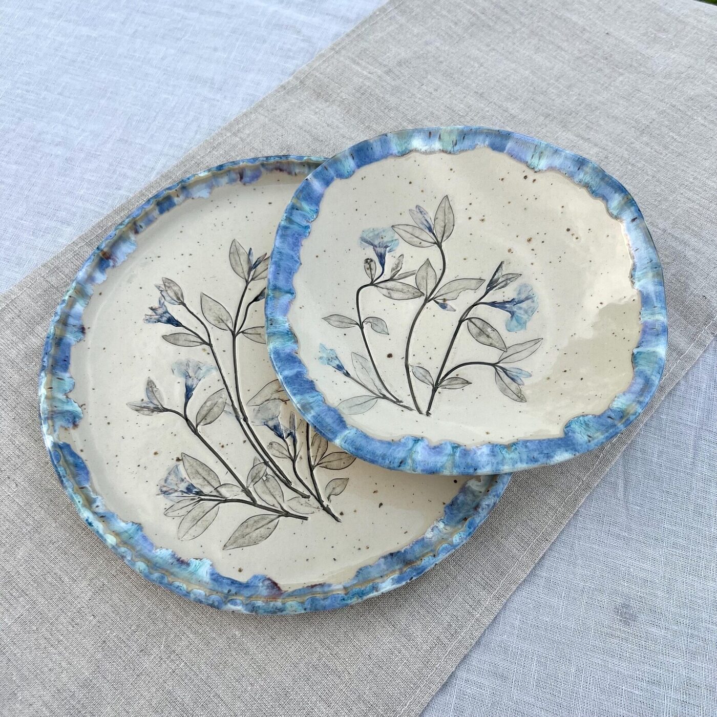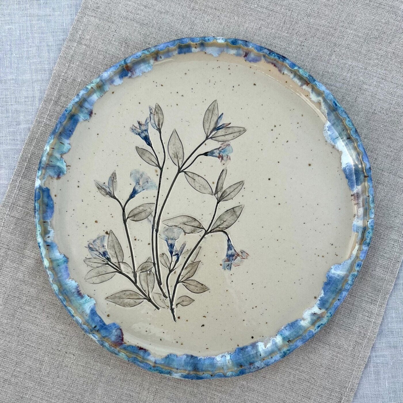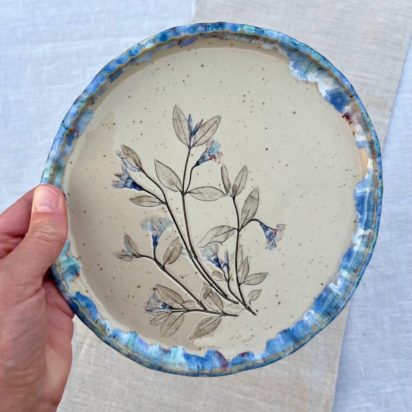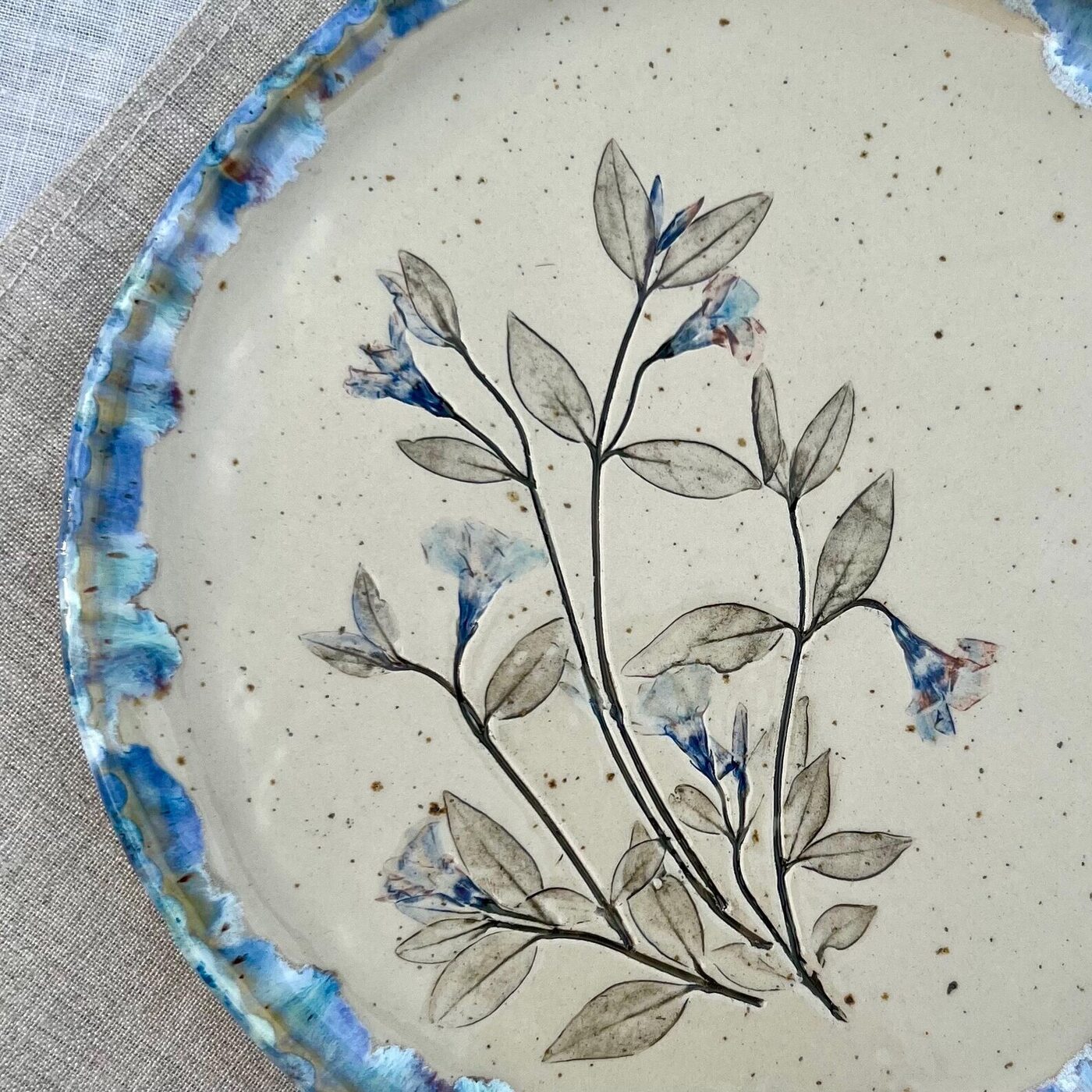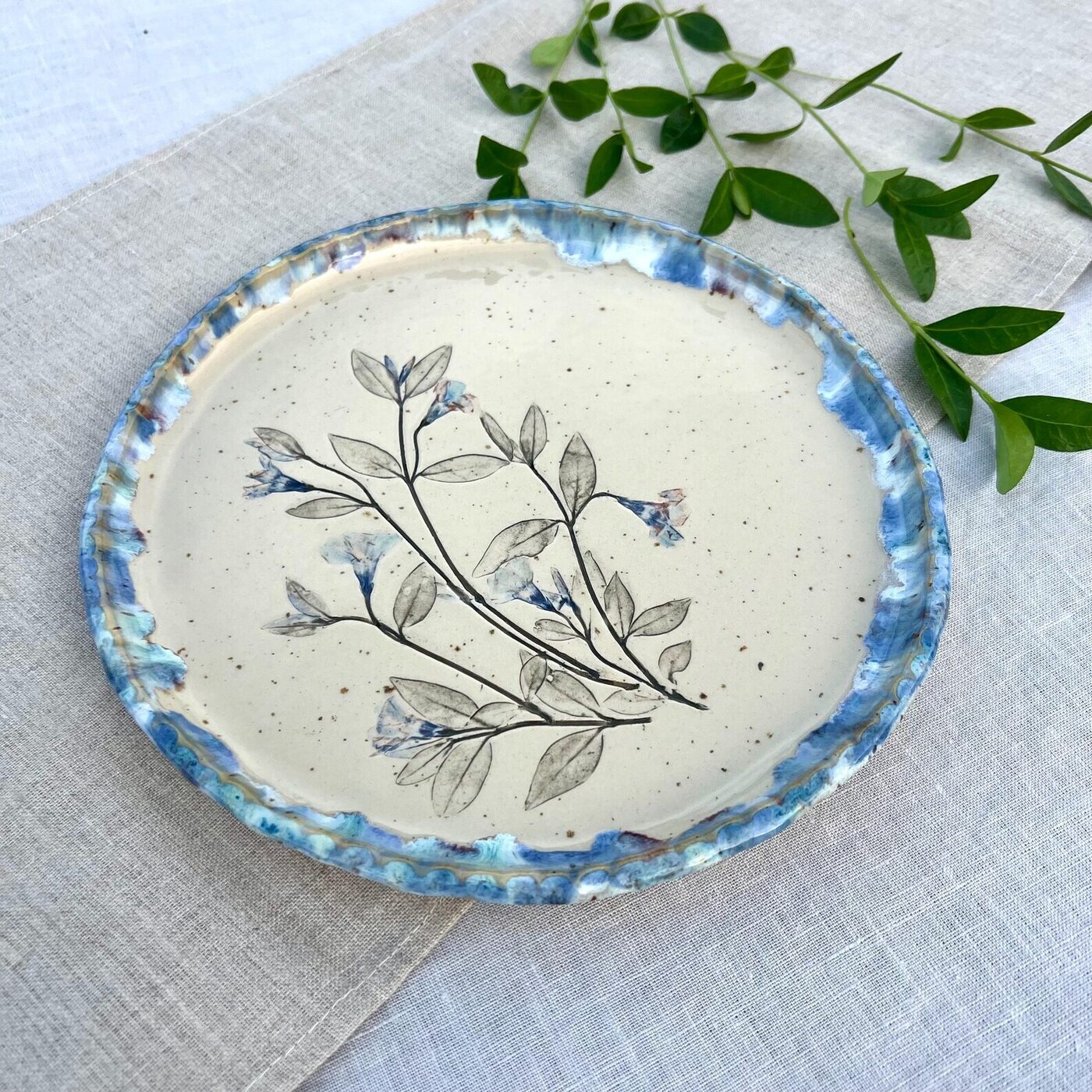 Šķīvis rotāts ar smalku auga nospiedumu – dabas elementu, kas iemūžināts mālā.