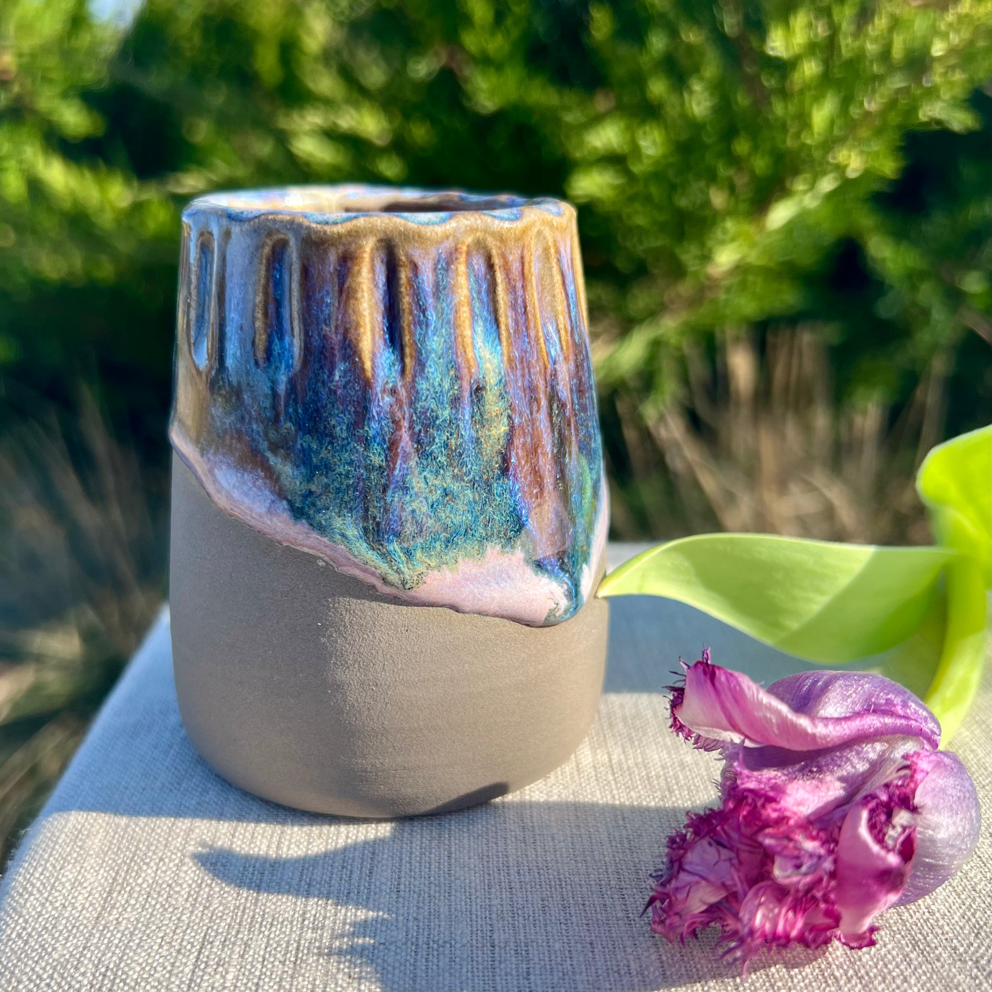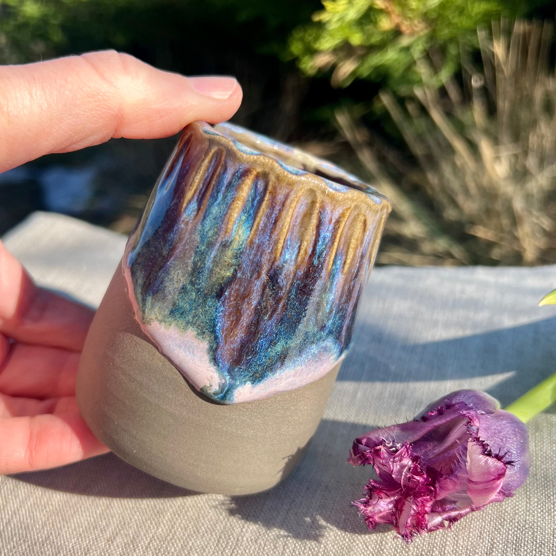 Ar rokām darināta pelēkas akmens masas vāzīte, ideāli piemērota pavasara ziediņiem.