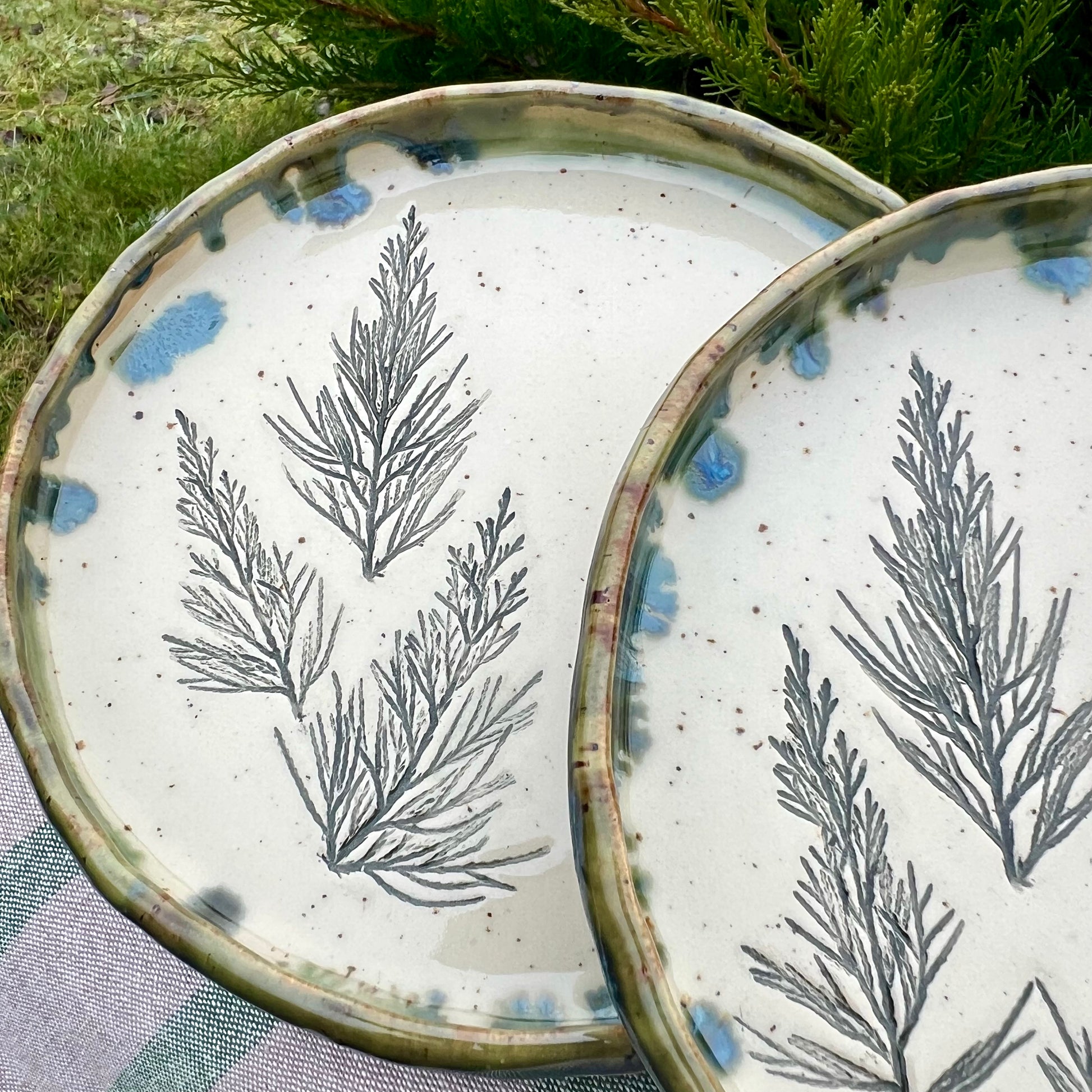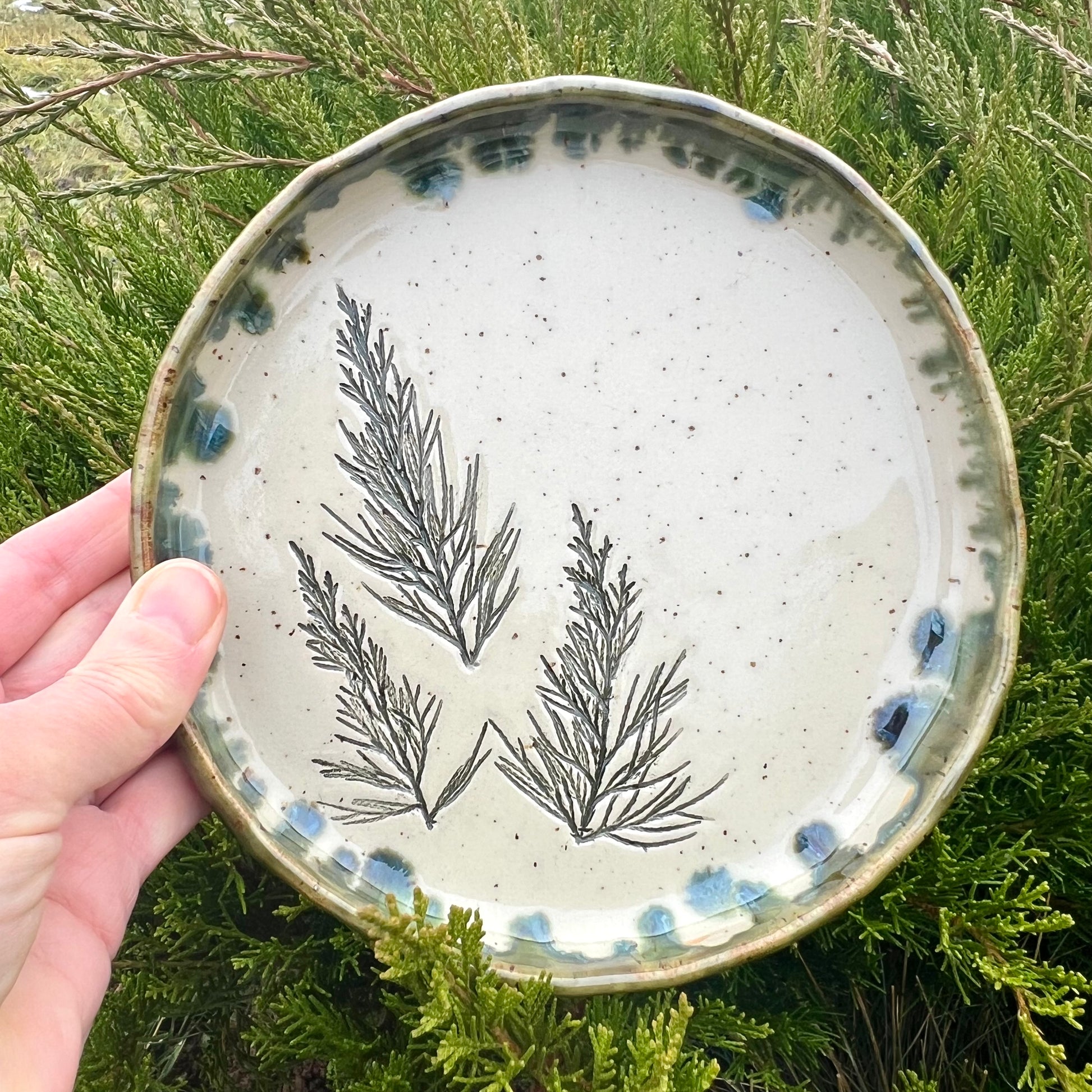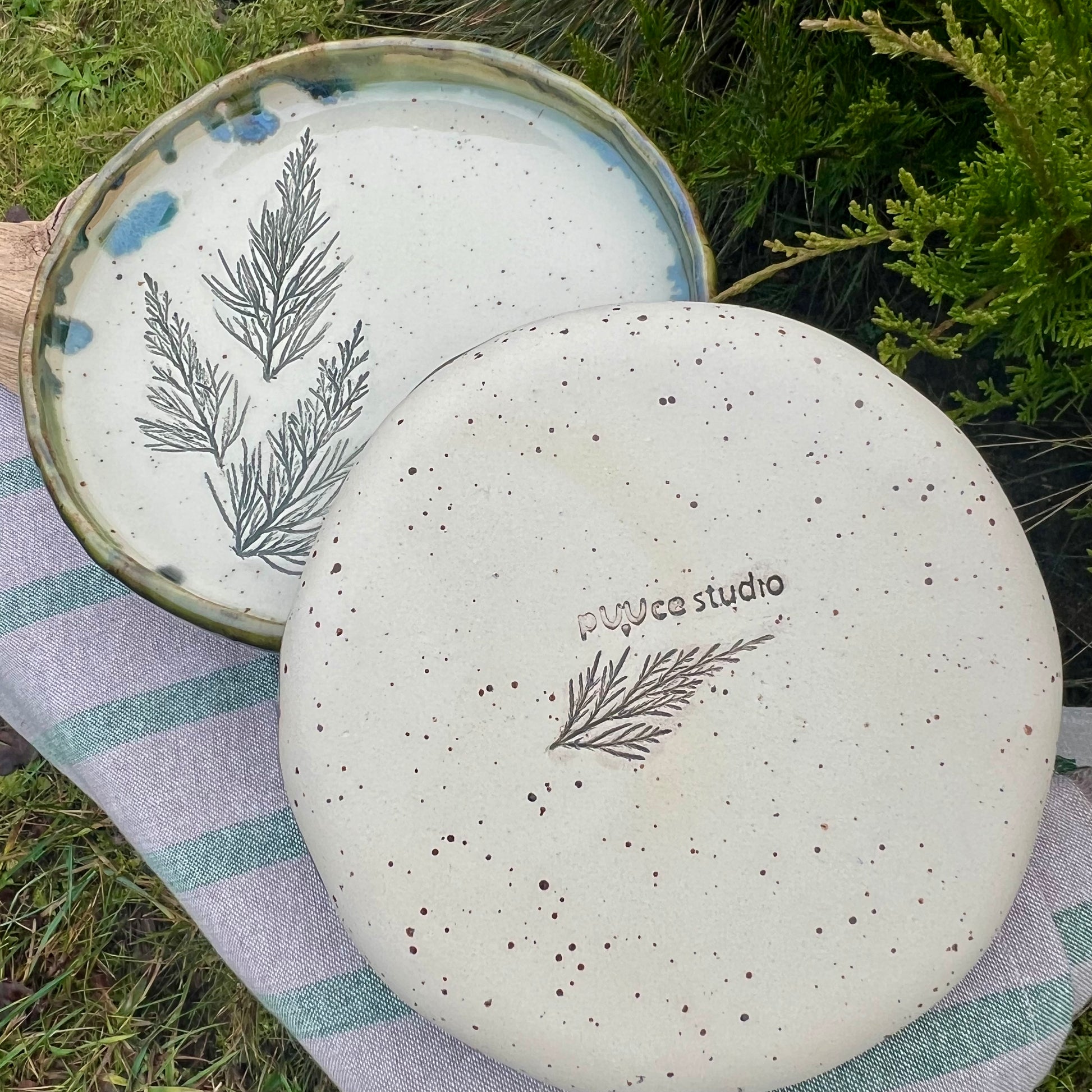 Šķīvis rotāts ar kadiķa zariņiem – dabas elementu, kas iemūžināts mālā.