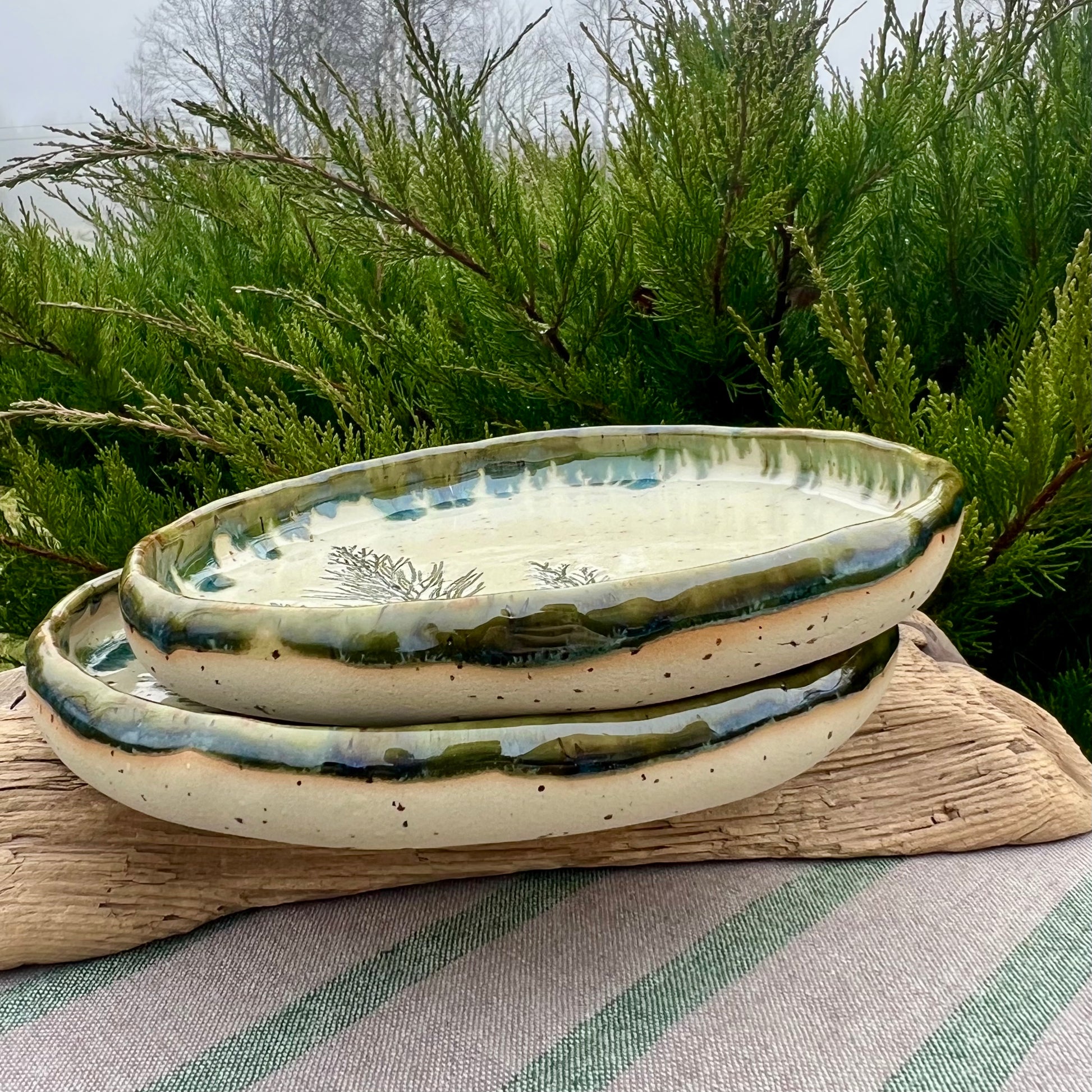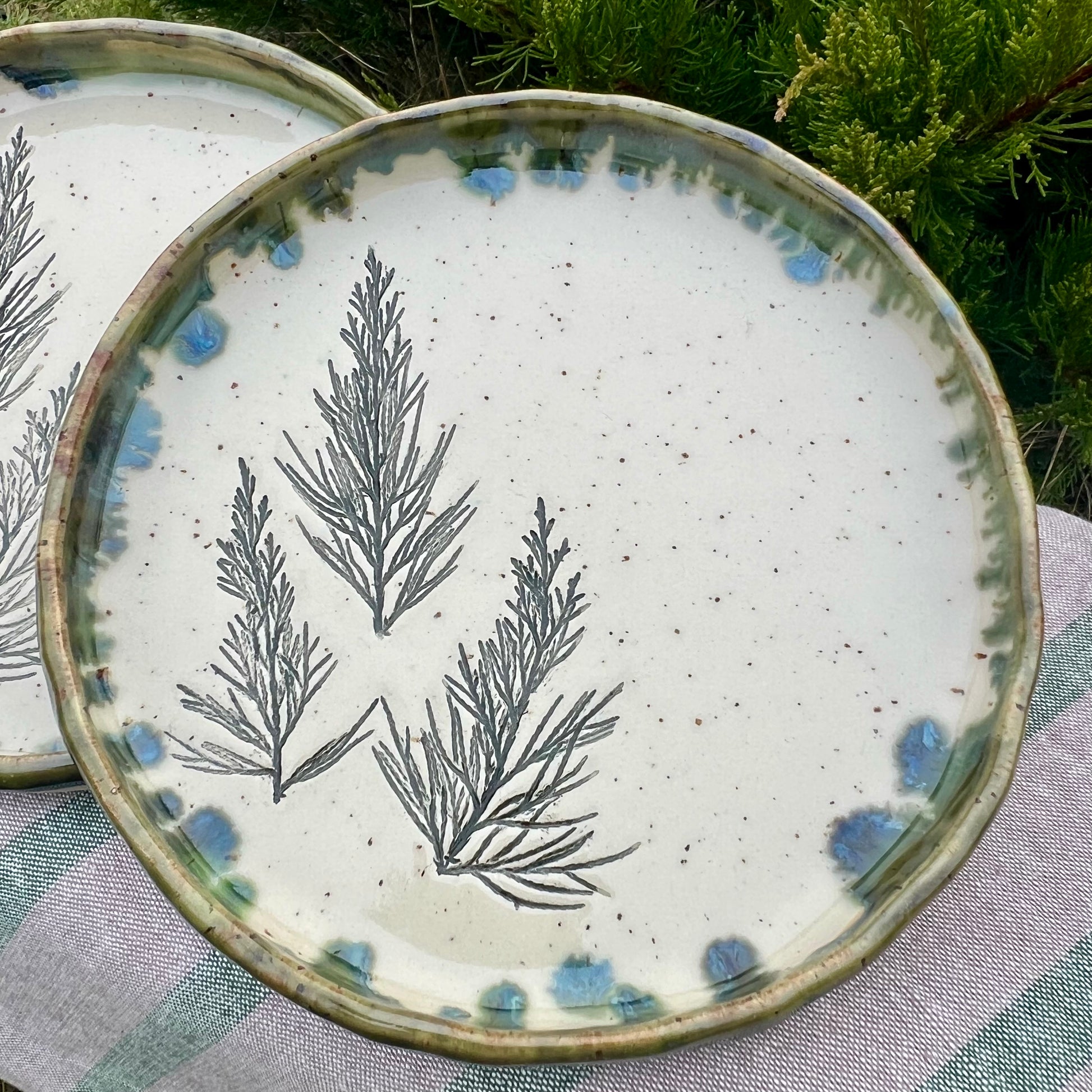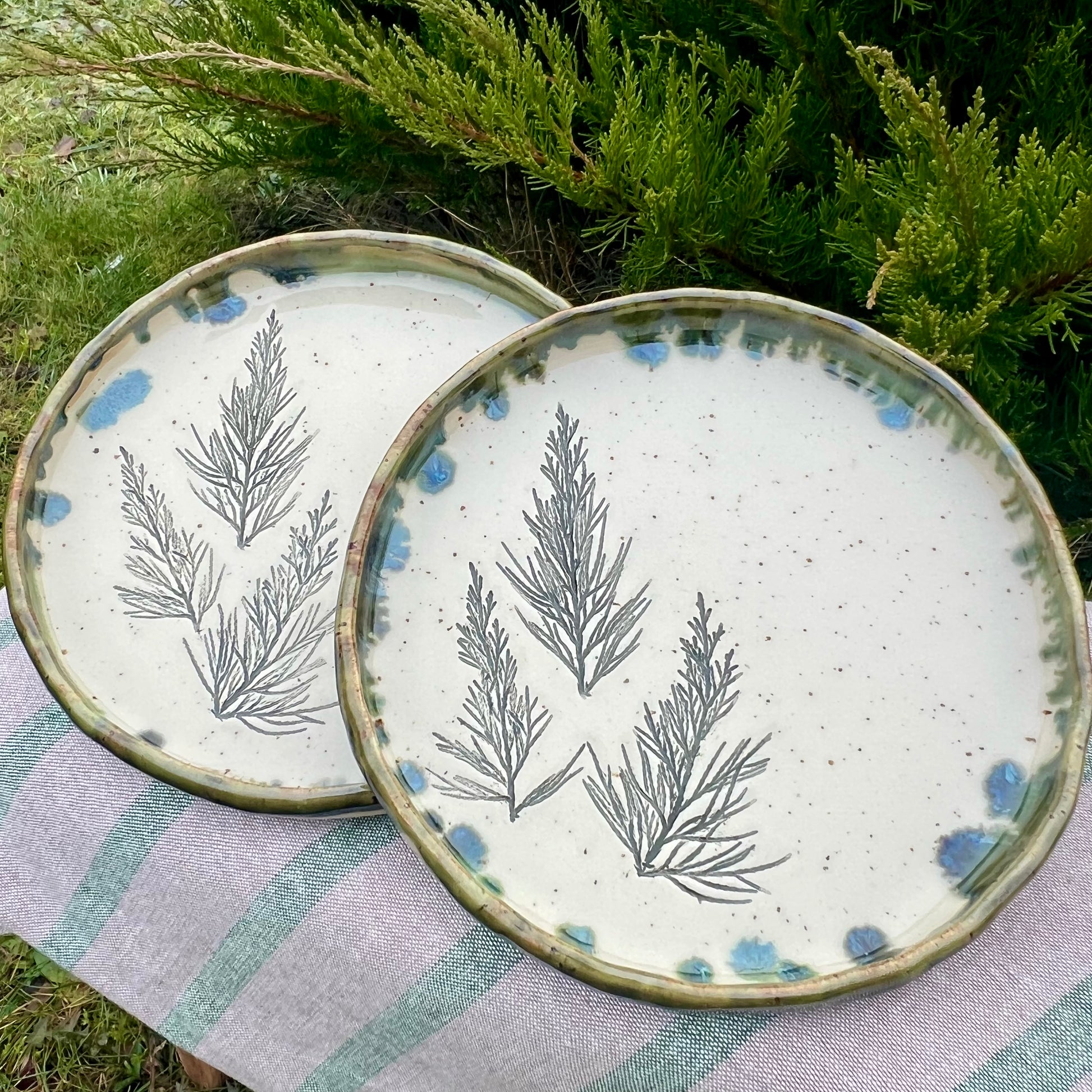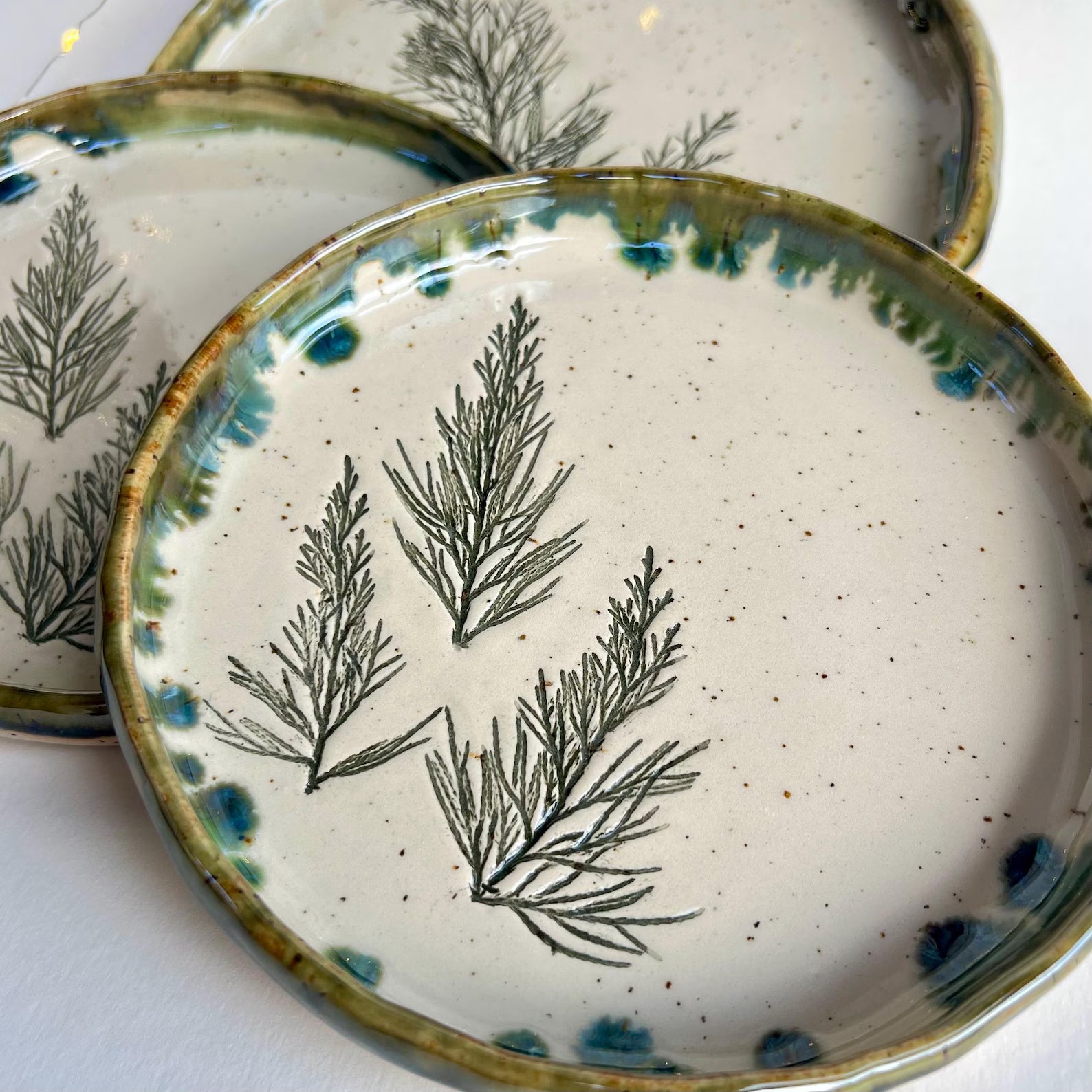 Šķīvis rotāts ar kadiķa zariņiem – dabas elementu, kas iemūžināts mālā.