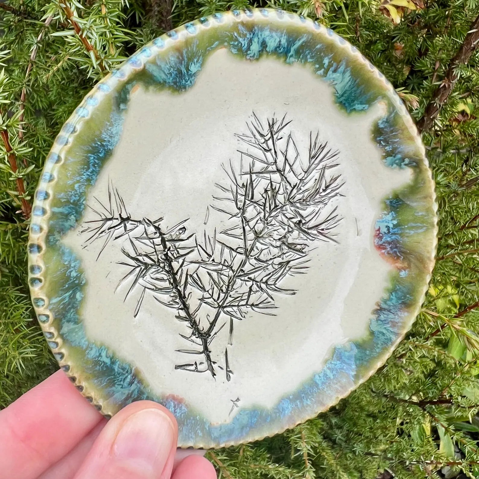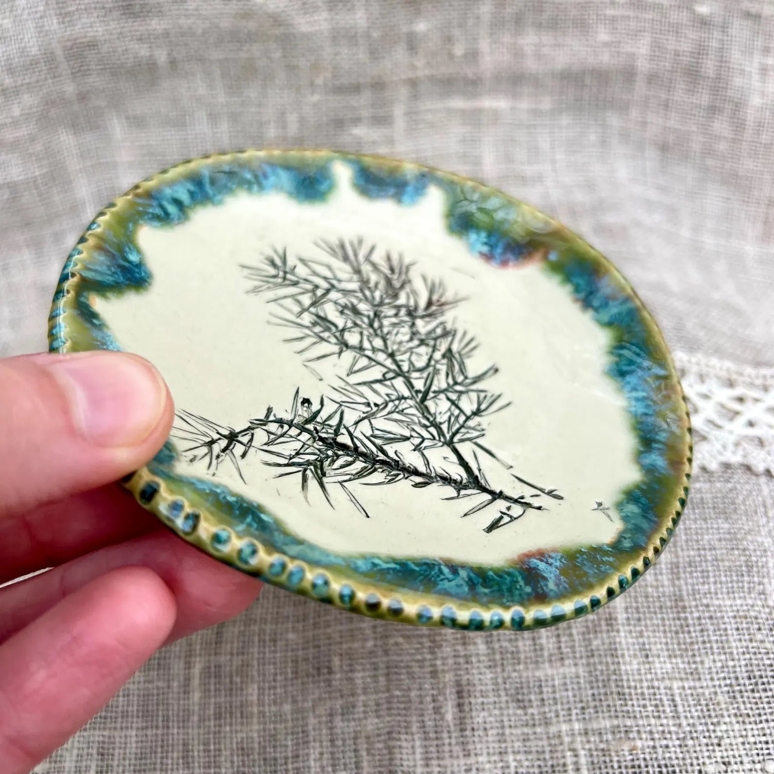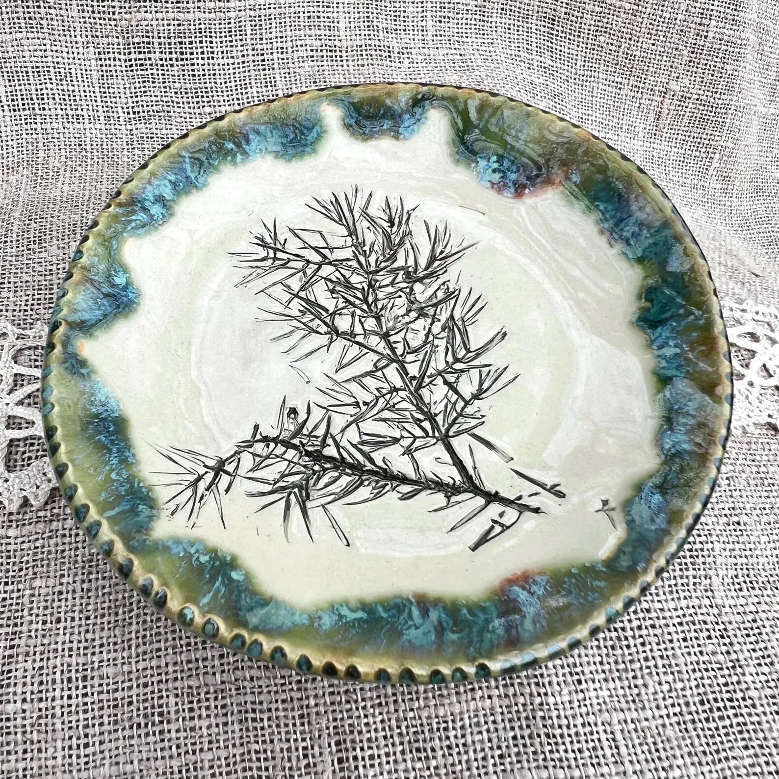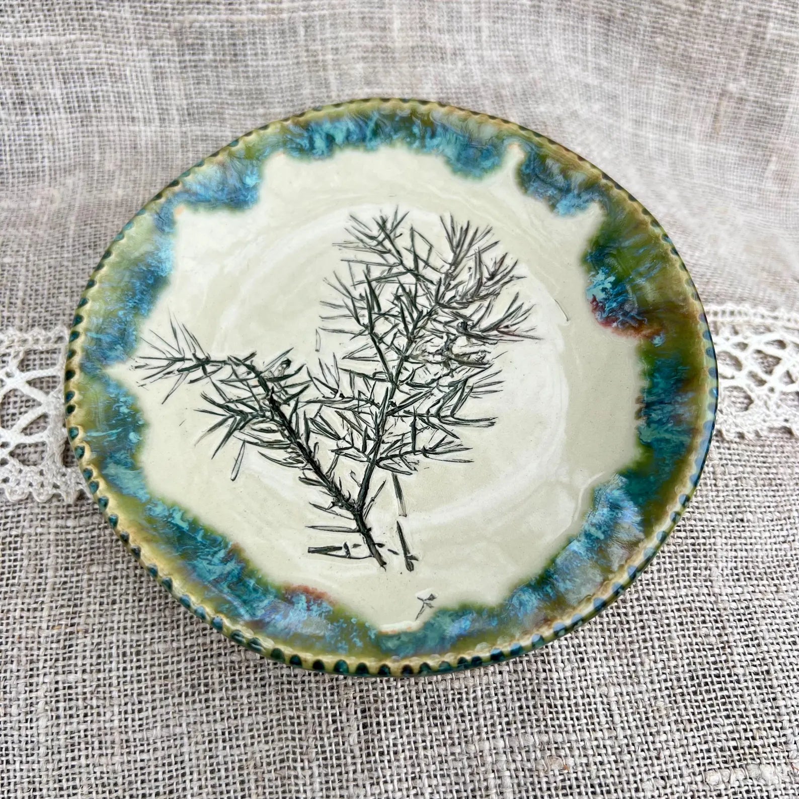 Šķīvīti rotā smalks, dabas iedvesmots paeglīša atspiedums. Pārklājums ar zaļām glazūrām piešķir tam atsvaidzinošu un dzīvespriecīgu noskaņu. Šis botāniskais motīvs kalpo kā unikāls dekoratīvs elements jūsu galdam.