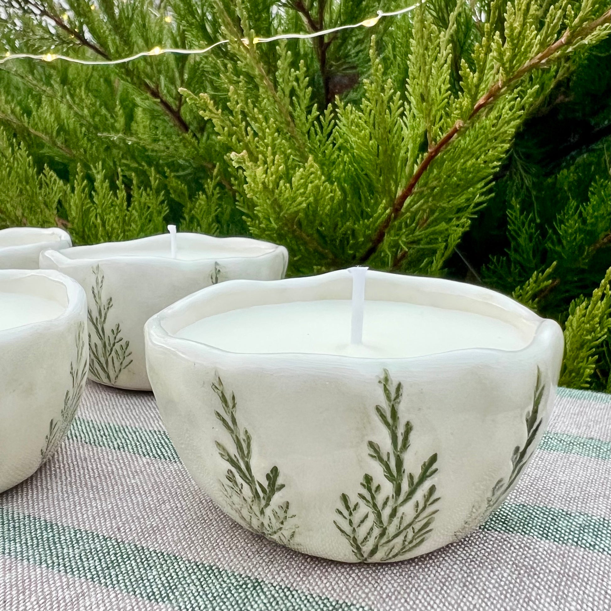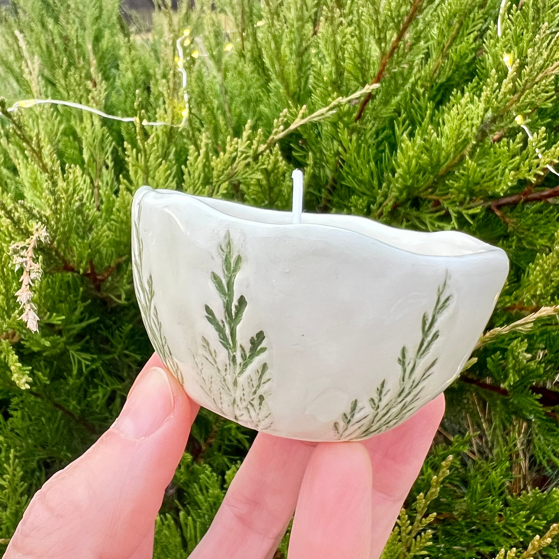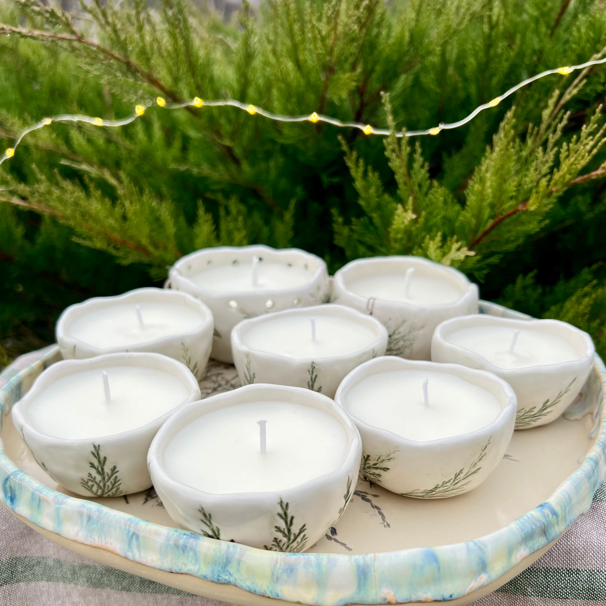 Sojas vaska svece mazā keramikas bļodiņā.