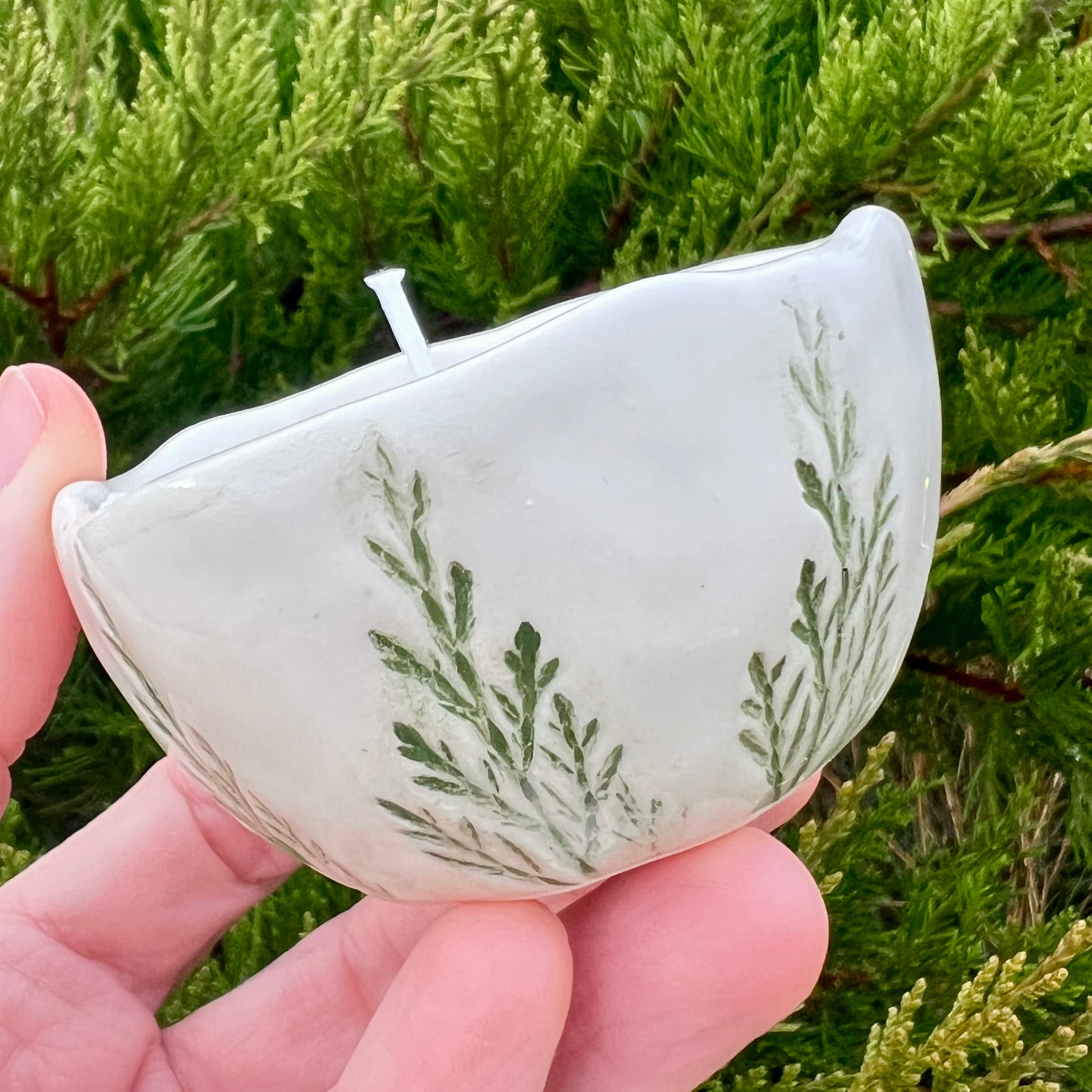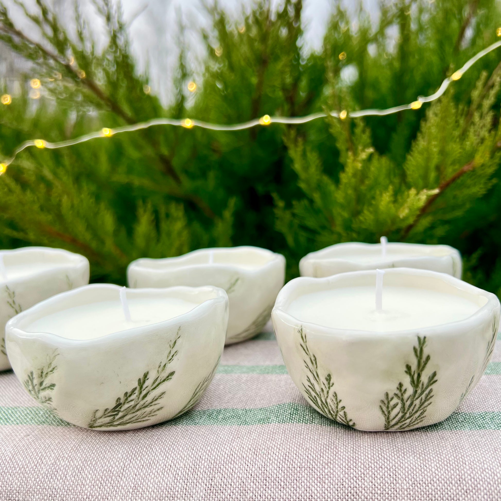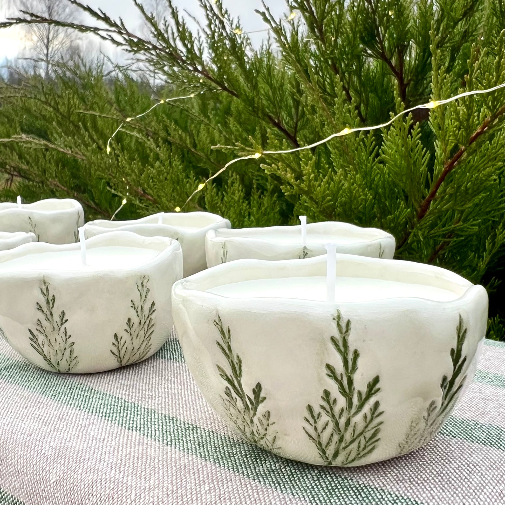 Sojas vaska svece mazā keramikas bļodiņā.