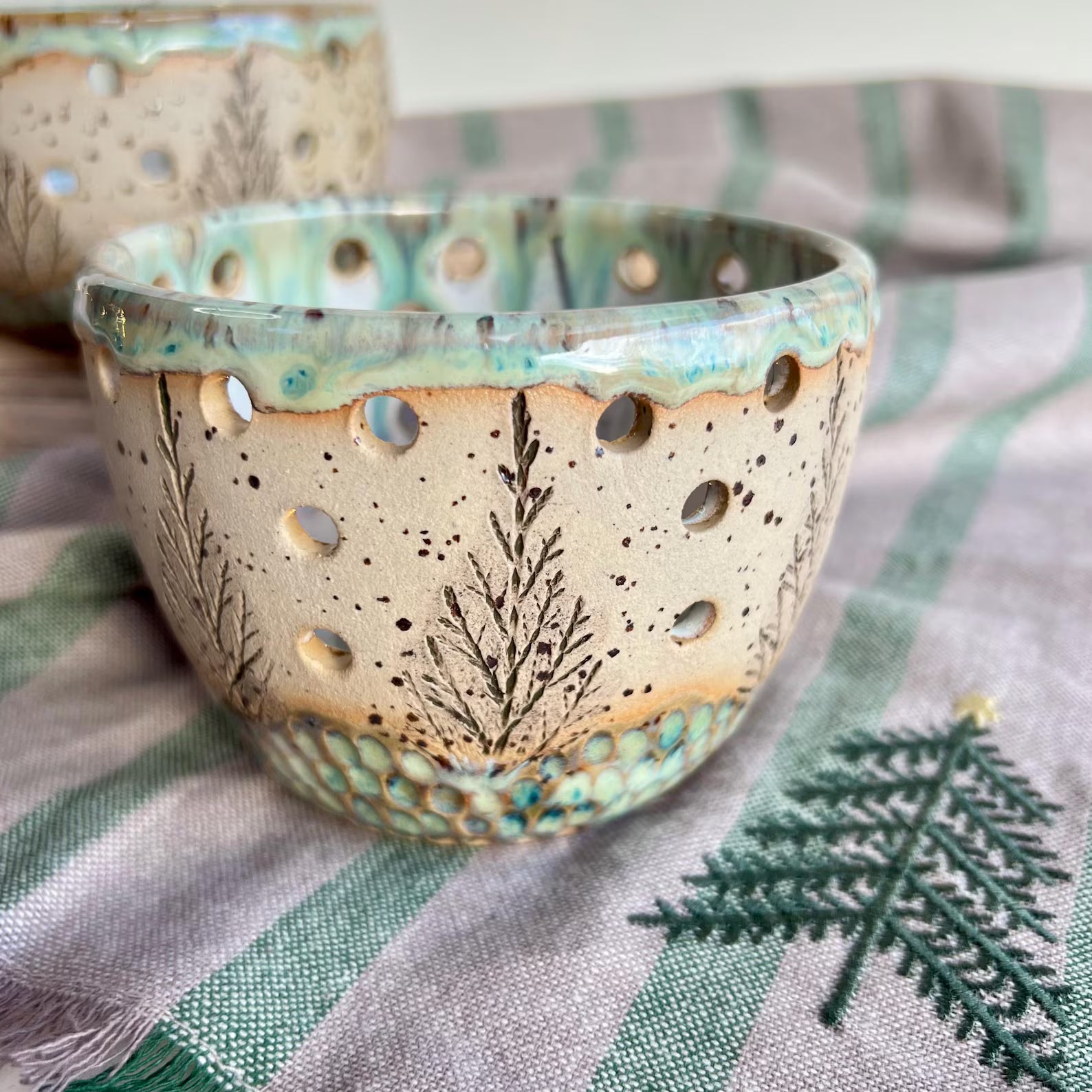 Šis trauks ir izgatavots no akmens masas, izgrebts un atspiesti kadiķa zariņi.