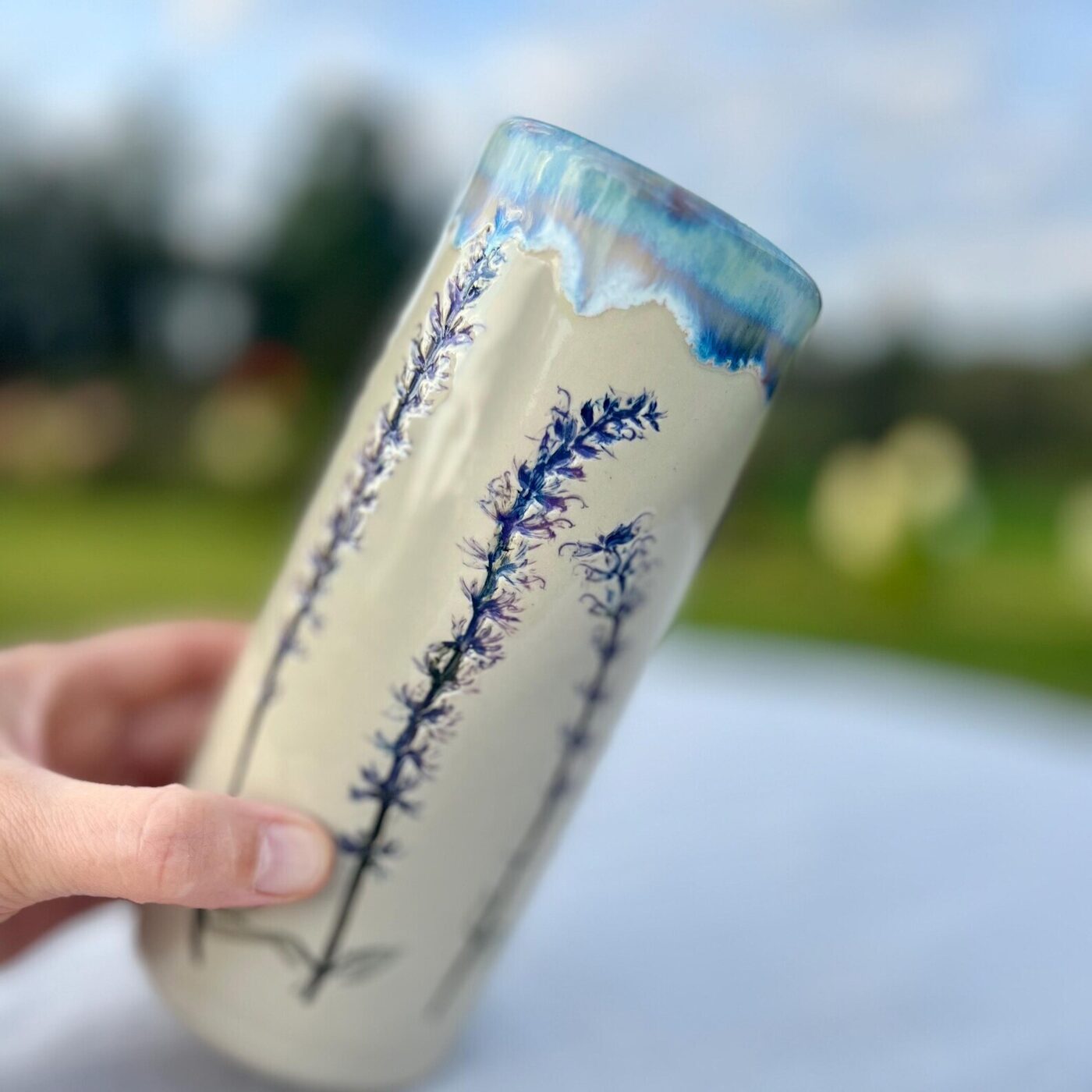 Dizains ietver unikālo pieeju – tiešus pļavas augu atspiedumus māla virsmā. Šī tehnika piešķir vāzei lauku šarmu un ienes interjerā autentisku, dabisku tekstūru.