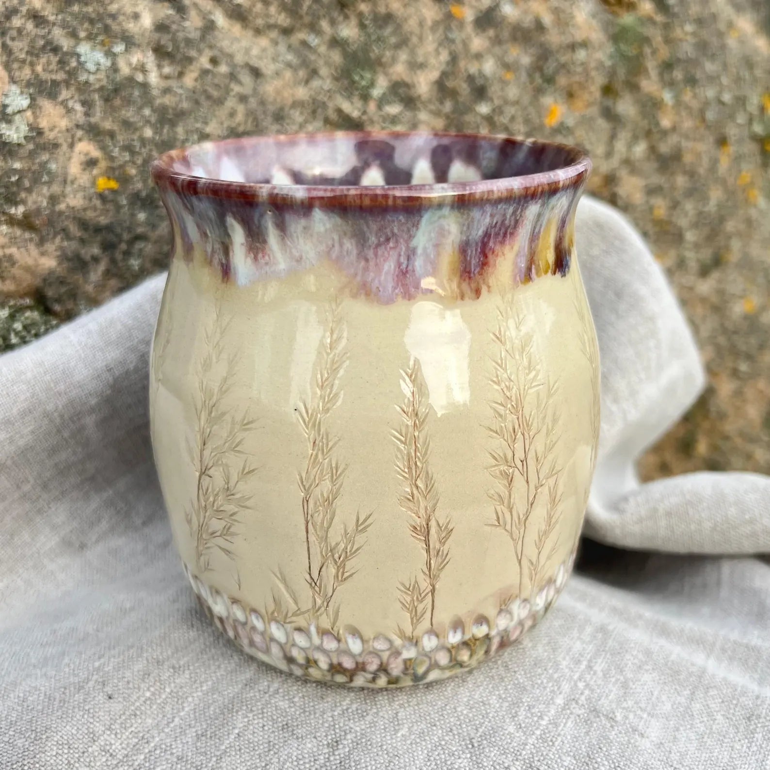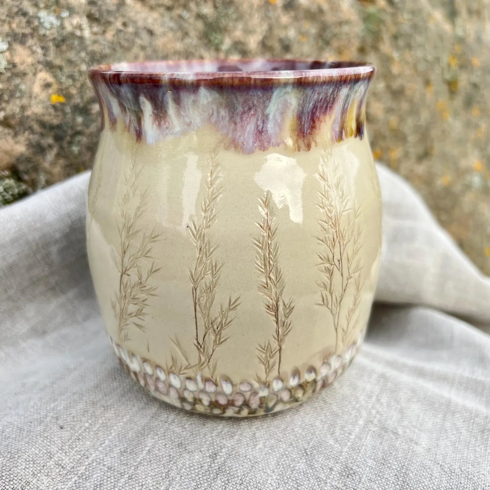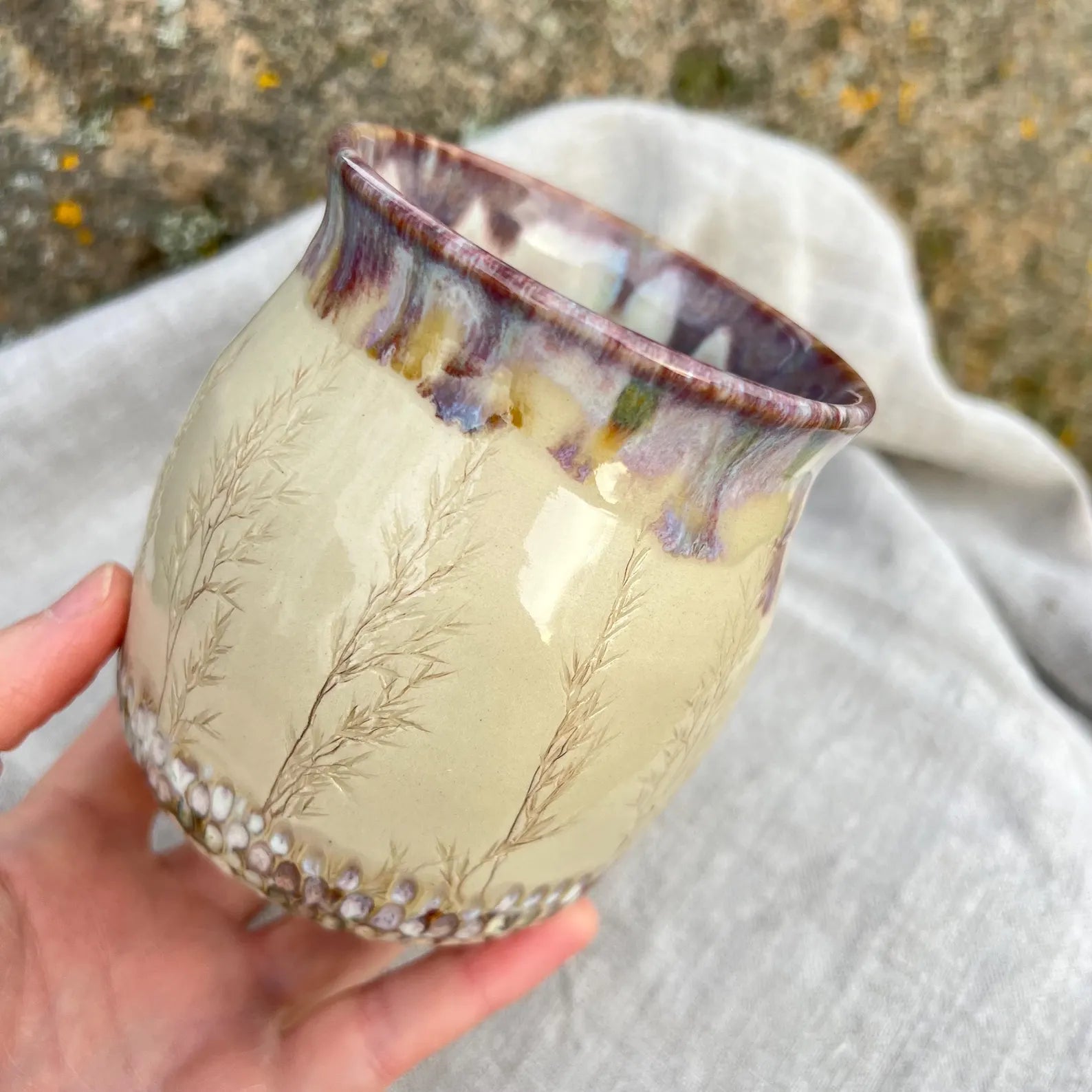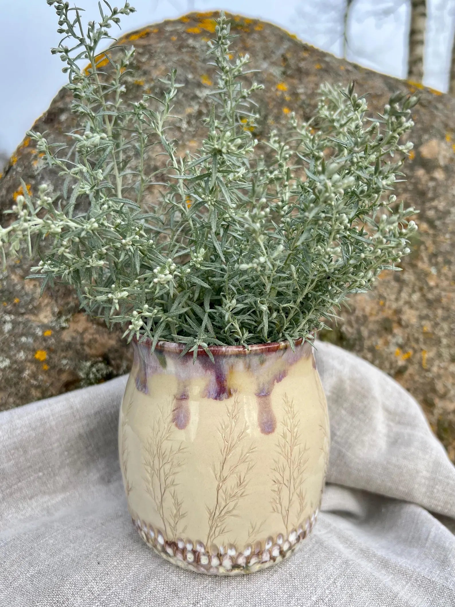 Dizains ietver unikālo pieeju – tiešus pļavas augu atspiedumus māla virsmā. Šī tehnika piešķir vāzei lauku šarmu un ienes interjerā autentisku, dabisku tekstūru.