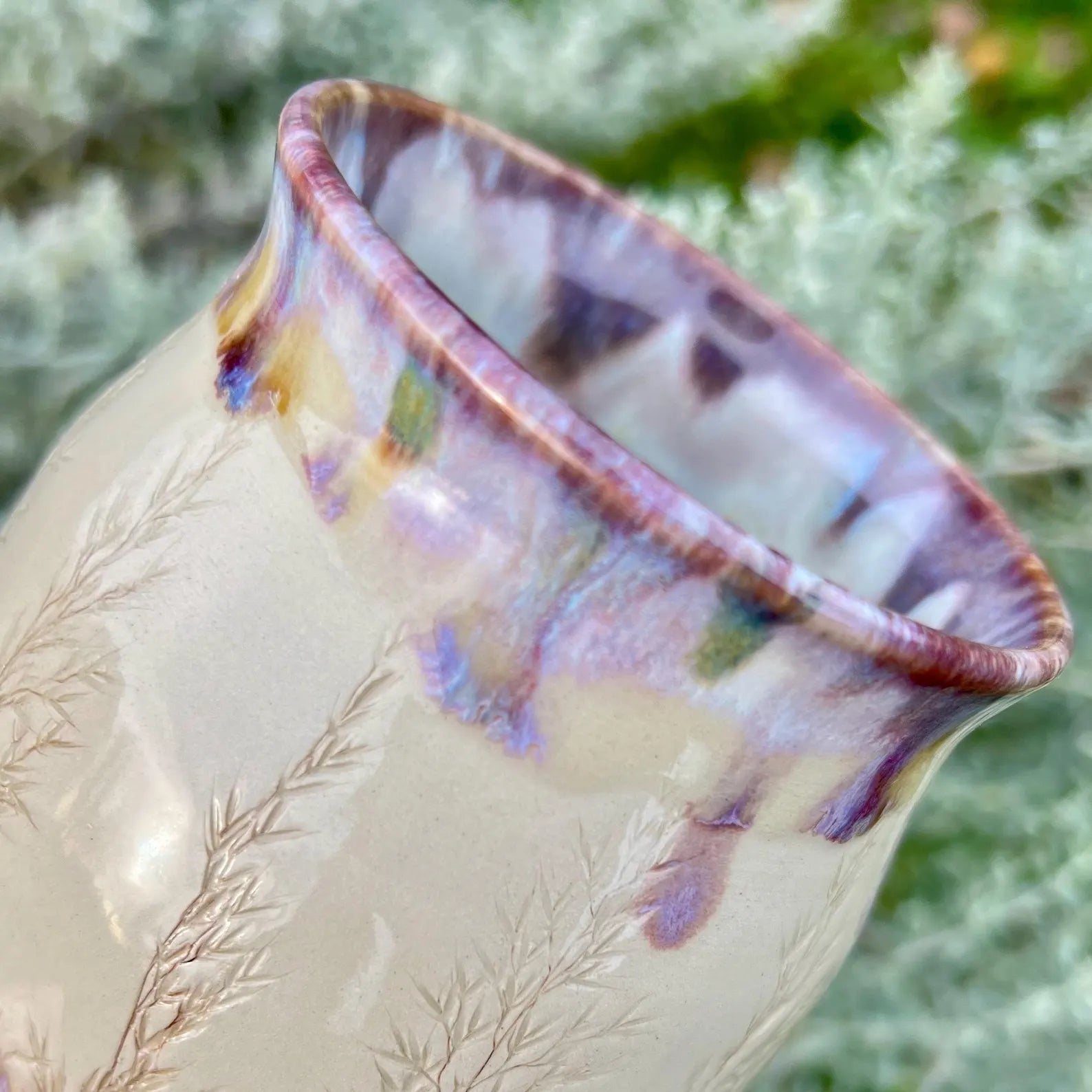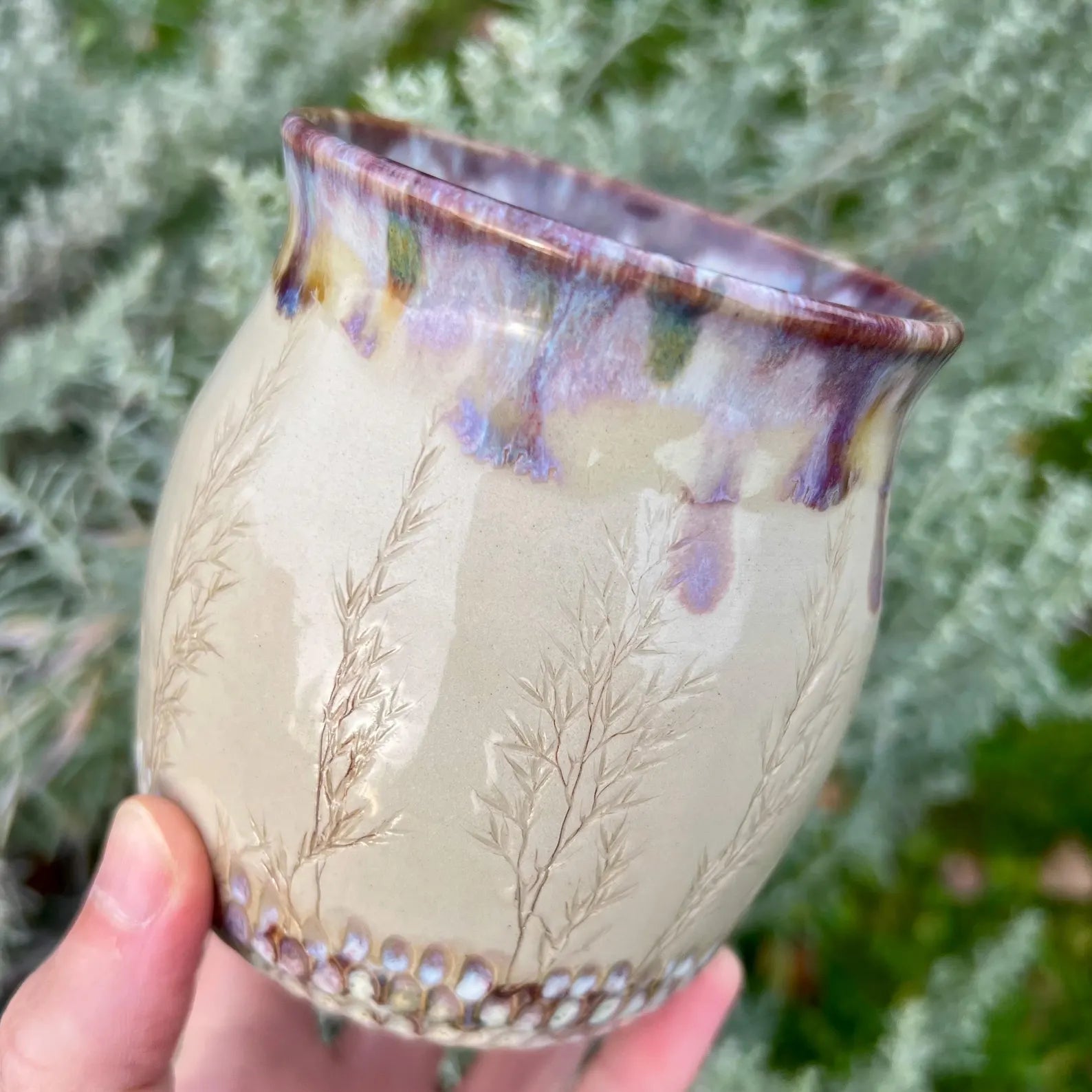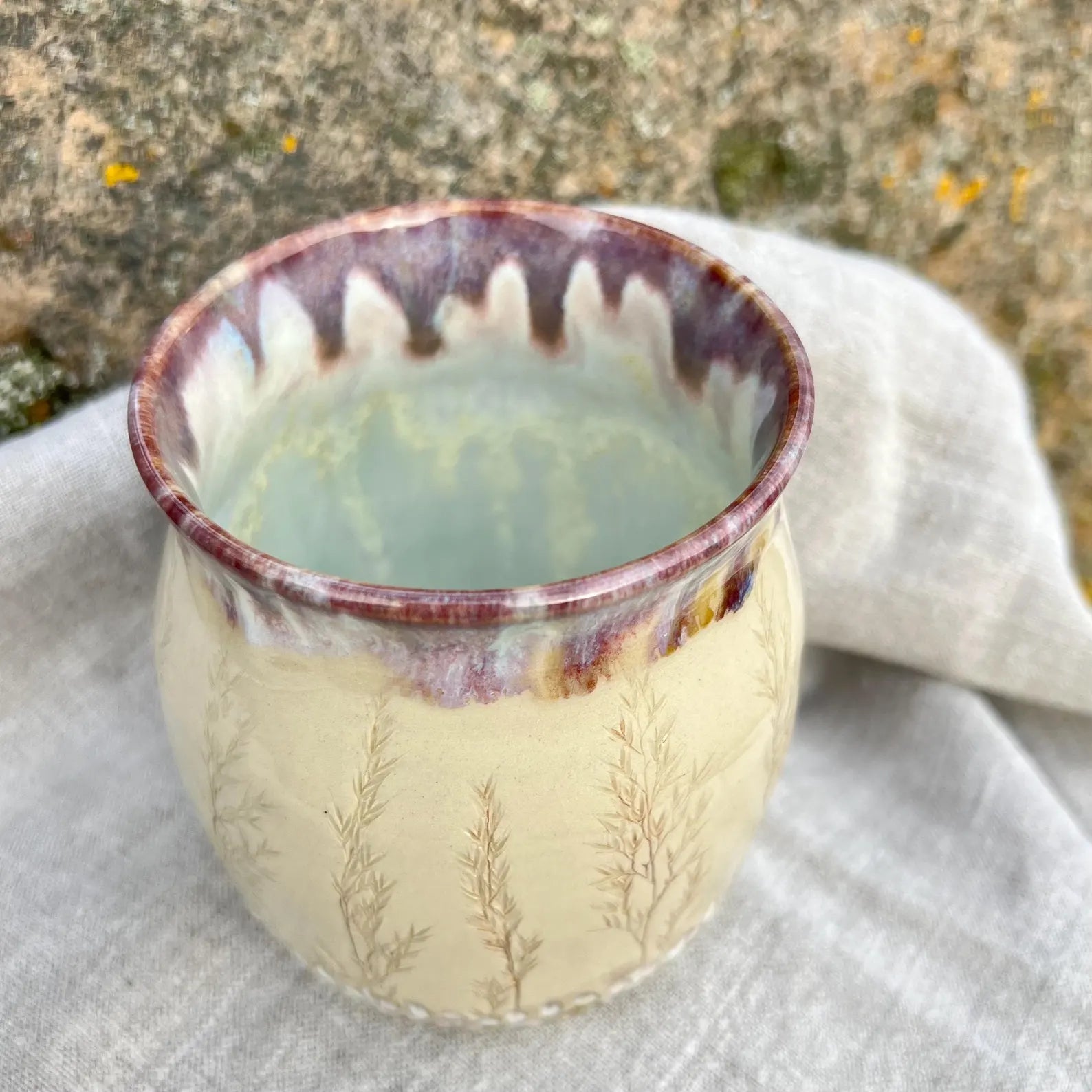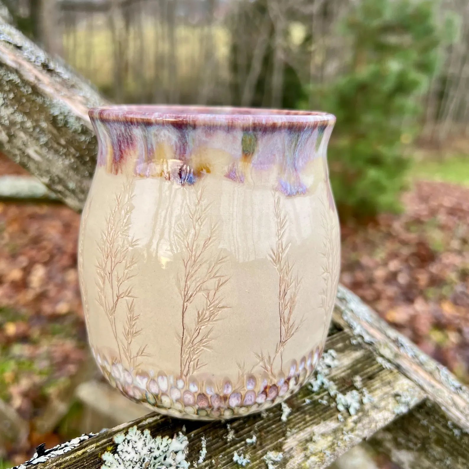 Dizains ietver unikālo pieeju – tiešus pļavas augu atspiedumus māla virsmā. Šī tehnika piešķir vāzei lauku šarmu un ienes interjerā autentisku, dabisku tekstūru.